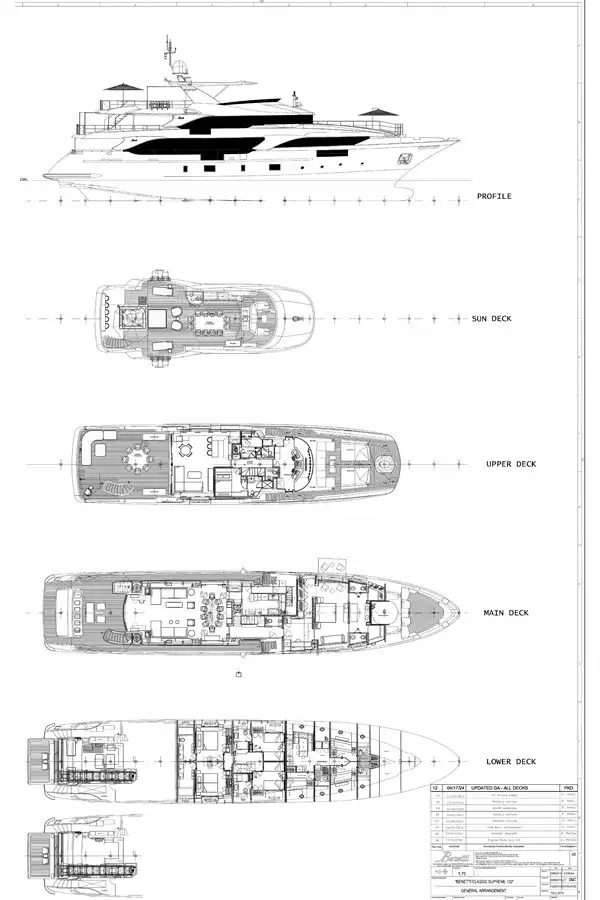 The essential theme is comfort and luxury, expressed through a generous use of space and natural light on the interior and large al fresco dining areas on the exterior. Like all Benetti yachts, PATIENCE has wide and safe walk-around teak decks on all deck surfaces. The focus of the sun deck is the large, rectangle table that can accommodate all 10 guests. The deep seating on the main deck and bridge deck invites you to stretch out, relax, and take in the view. Sunbathing is always available with a removable canopy on the bridge deck. Formal dining is available on both the bridge deck and sun deck.