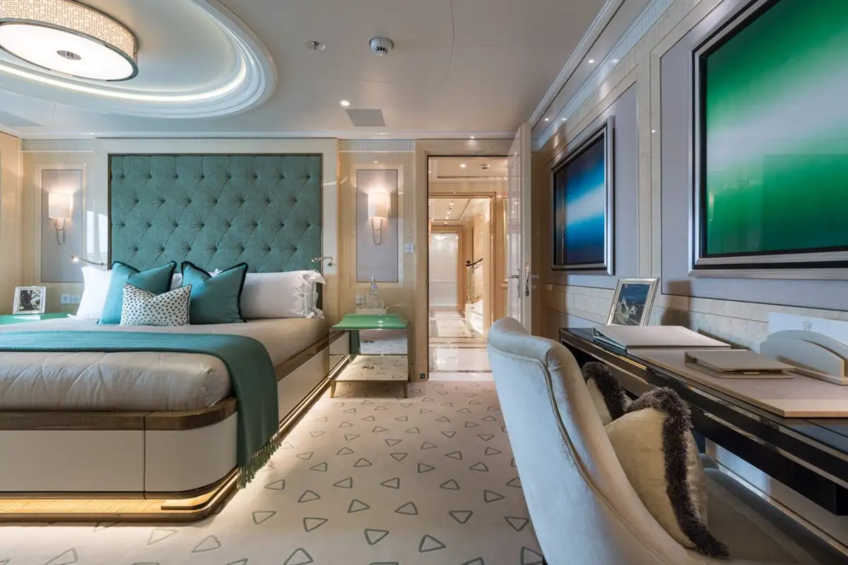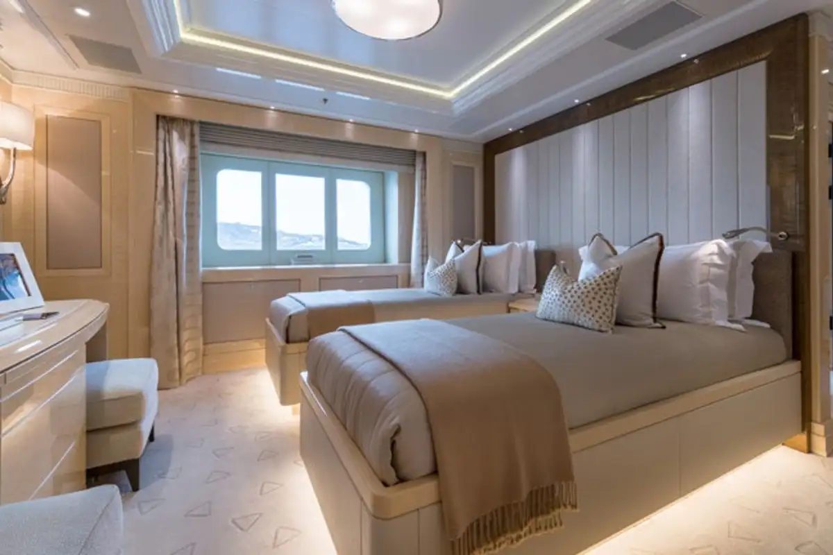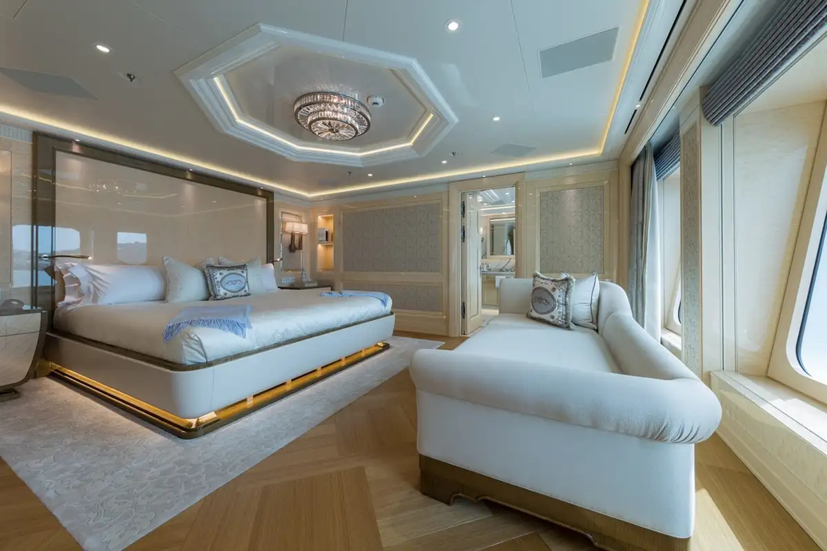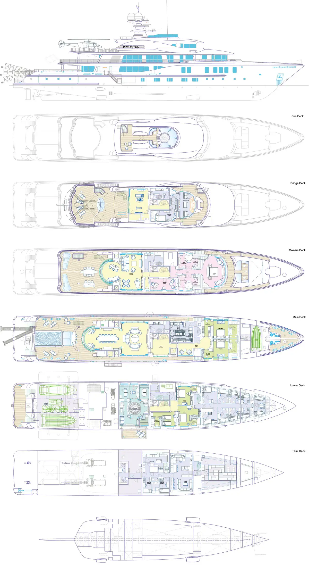 The yacht has a dedicated owner’s deck with forward facing owner’s suite - exquisitely crafted with Andrew Winch’s fresh take on Côte d'Azur grandeur. PLVS VLTRA has spacious accommodation for up to 12 guests in six suites and 19 crew.