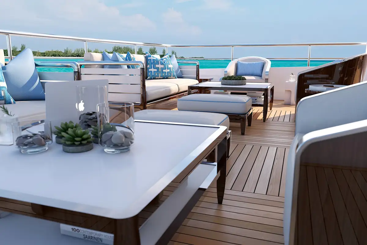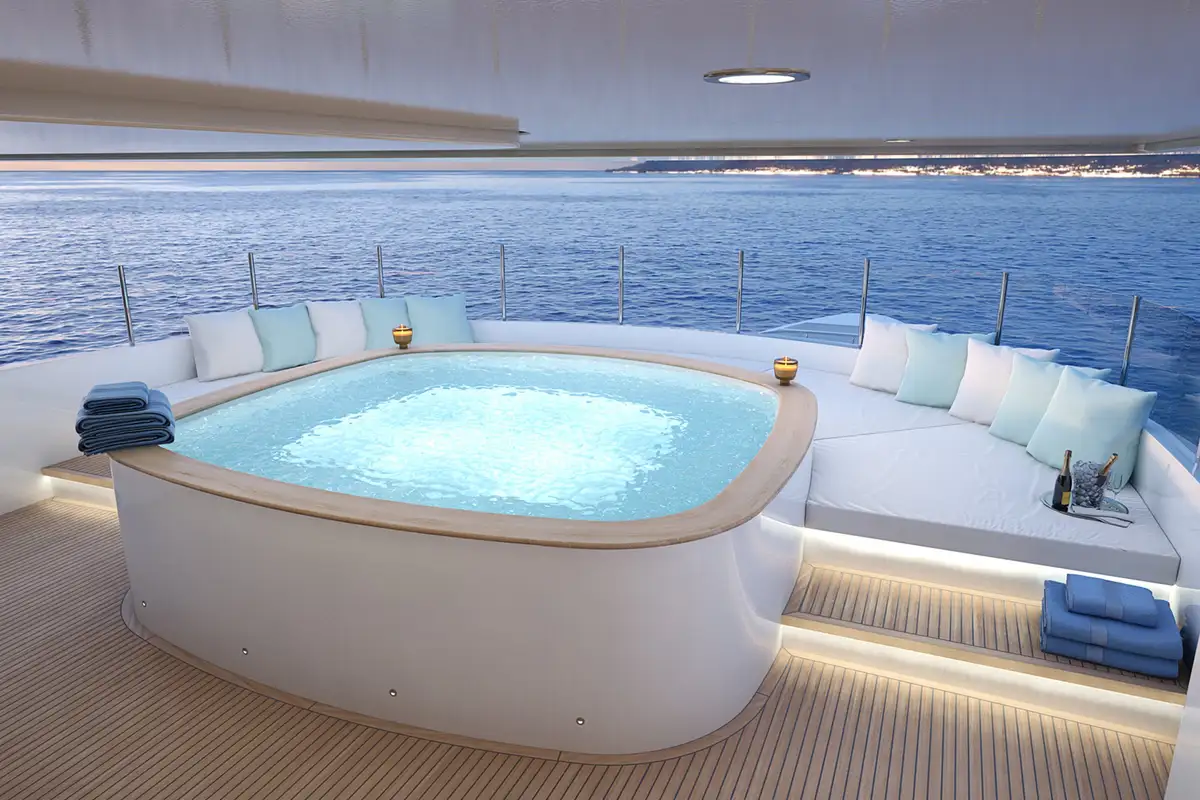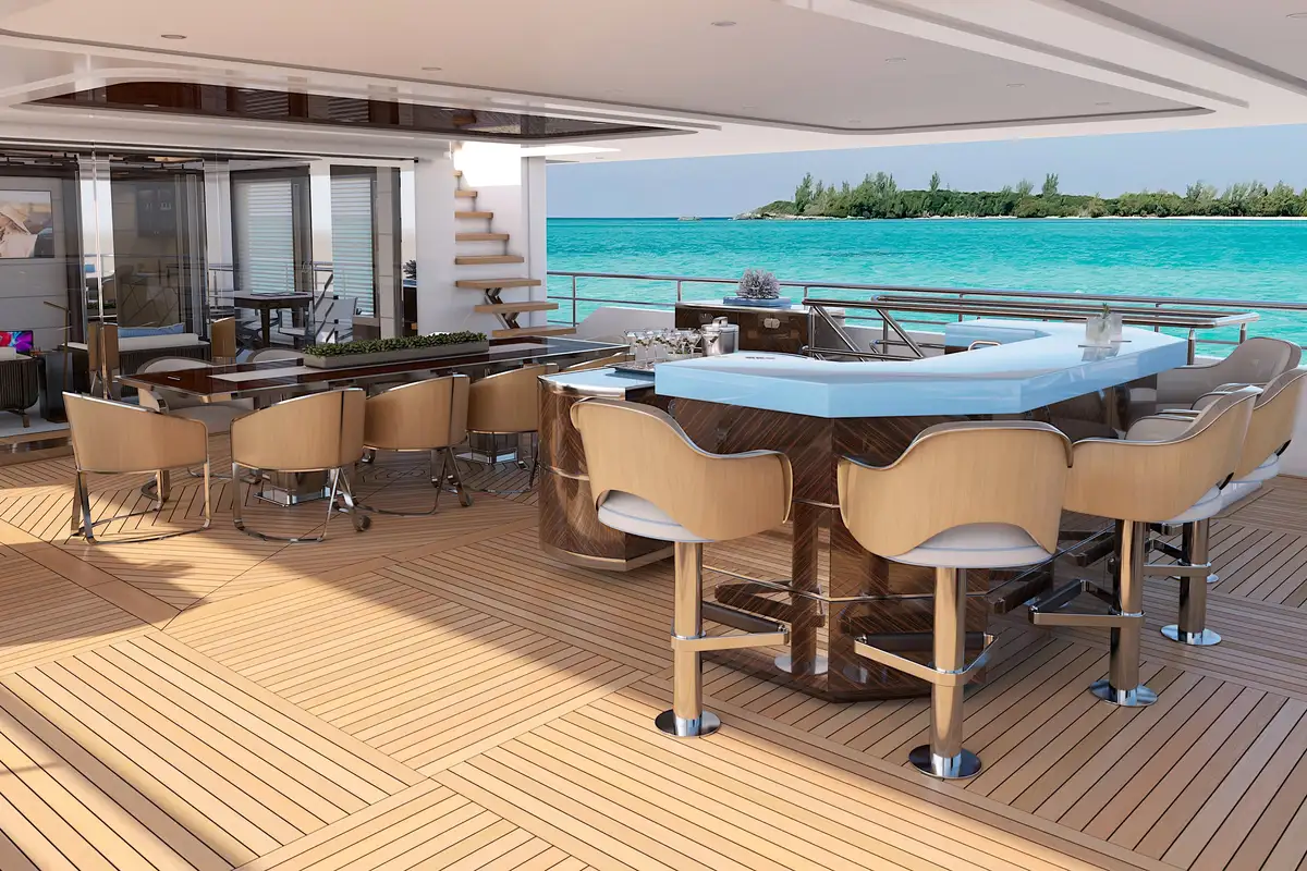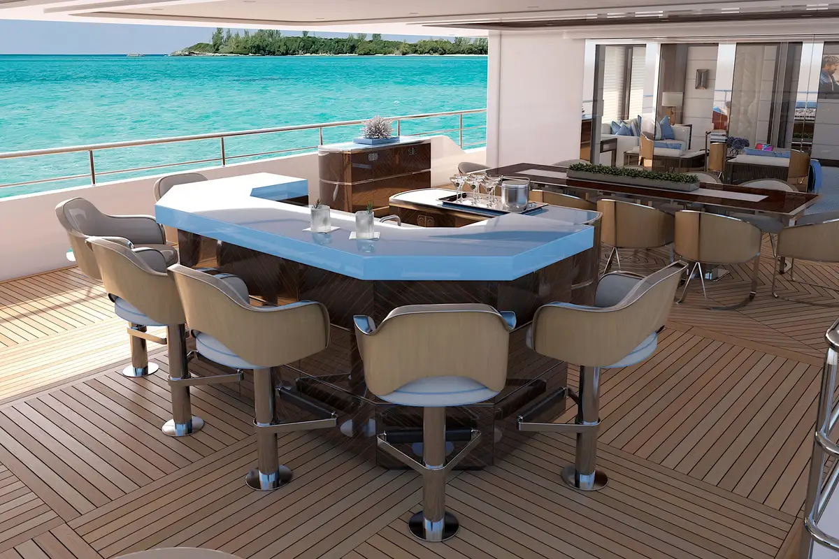 Entertainment and relaxation are paramount aboard PROJECT 515, with features such as the large aft deck Winter Garden, perfect for intimate dining experiences. The Infinity Deck aft, complete with a pool, provides easy access to the sea and offers expansive views of the surrounding landscape.