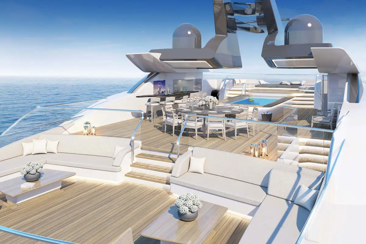 The owner's deck offers huge opportunities for personalisation. The owner's stateroom, with study and breakfast area, can be forward below a vast skylight with access to a private lounge area and terrace on the foredeck, which is also a touch and go helipad. Aft is a sky lounge with bar opening onto a large private terrace aft. A second option has the owner's stateroom facing overlooking a private terrace, forward is an observation lounge with formal dining and a study that can be closed off. The foredeck has the same lounge, terrace and helipad configuration.