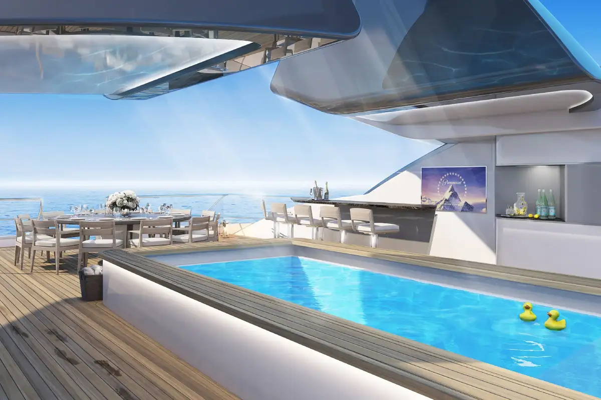 - Huge split level sun deck with large pool, bar, dining and lounging area