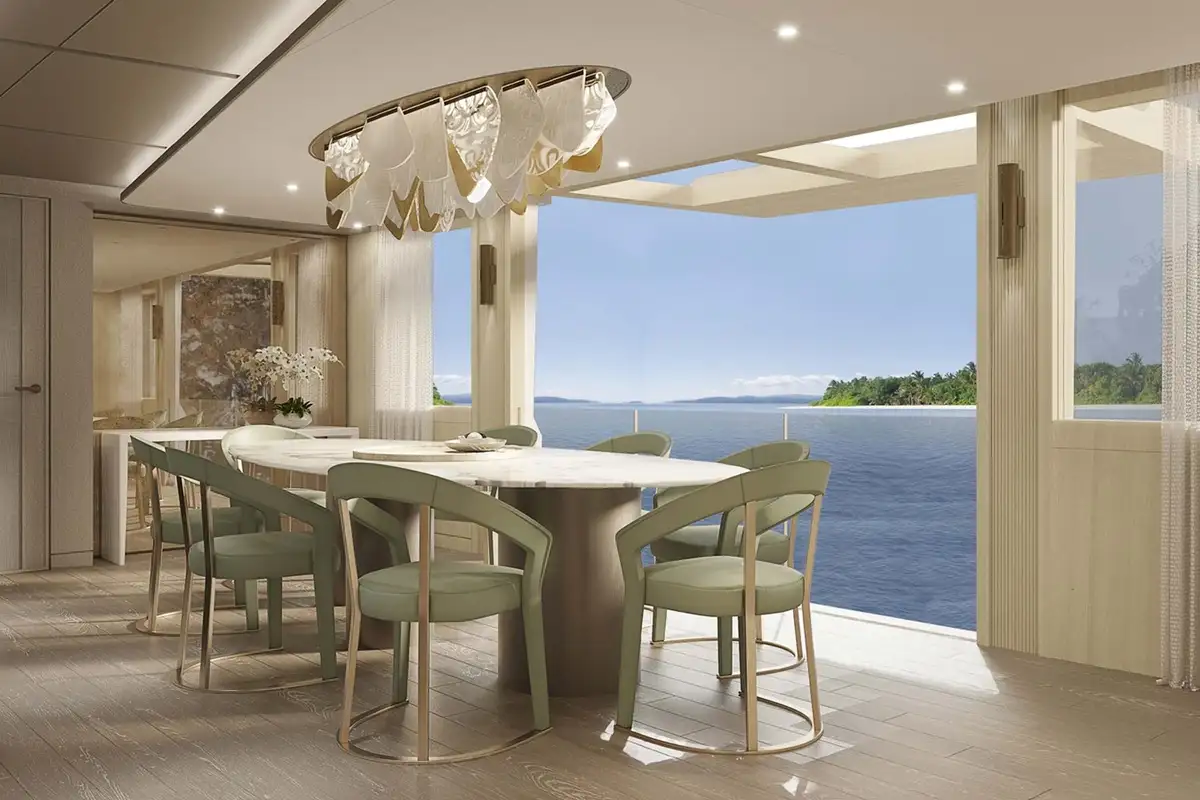 PROJECT SECRET challenges convention in many ways. Unlike most yachts in this size range, the dining room is not forward of the main saloon. It is water-side with a retractable electric panel that opens to create the full al fresco dining experience.