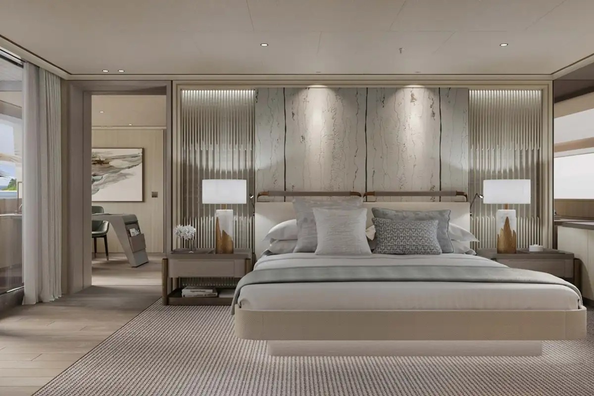 The lower deck features a full-beam VIP suite, as well as four additional guest suites, two double cabins and two twin cabins.