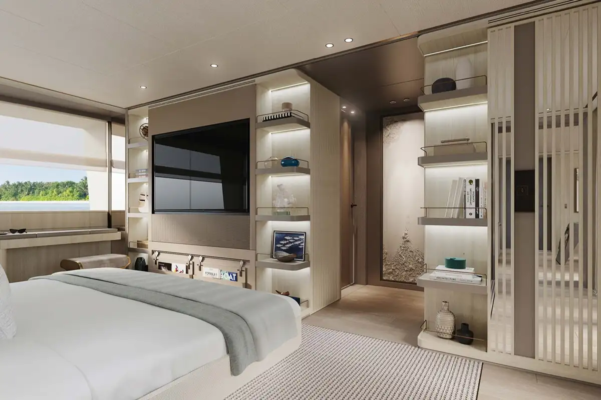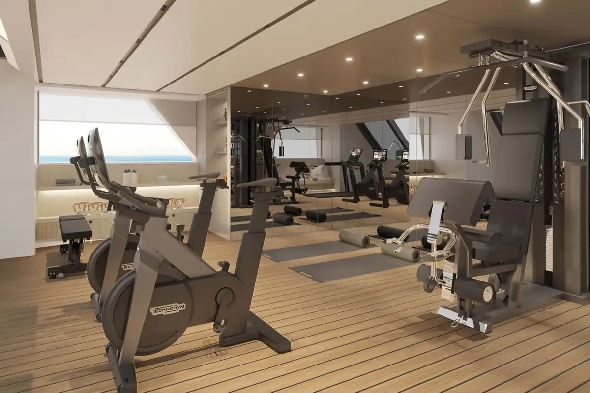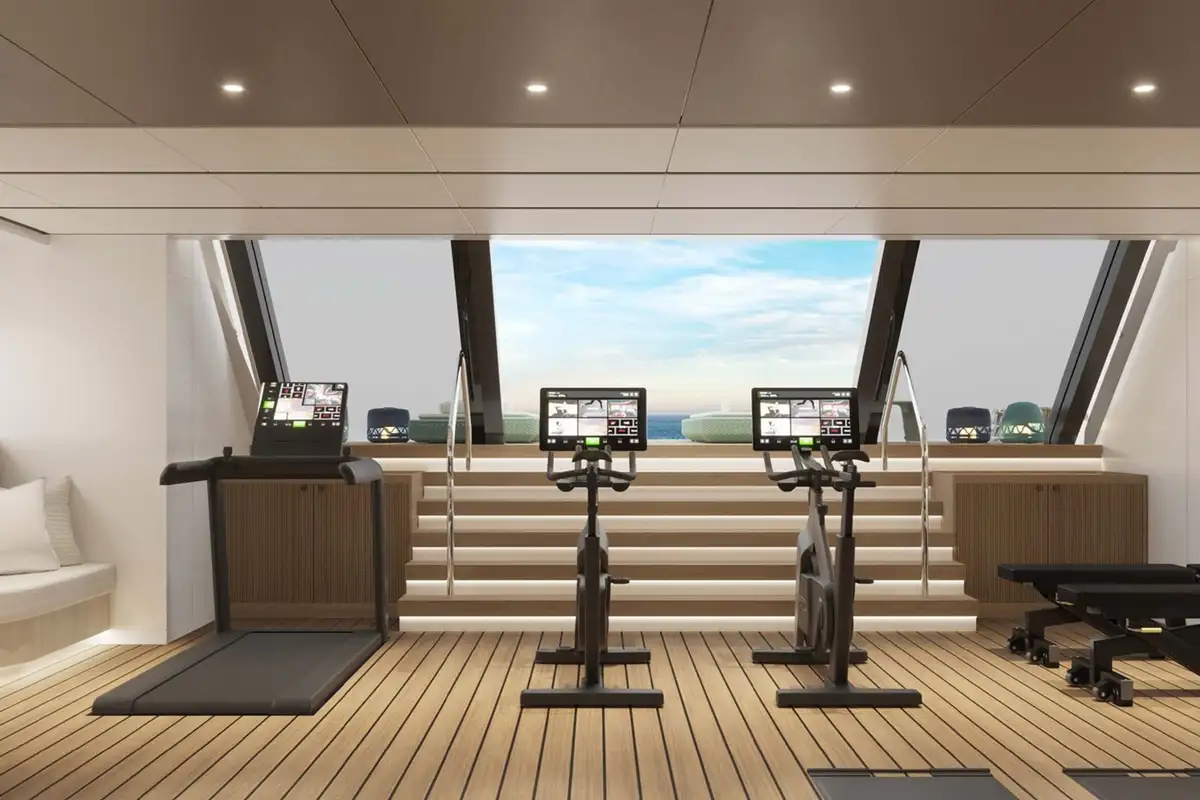 Aft on the lower deck, overlooking the swim platform’s pool through sliding darkened glass doors, is a full-beam gym and wellness area, complete with infrared sauna.