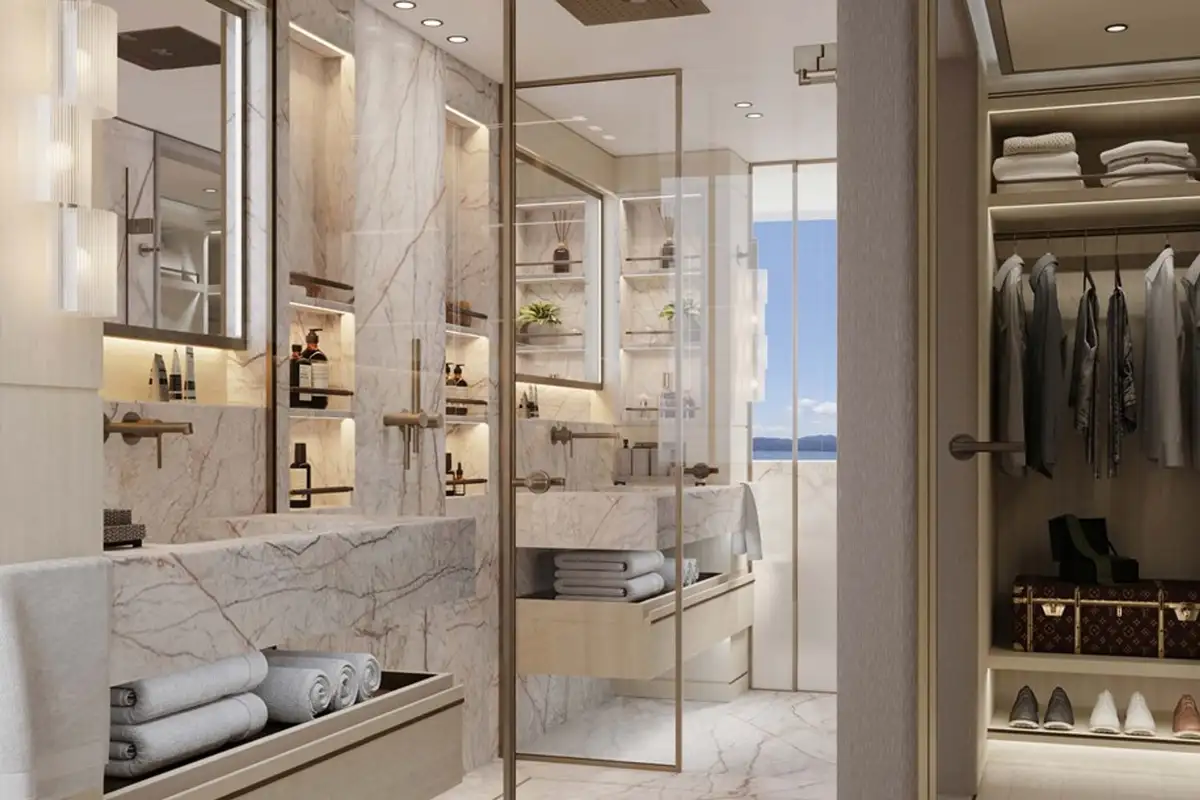 The sky lounge extends the entertainment capacity of the upper deck aft and it’s also a great place to watch movies and sports in air-conditioned comfort. She welcomes 12 guests in six cabins. The owner’s suite has a permanent private balcony behind sliding glass doors to let in the ocean air and light. It’s full beam with an office, walk-in wardrobe and his-and-hers en suite sharing a central shower room.