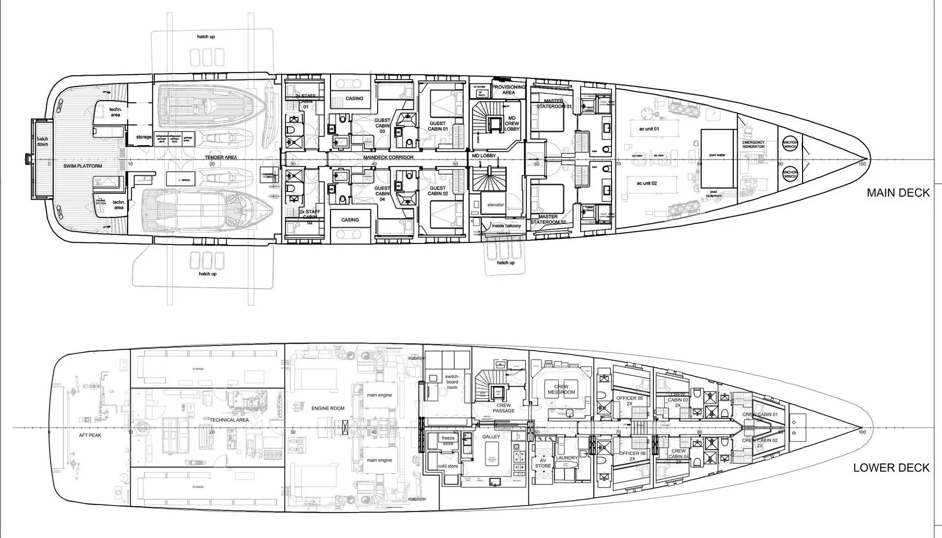 On the main deck, guest accommodation is thoughtfully arranged to offer both comfort and privacy. Aft, the spacious swim platform—with a hydraulic bulwark door—ensures easy access to the sea and her fully equipped tender garage. Below, the lower deck is dedicated to crew quarters and service areas, carefully configured to ensure efficient and unobtrusive operation.
