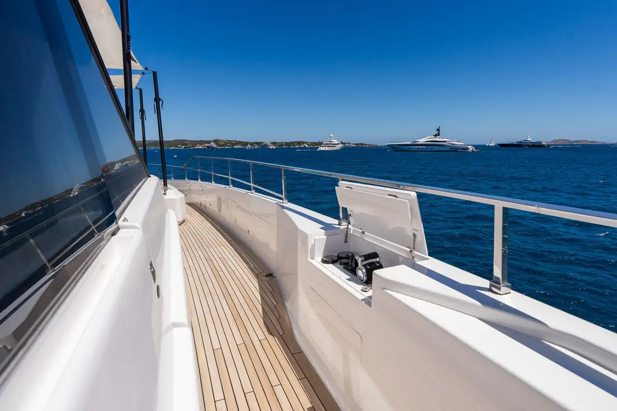 The naval architecture was developed by Ferretti Engineering Department, she is built with a Teak deck, a GRP hull, and GRP superstructure.