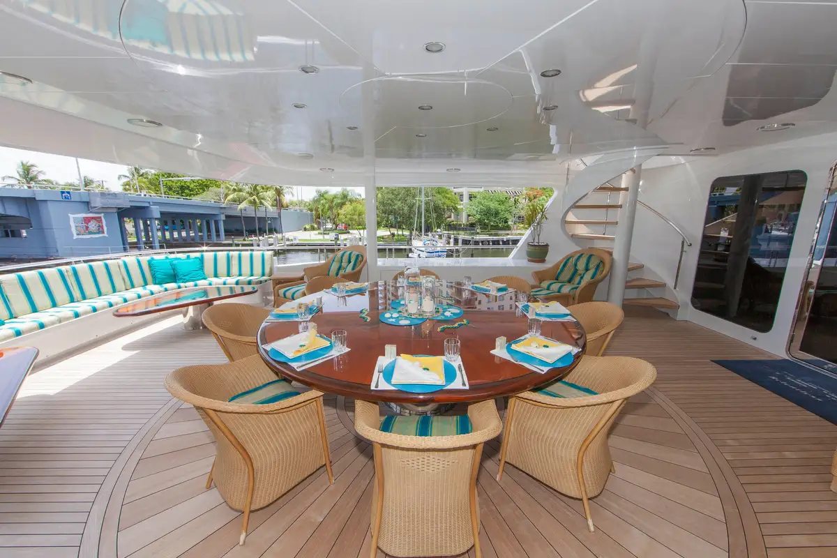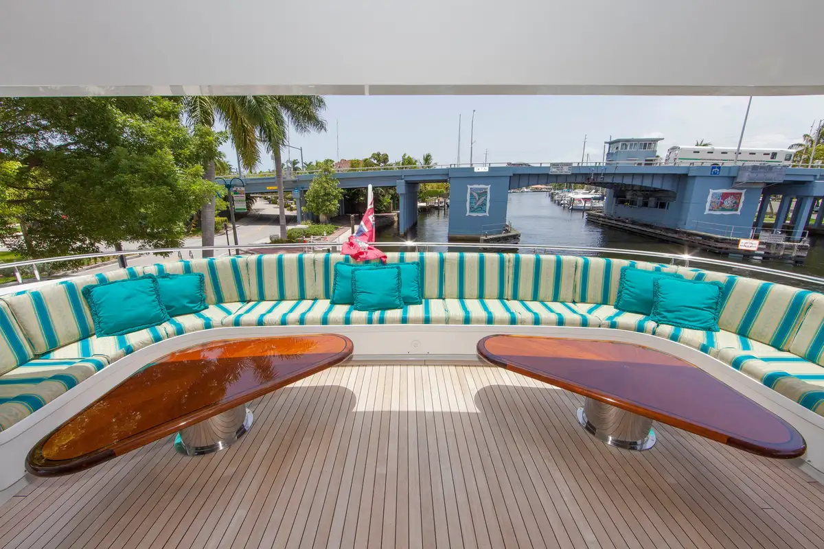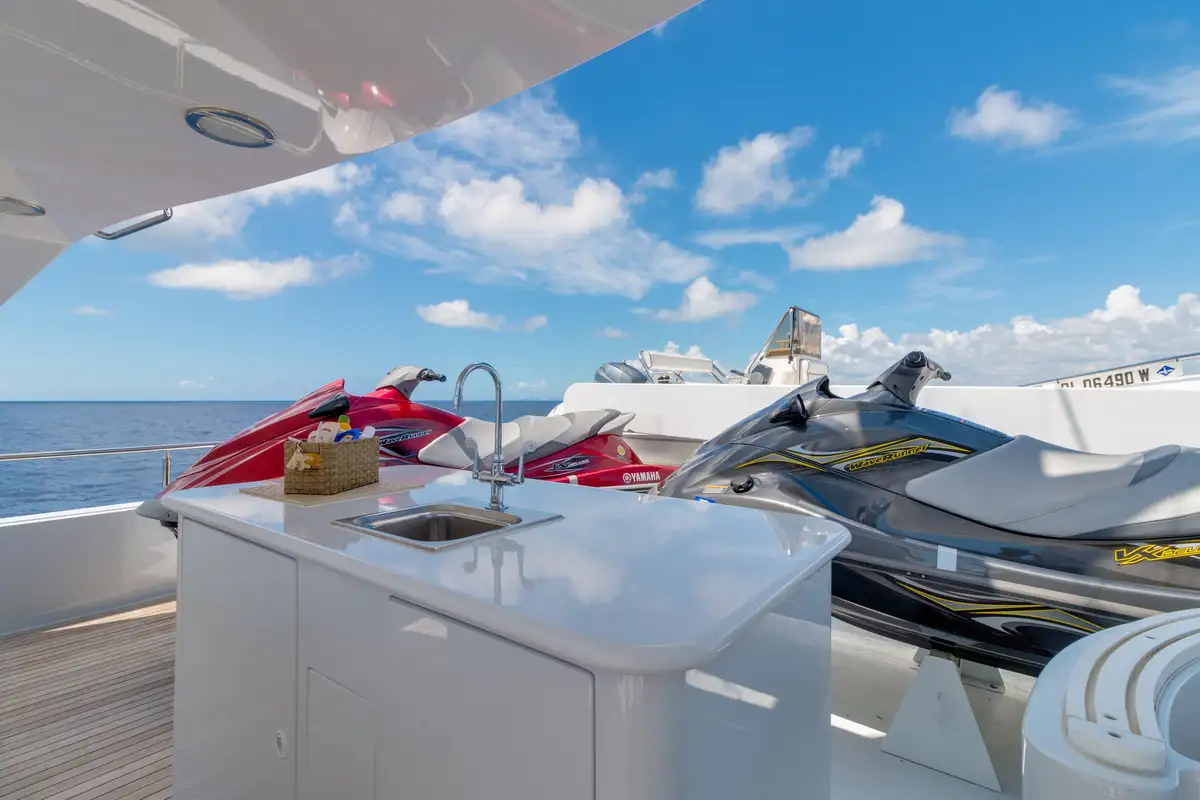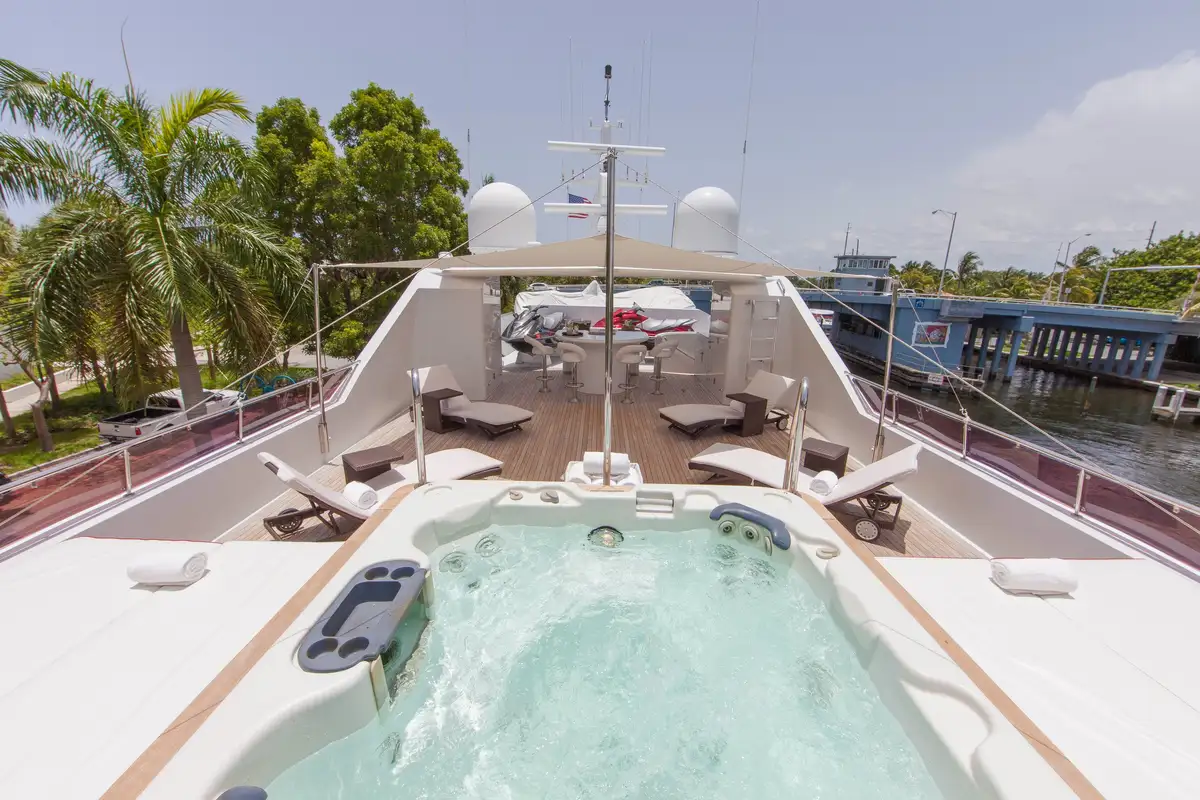 In addition, her enormous sky lounge features panoramic views, with coffered ceilings, an oversized full-service bar and entertainment center. The flybridge includes a large Jacuzzi with wraparound sun lounges, full wet bar, Waverunners and tender. Powered by dual DDC/MTU 16V2000's and with a 10,500 gallon fuel capacity, RELENTLESS cruises comfortably at 13 knots with a 17 knot top end speed. She is a highly capable yacht allowing for extended range cruising with the additional comfort of Quantum stabilizers.