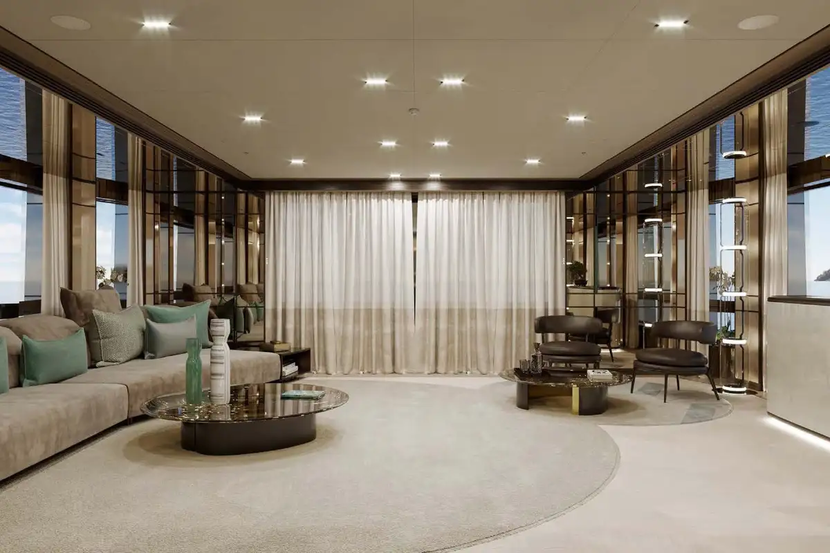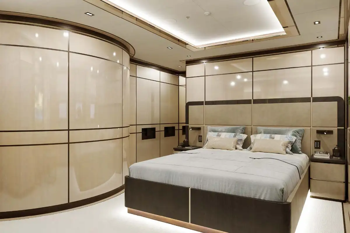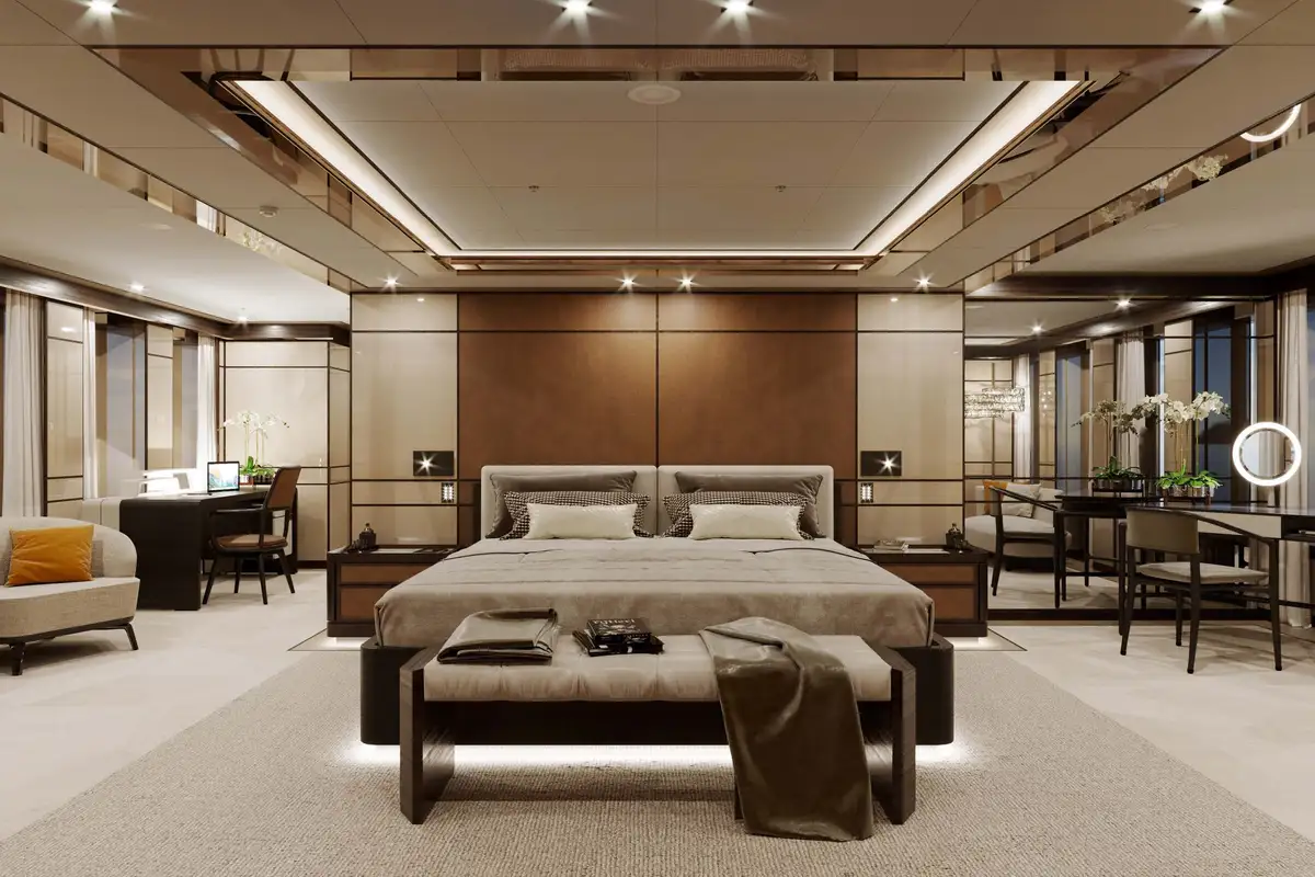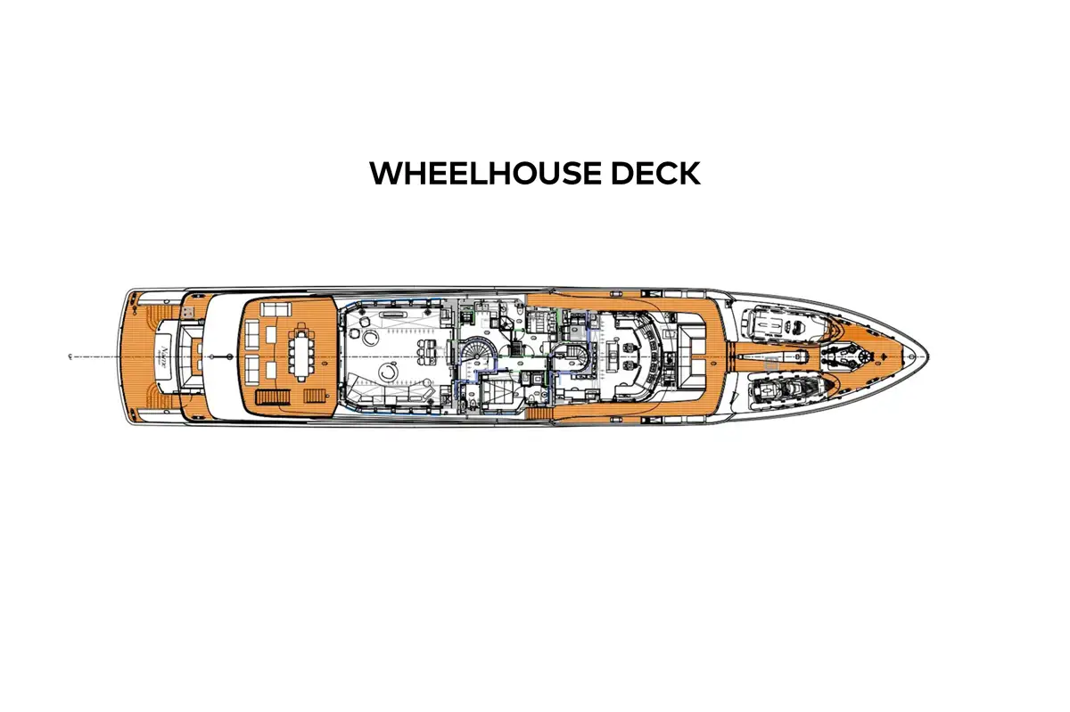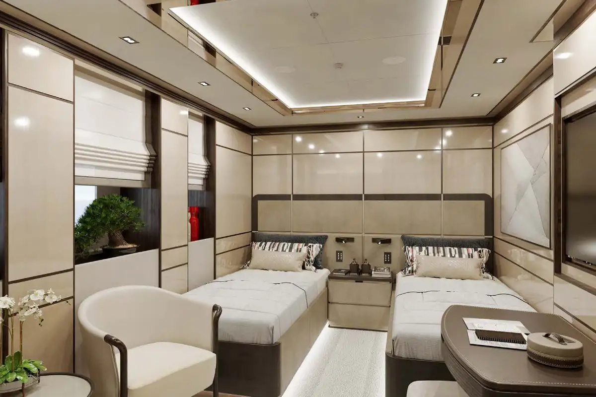 Her interior offers a total 756GT of volume on three main levels, to be styled by the buyer’s choice of interior designer. The general arrangement of the interior is configured to host 12 overnight guests (owner included) in six cabins, with separate quarters for up to 13 crew including the captain, for whom there is a dedicated cabin adjoining the bridge. The bridge deck also includes a VIP guest cabin and pantry amidships, and a full-beam skylounge aft. On the main deck there’s a large open-plan saloon aft, galley forward to port and a full-beam owner’s suite in the bow with his-and-hers bathrooms and ample space for study and lounge areas. The lower deck accommodation comprises two VIP doubles and two twin cabins for guests, plus the crew’s quarters in the bow.