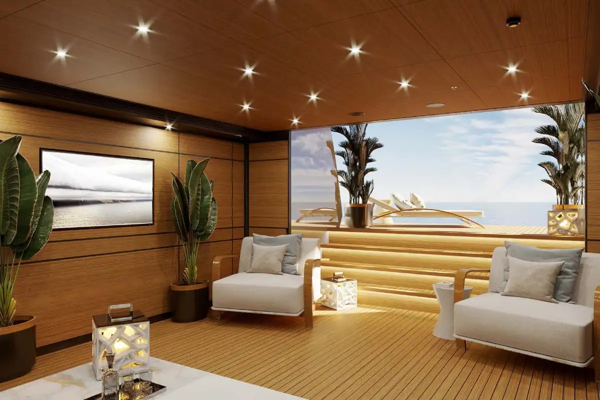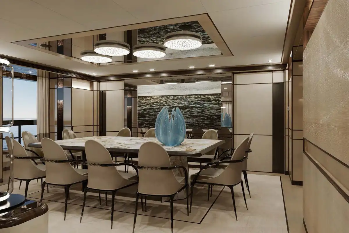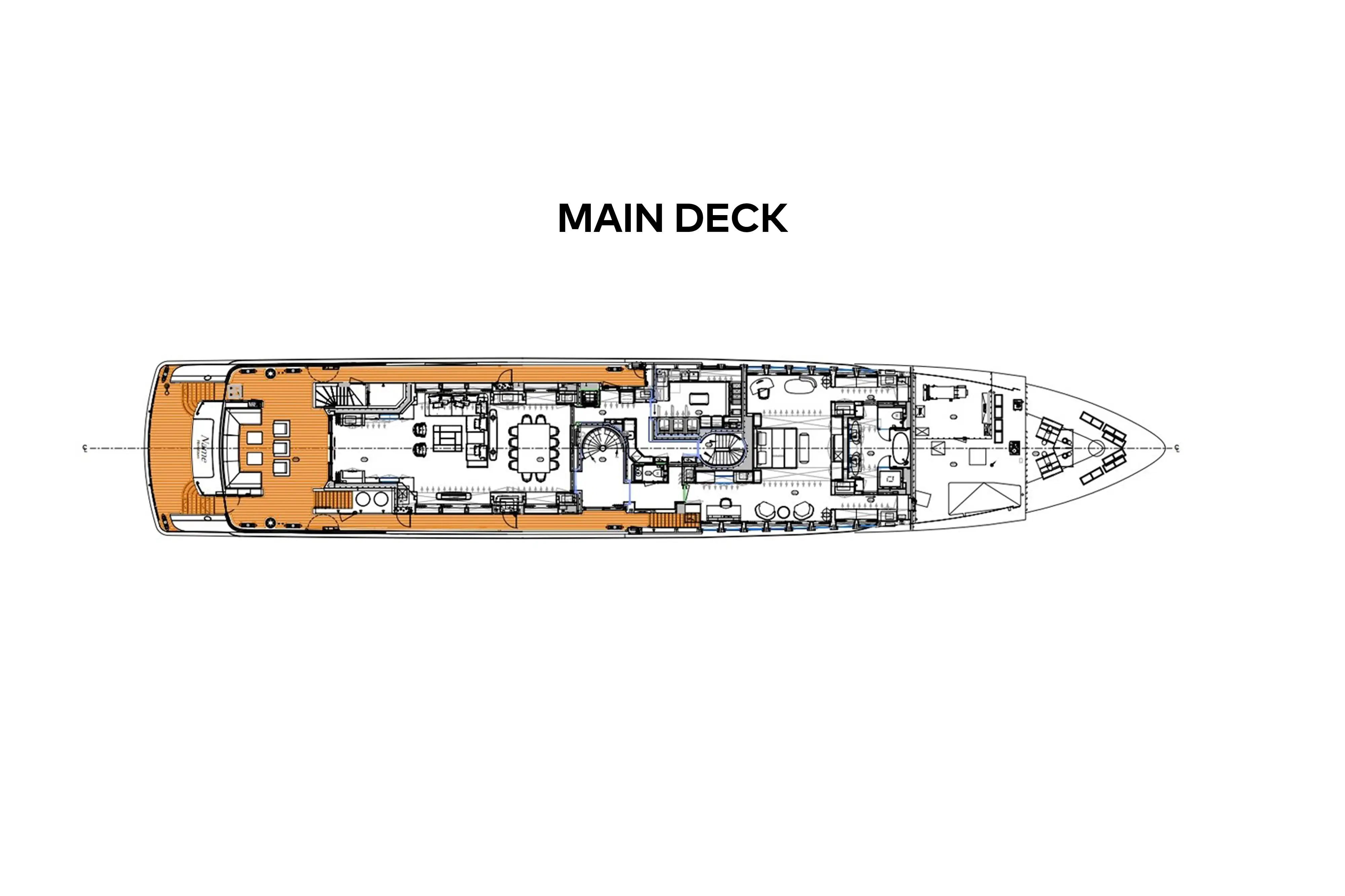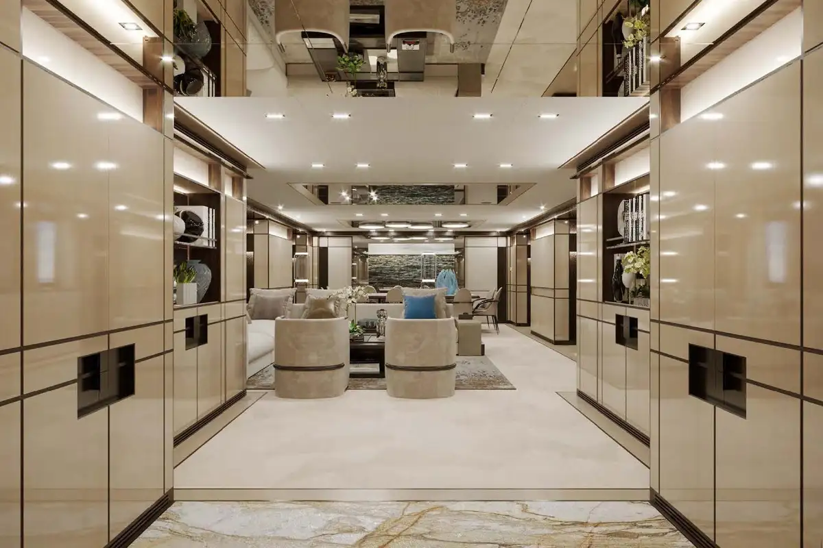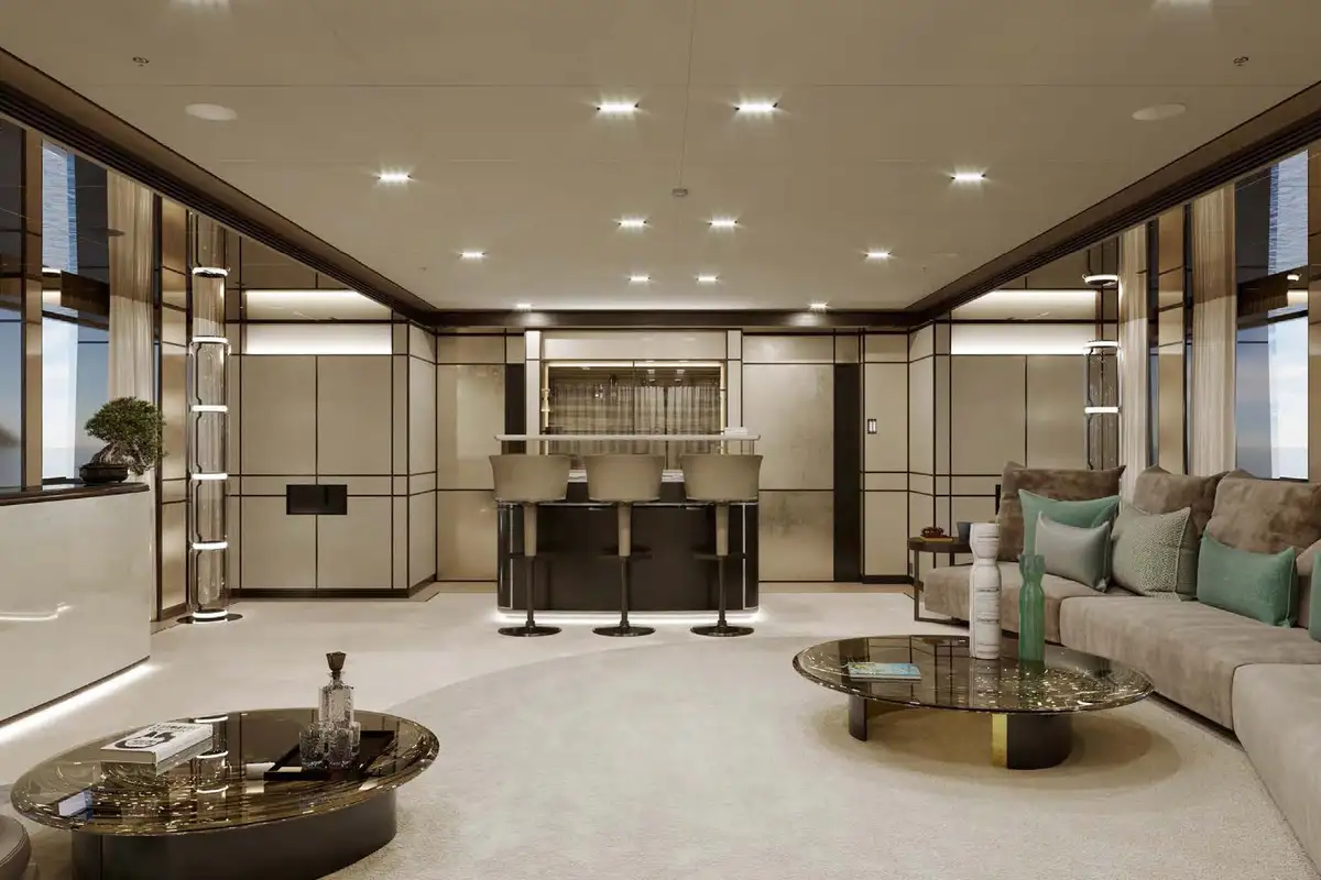 Her interior offers a total 756GT of volume on three main levels, to be styled by the buyer’s choice of interior designer. The general arrangement of the interior is configured to host 12 overnight guests (owner included) in six cabins, with separate quarters for up to 13 crew including the captain, for whom there is a dedicated cabin adjoining the bridge. The bridge deck also includes a VIP guest cabin and pantry amidships, and a full-beam skylounge aft. On the main deck there’s a large open-plan saloon aft, galley forward to port and a full-beam owner’s suite in the bow with his-and-hers bathrooms and ample space for study and lounge areas. The lower deck accommodation comprises two VIP doubles and two twin cabins for guests, plus the crew’s quarters in the bow.