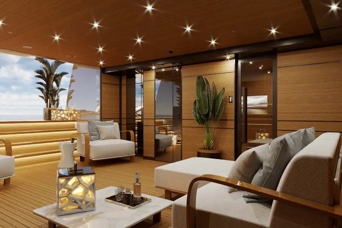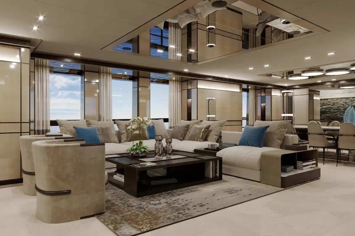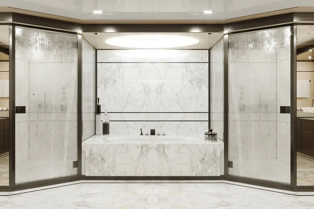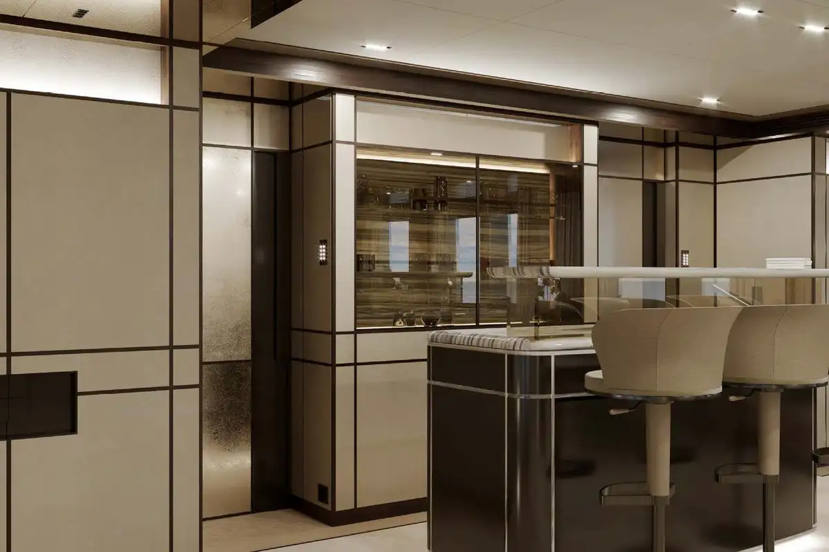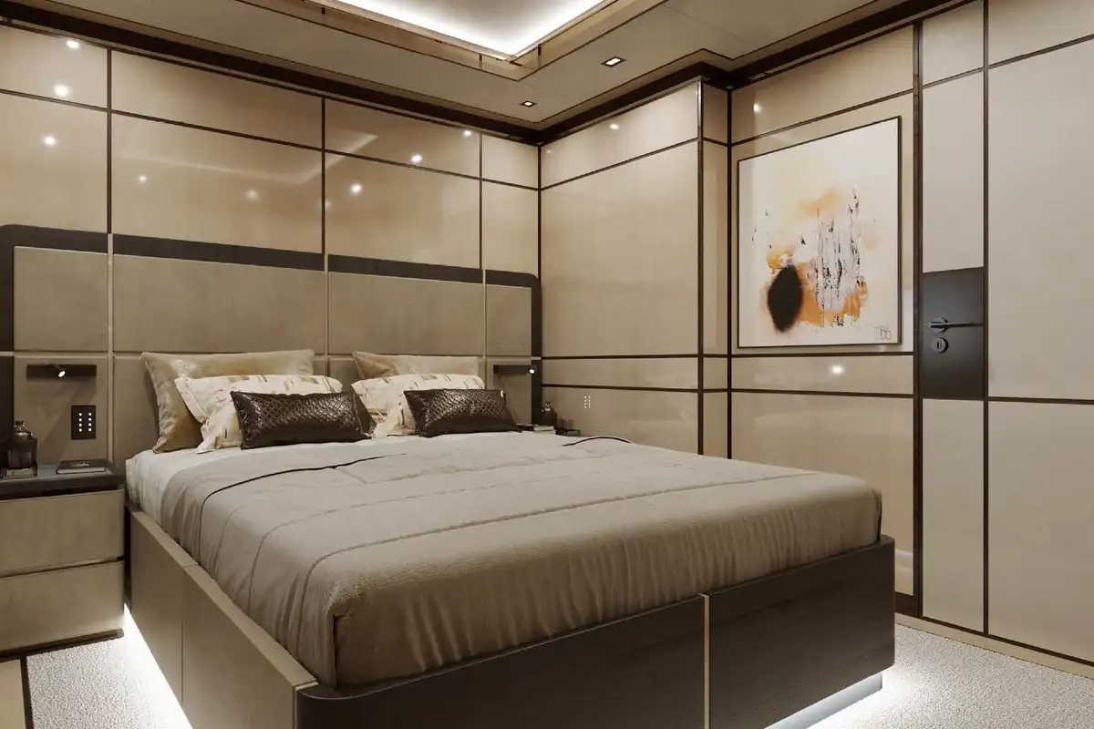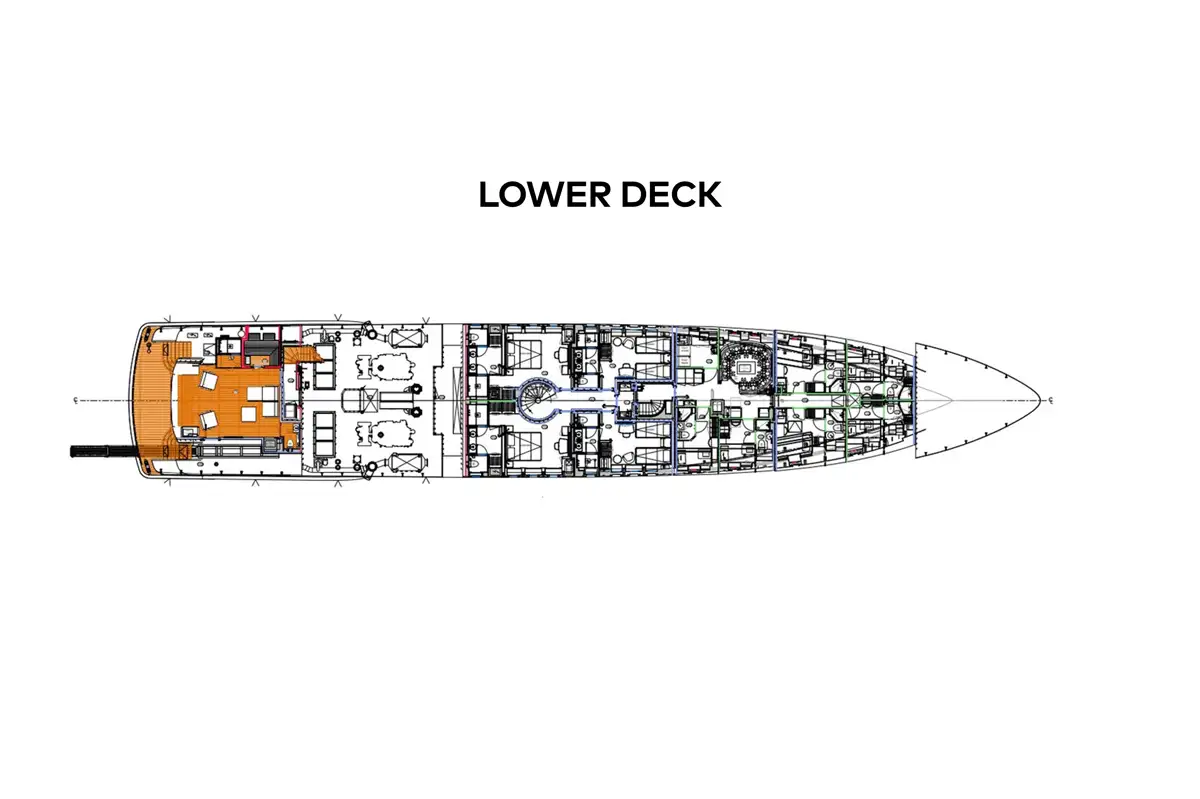 Her interior offers a total 756GT of volume on three main levels, to be styled by the buyer’s choice of interior designer. The general arrangement of the interior is configured to host 12 overnight guests (owner included) in six cabins, with separate quarters for up to 13 crew including the captain, for whom there is a dedicated cabin adjoining the bridge. The bridge deck also includes a VIP guest cabin and pantry amidships, and a full-beam skylounge aft. On the main deck there’s a large open-plan saloon aft, galley forward to port and a full-beam owner’s suite in the bow with his-and-hers bathrooms and ample space for study and lounge areas. The lower deck accommodation comprises two VIP doubles and two twin cabins for guests, plus the crew’s quarters in the bow.