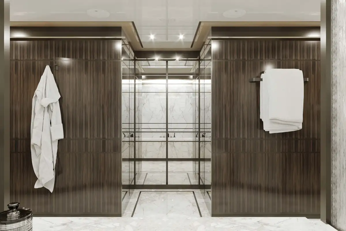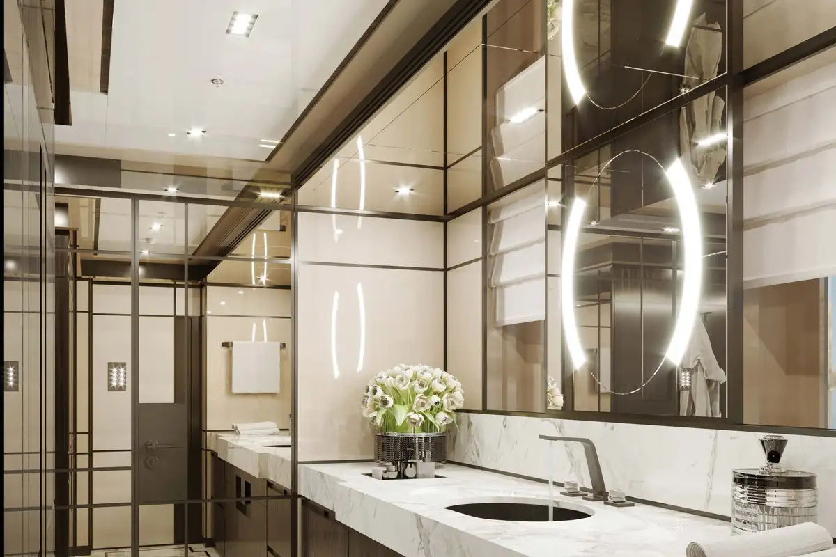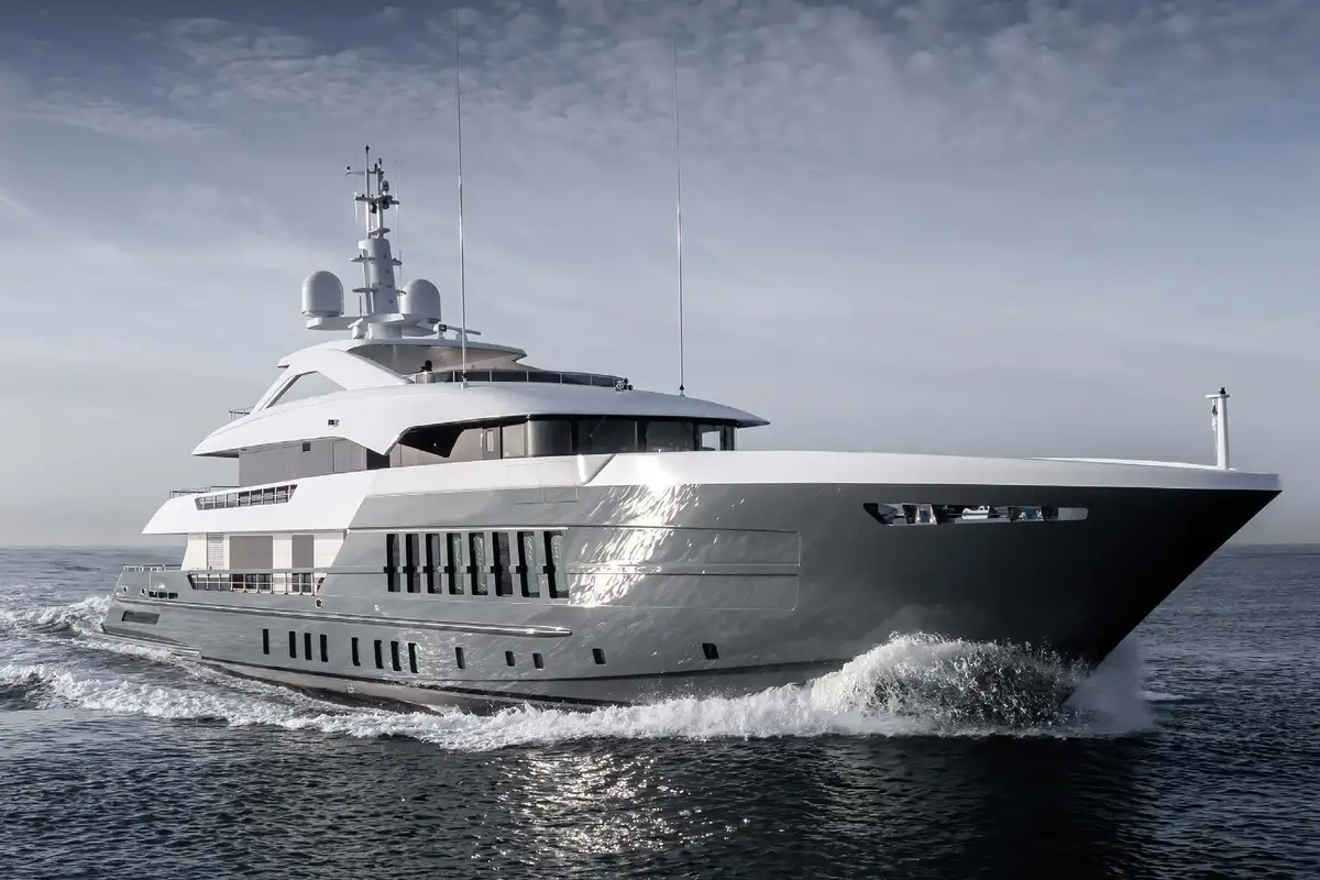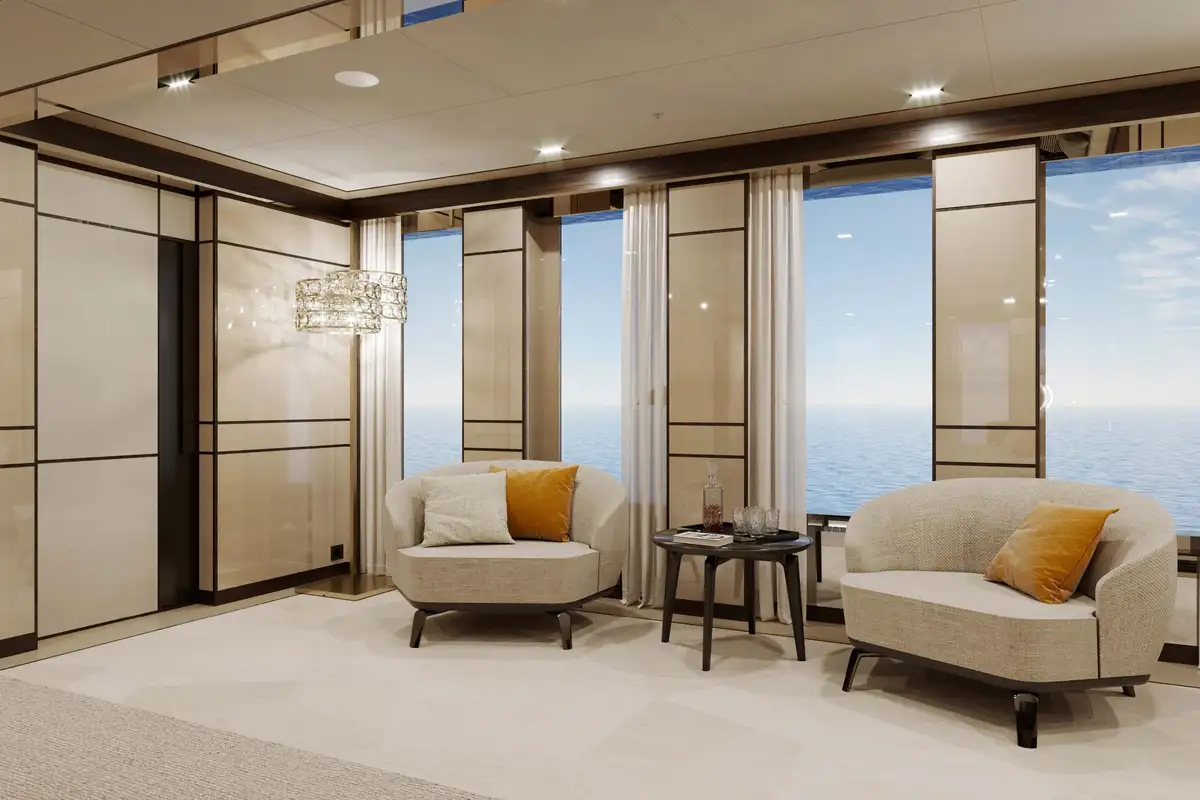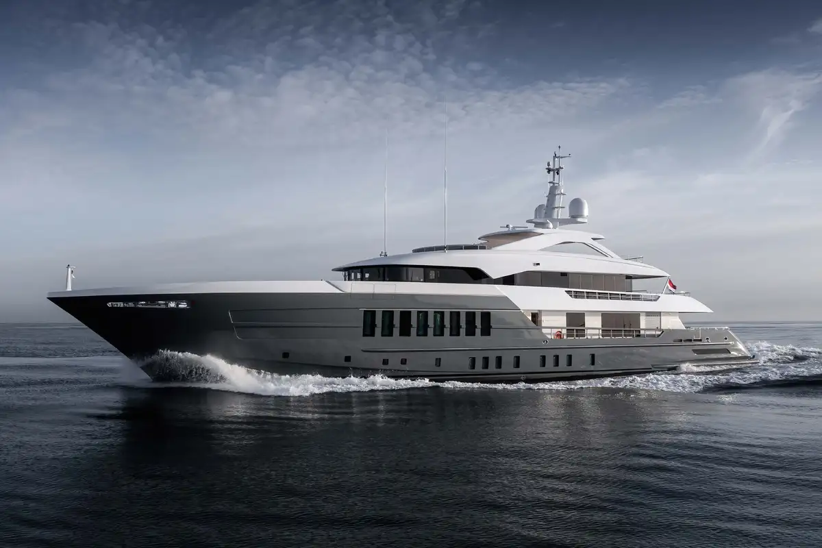 Her interior offers a total 756GT of volume on three main levels, to be styled by the buyer’s choice of interior designer. The general arrangement of the interior is configured to host 12 overnight guests (owner included) in six cabins, with separate quarters for up to 13 crew including the captain, for whom there is a dedicated cabin adjoining the bridge. The bridge deck also includes a VIP guest cabin and pantry amidships, and a full-beam skylounge aft. On the main deck there’s a large open-plan saloon aft, galley forward to port and a full-beam owner’s suite in the bow with his-and-hers bathrooms and ample space for study and lounge areas. The lower deck accommodation comprises two VIP doubles and two twin cabins for guests, plus the crew’s quarters in the bow.