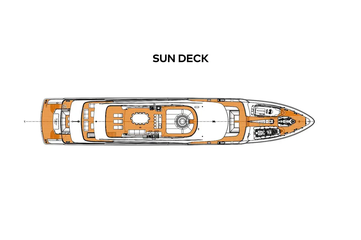 The tender deck is designed for a 7m x 2.5m main tender on the port-hand side and a 6.5m x 2.5m rescue boat to starboard. The toy store beneath the tender deck can hold a 3.5m x 1.2m jet ski and there’s a telescopic launching crane with a SWL of 1,900kg.