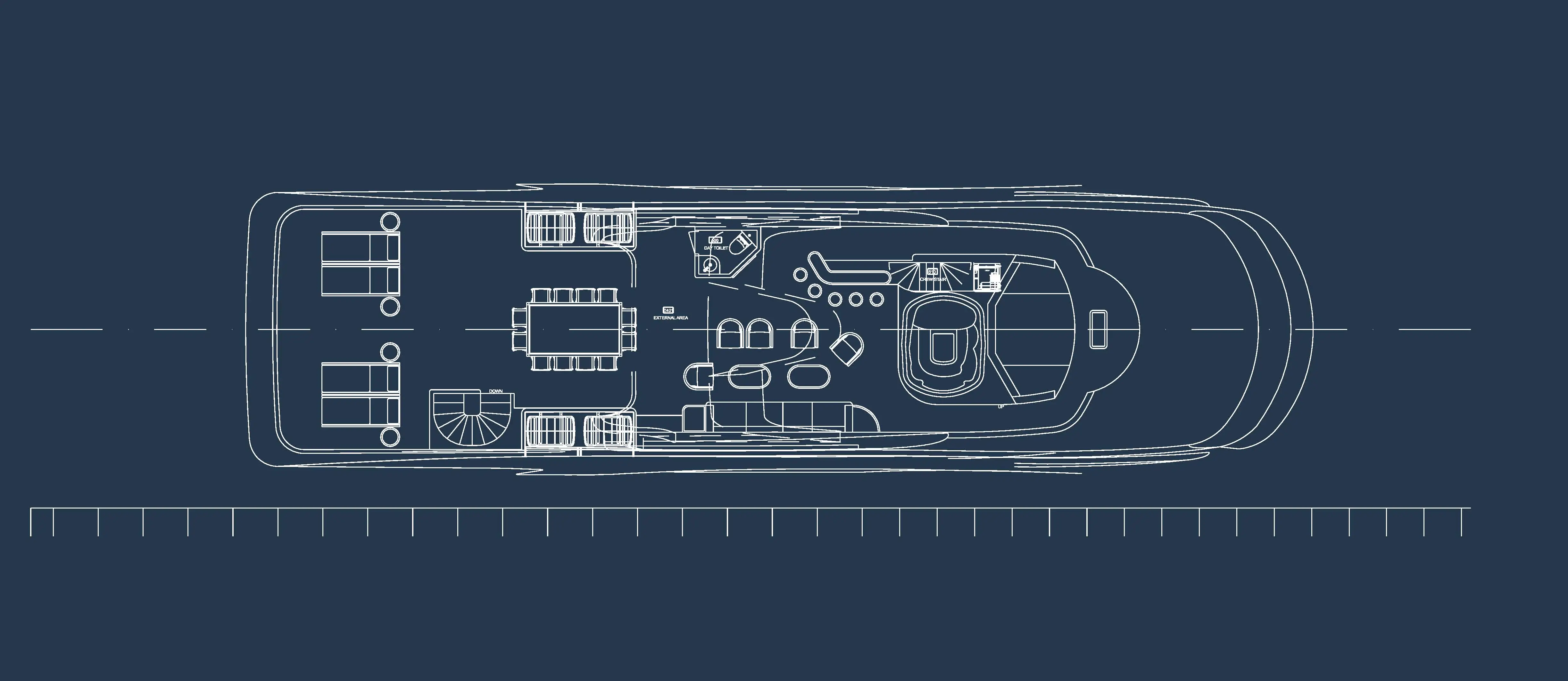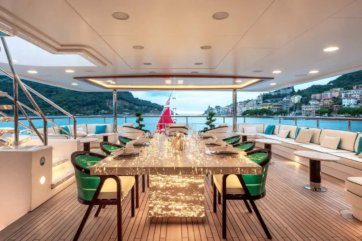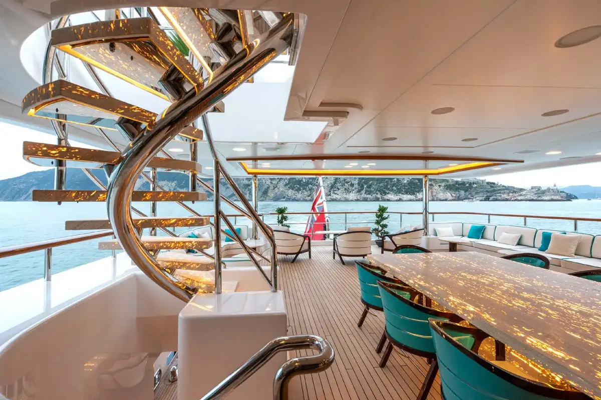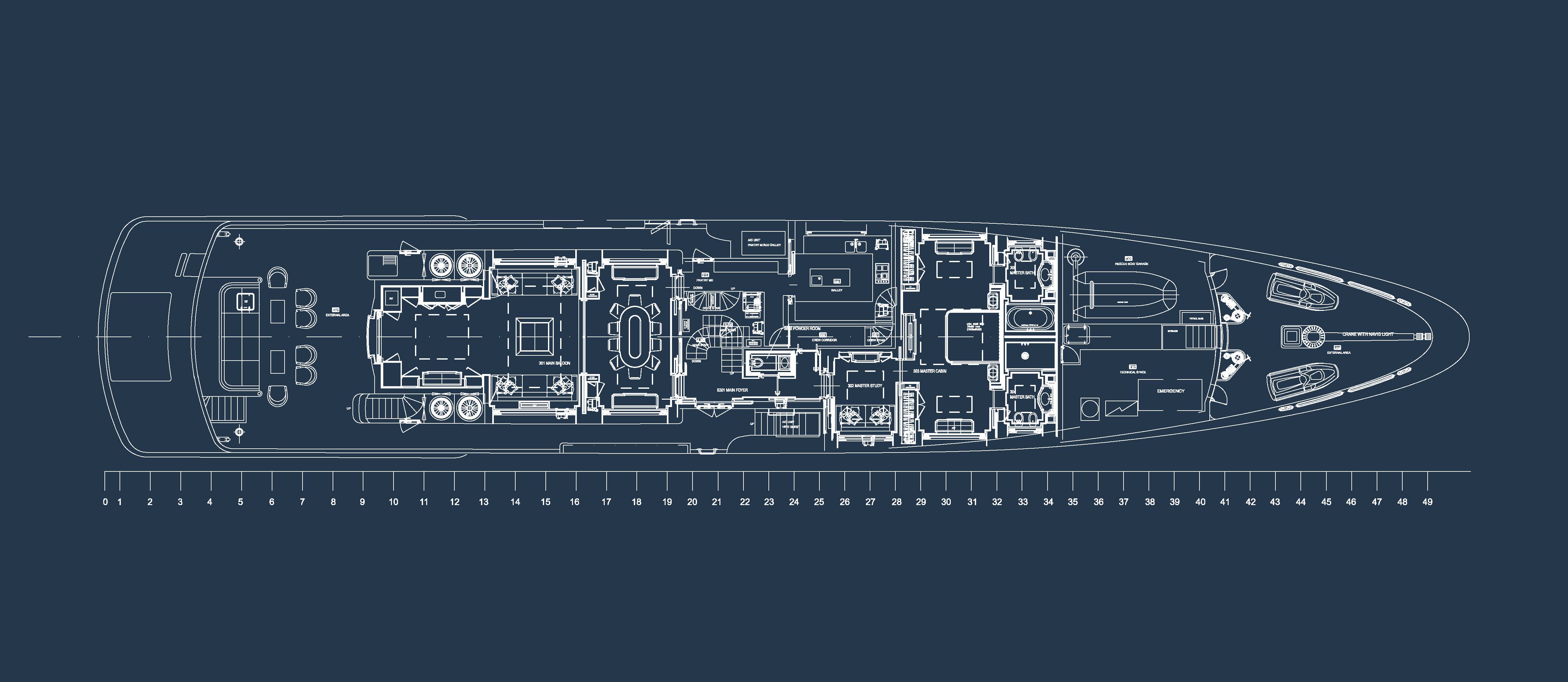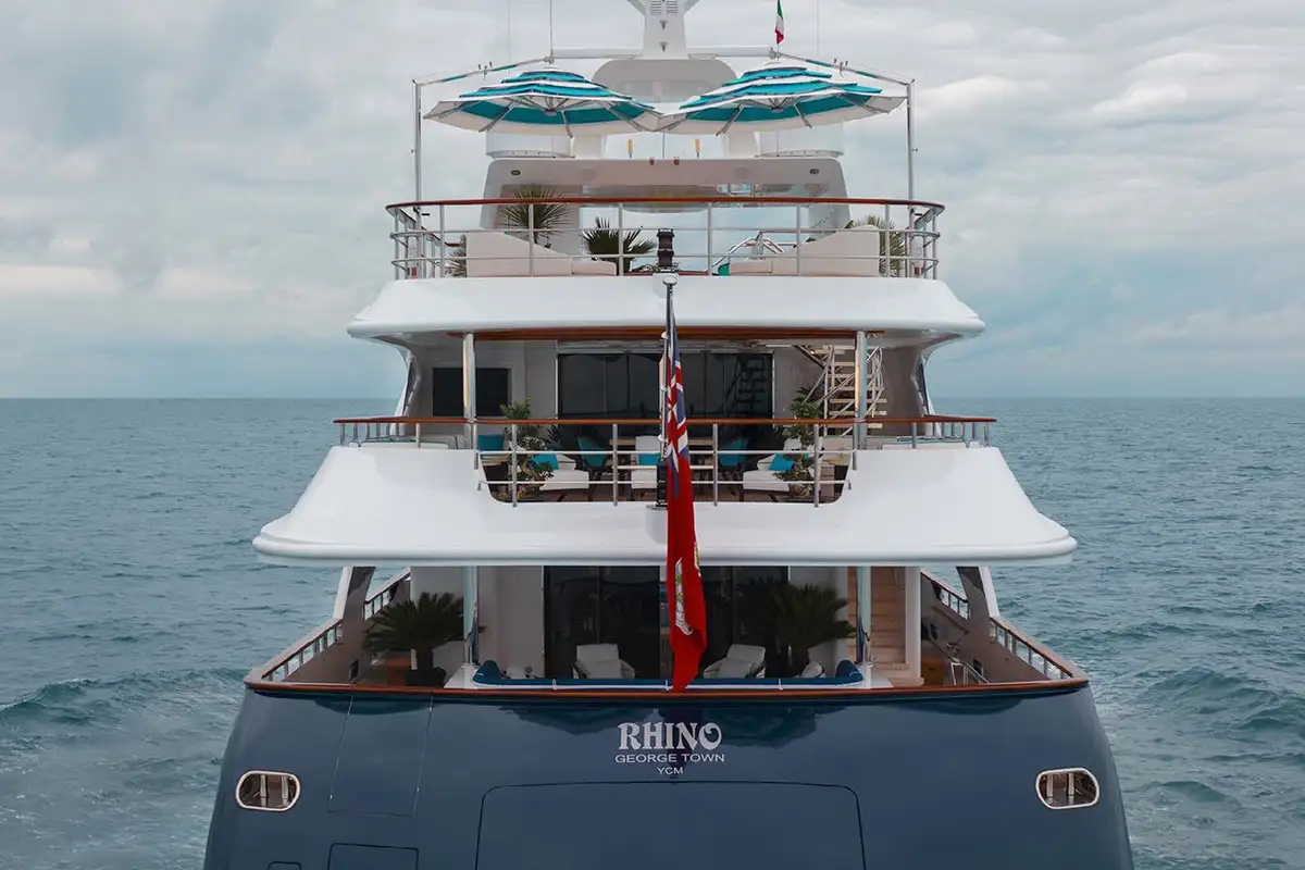 At 54 meters RHINO effortlessly incorporates style, space and elegance. Her exterior spaces are excellent for relaxation and sunbathing and her very generous sundeck is equipped with spa pool, and aft on the bridge deck is a superb alfresco dining experience area.