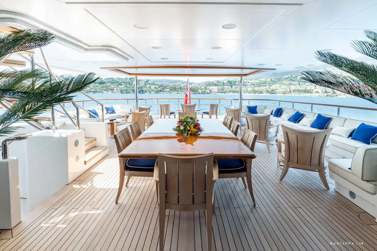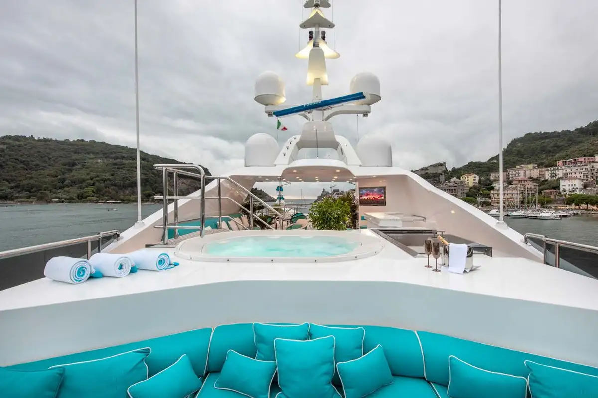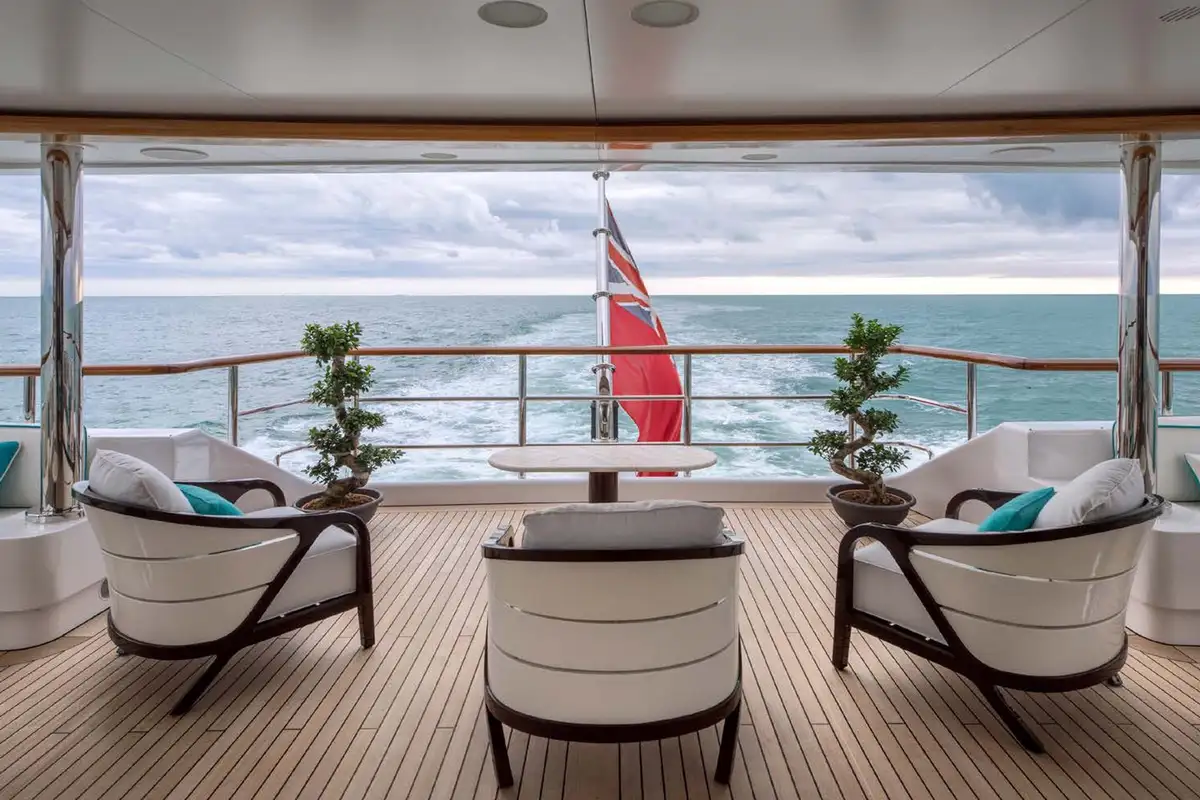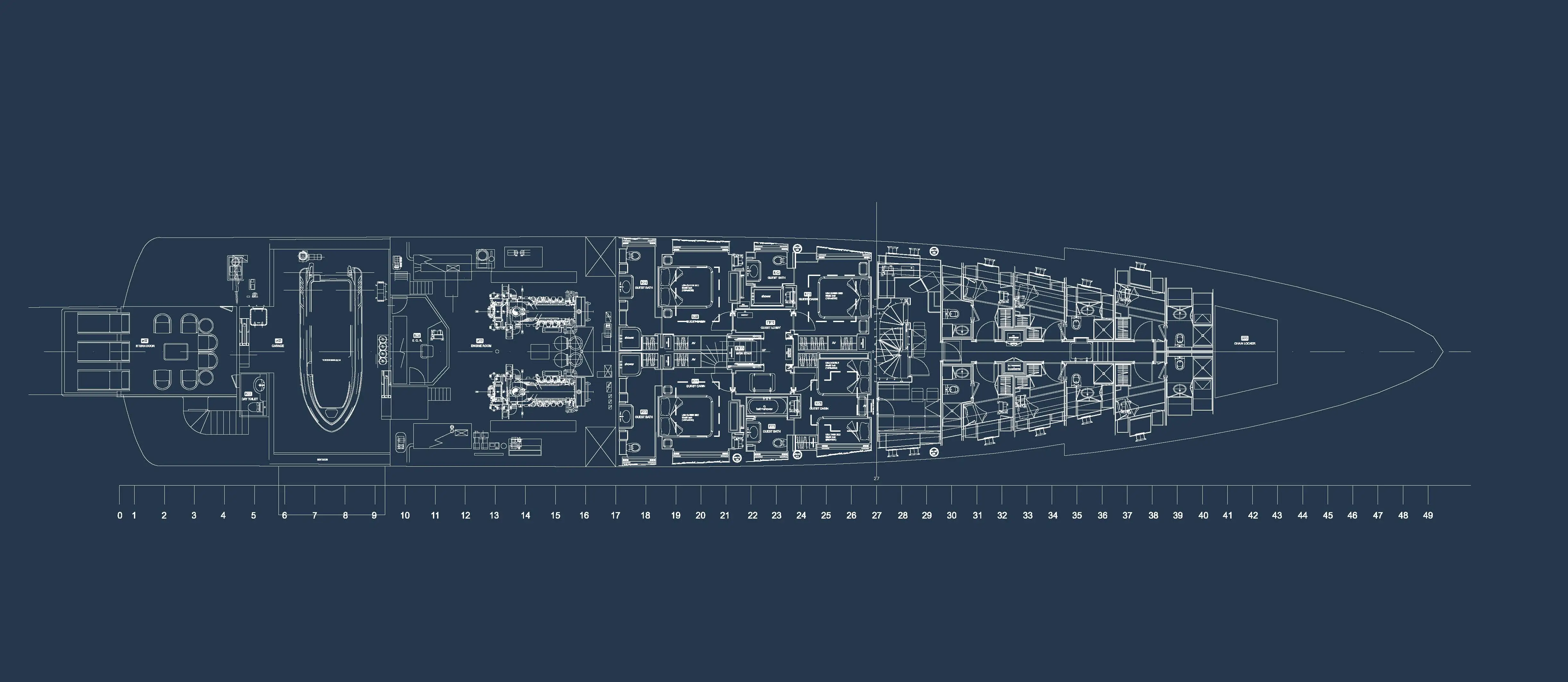 At 54 meters RHINO effortlessly incorporates style, space and elegance. Her exterior spaces are excellent for relaxation and sunbathing and her very generous sundeck is equipped with spa pool, and aft on the bridge deck is a superb alfresco dining experience area.