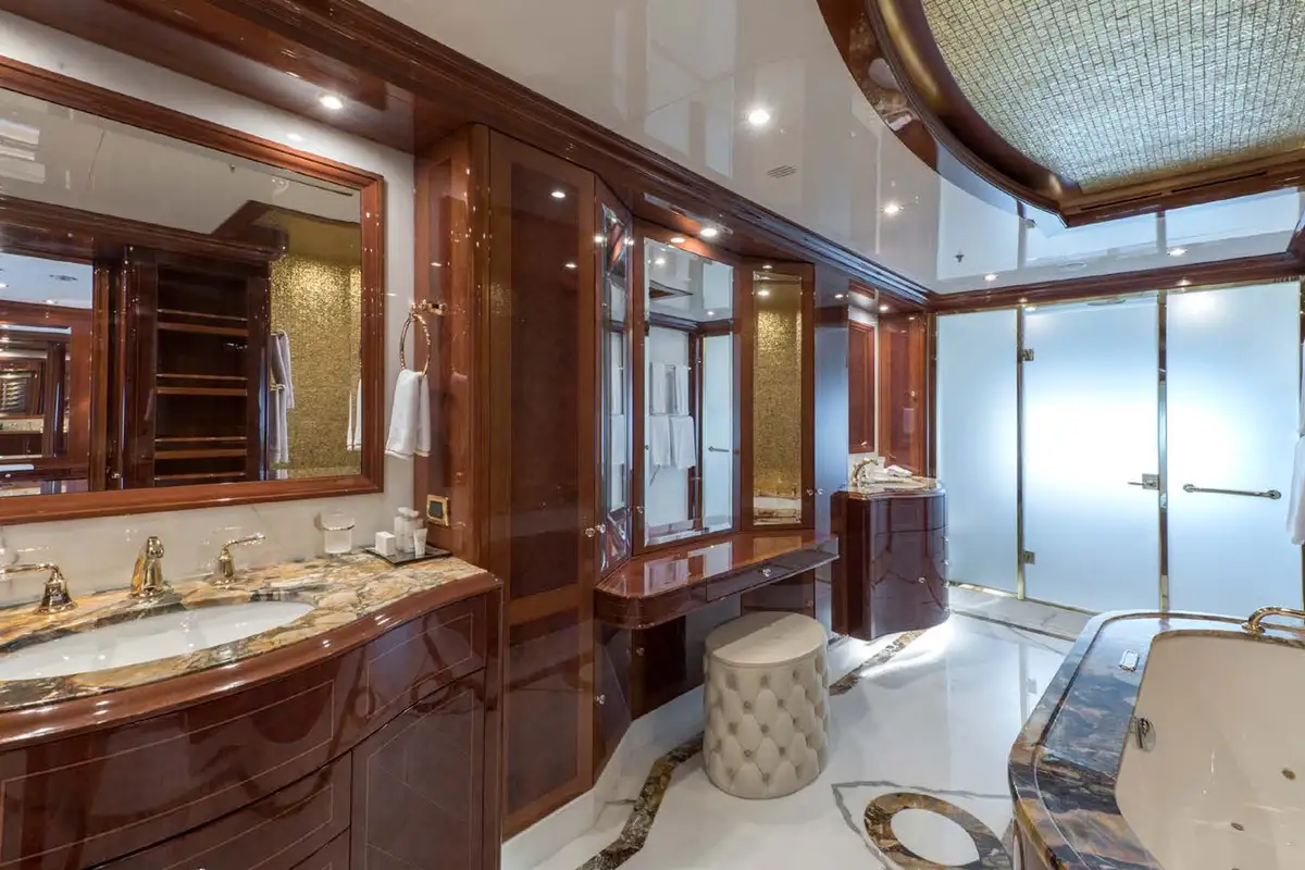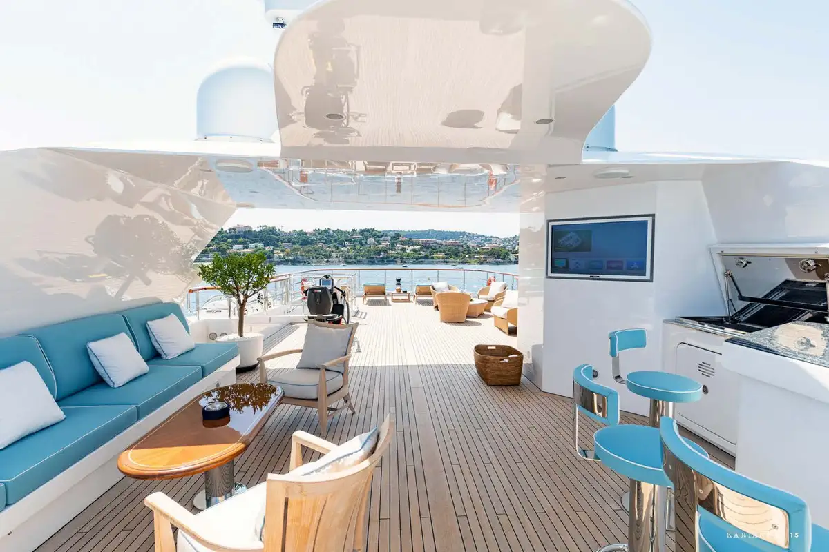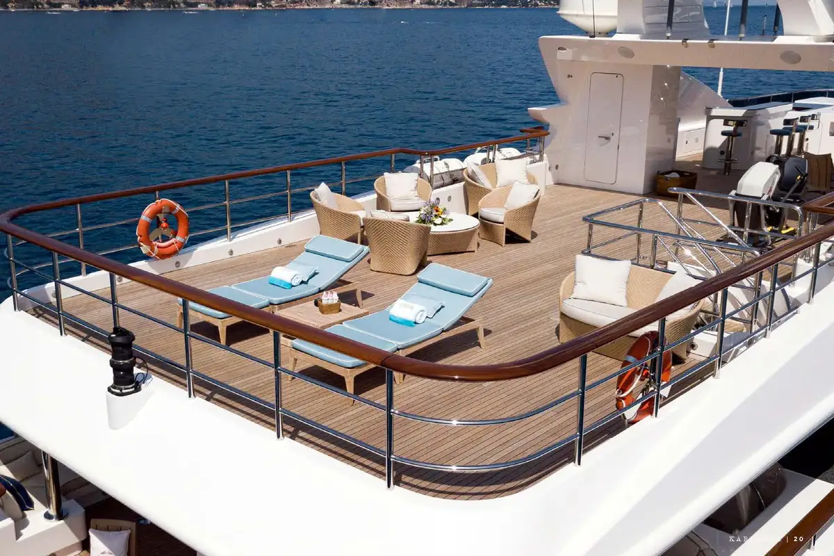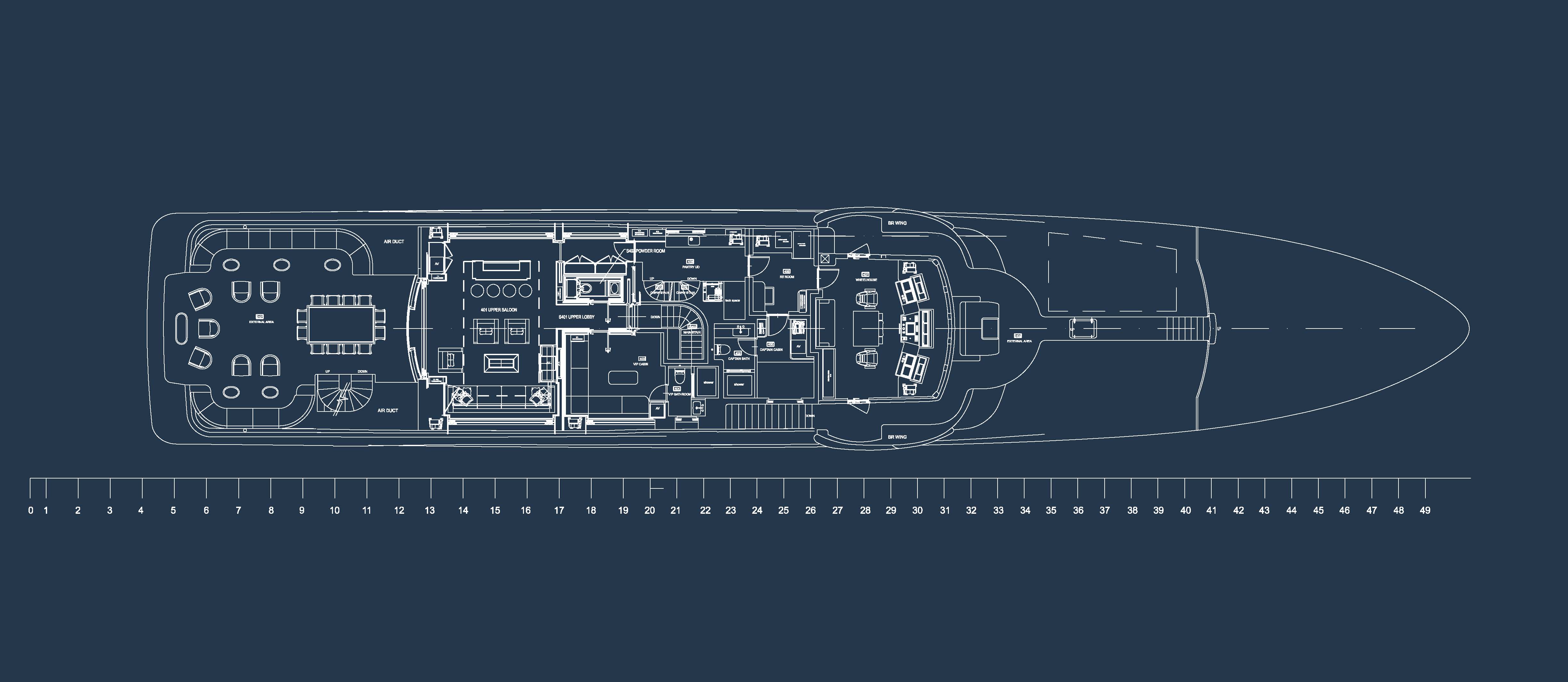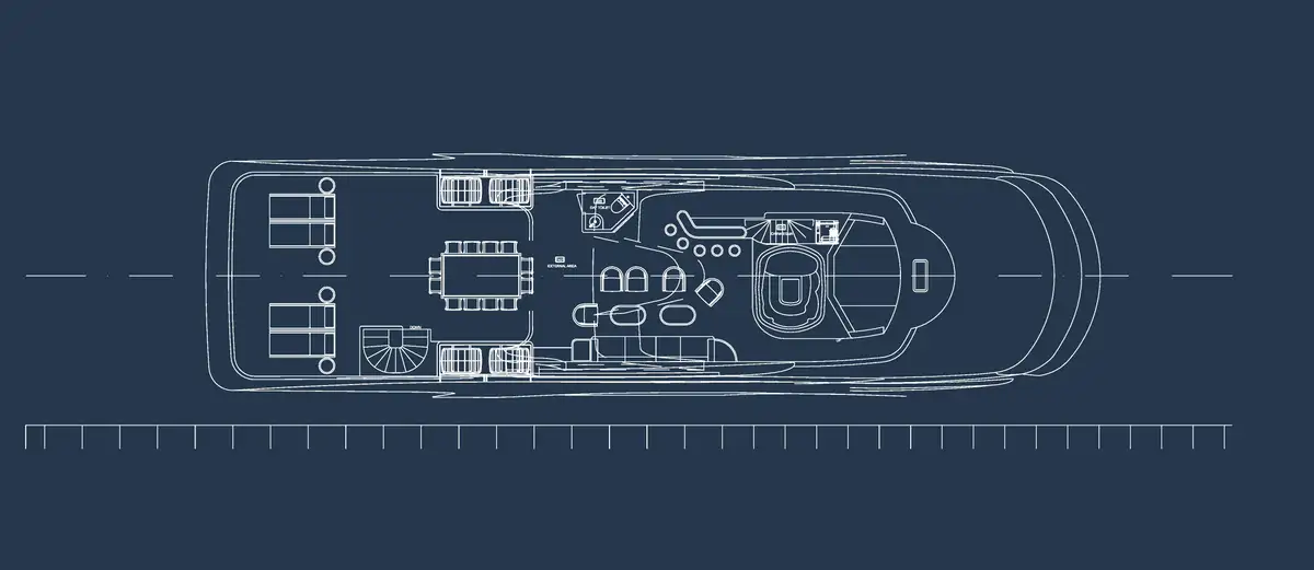 At 54 meters RHINO effortlessly incorporates style, space and elegance. Her exterior spaces are excellent for relaxation and sunbathing and her very generous sundeck is equipped with spa pool, and aft on the bridge deck is a superb alfresco dining experience area.