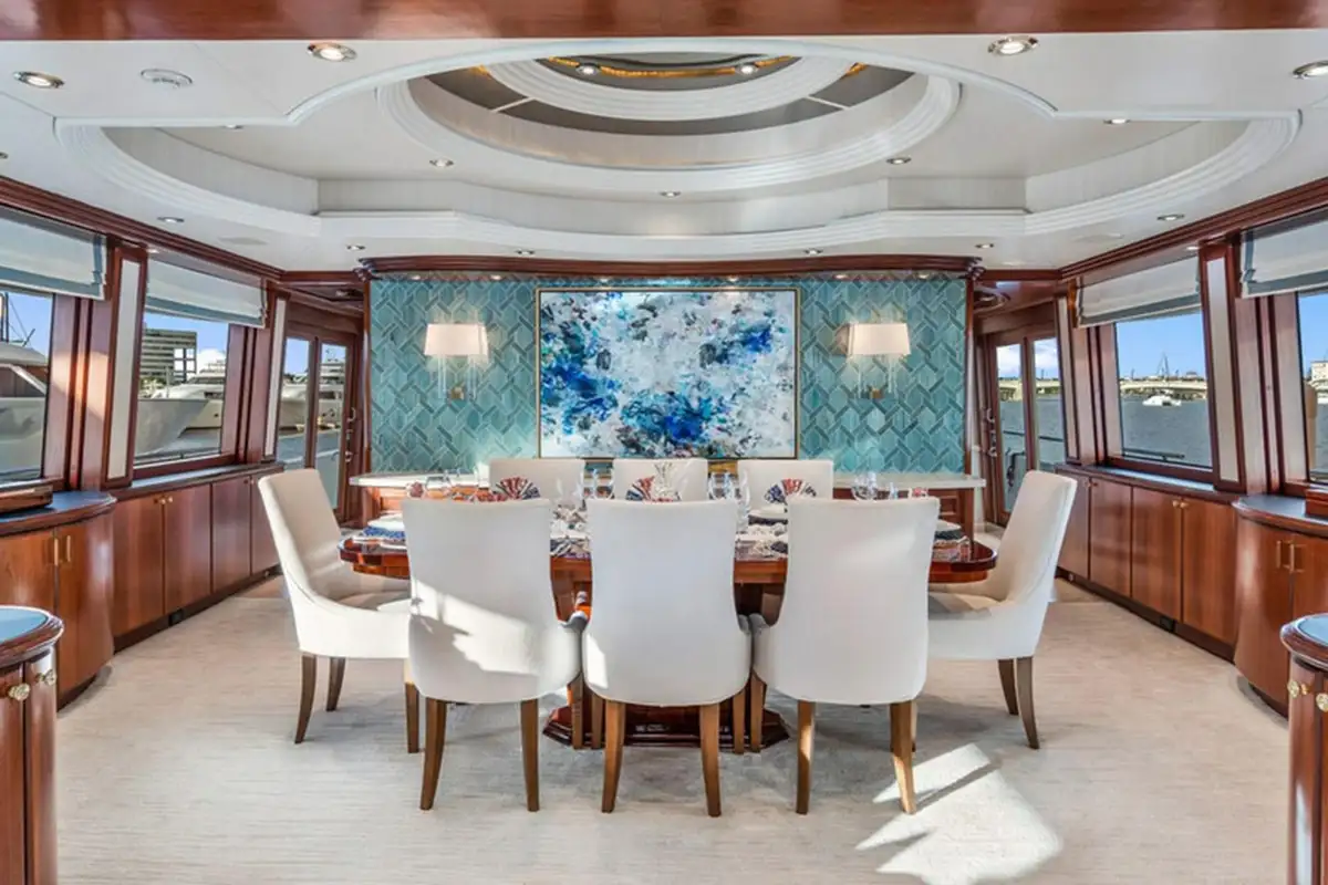 Her interior is bright and elegant, with finely crafted and detailed mahogany joinery offset by white headlining and cream carpets. The main saloon has a spacious lounge aft and an eight-seat dining table forward, beneath an ornately detailed ceiling. A foyer leads forward on the starboard side to the galley, which has a dinette for informal meals, and a spiral staircase leads down to the guest cabins on the lower deck.