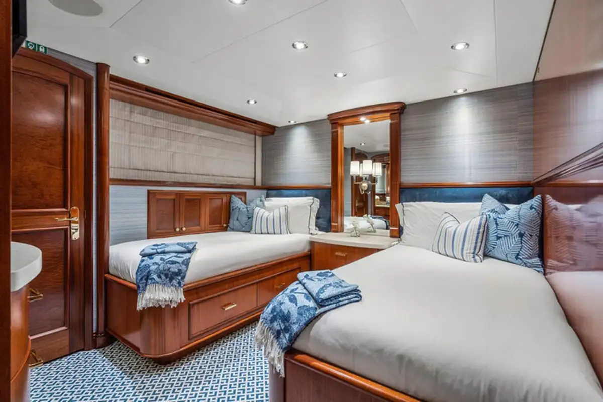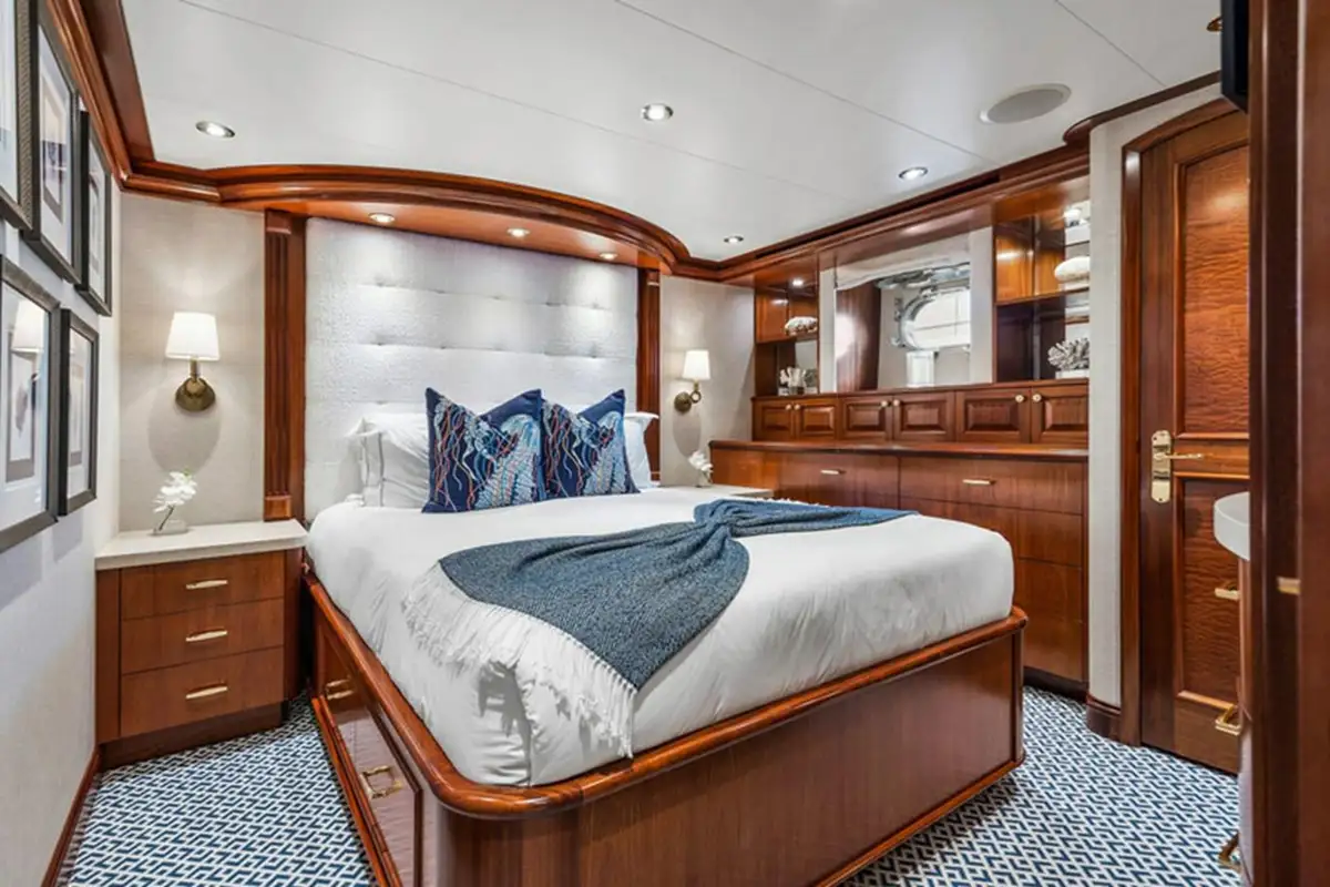The full-beam master suite is a showcase of fine classic joinery with a king size bed on the centreline, a study desk and sofa, ample stowage in mahogany drawers, lockers and cabinets, and the same high quality of finish in its en suite bathroom. The lower deck foyer and three other guest cabins are furnished in the same style, also with a notably high standard of finish.