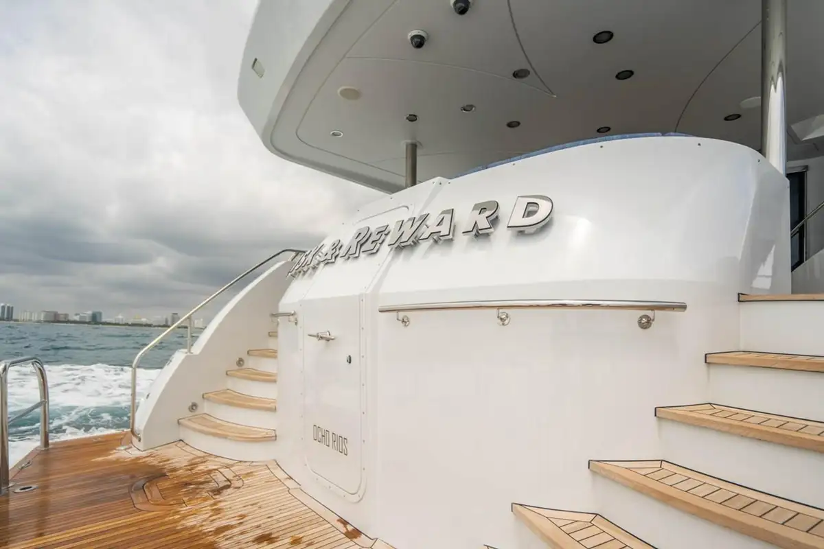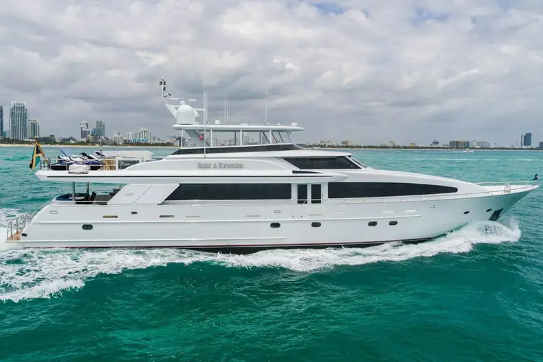 RISK & REWARD is a 37-metre (120ft) motor yacht with a raised pilothouse, a mezzanine flybridge and two main decks of guest accommodation. Built in fibreglass by Crescent Yachts of Vancouver, Canada with a semi-displacement hull designed by Jack Sarin, she was delivered in 2004 and extensively refitted in 2020-21. Further upgrades and works were completed in 2022.