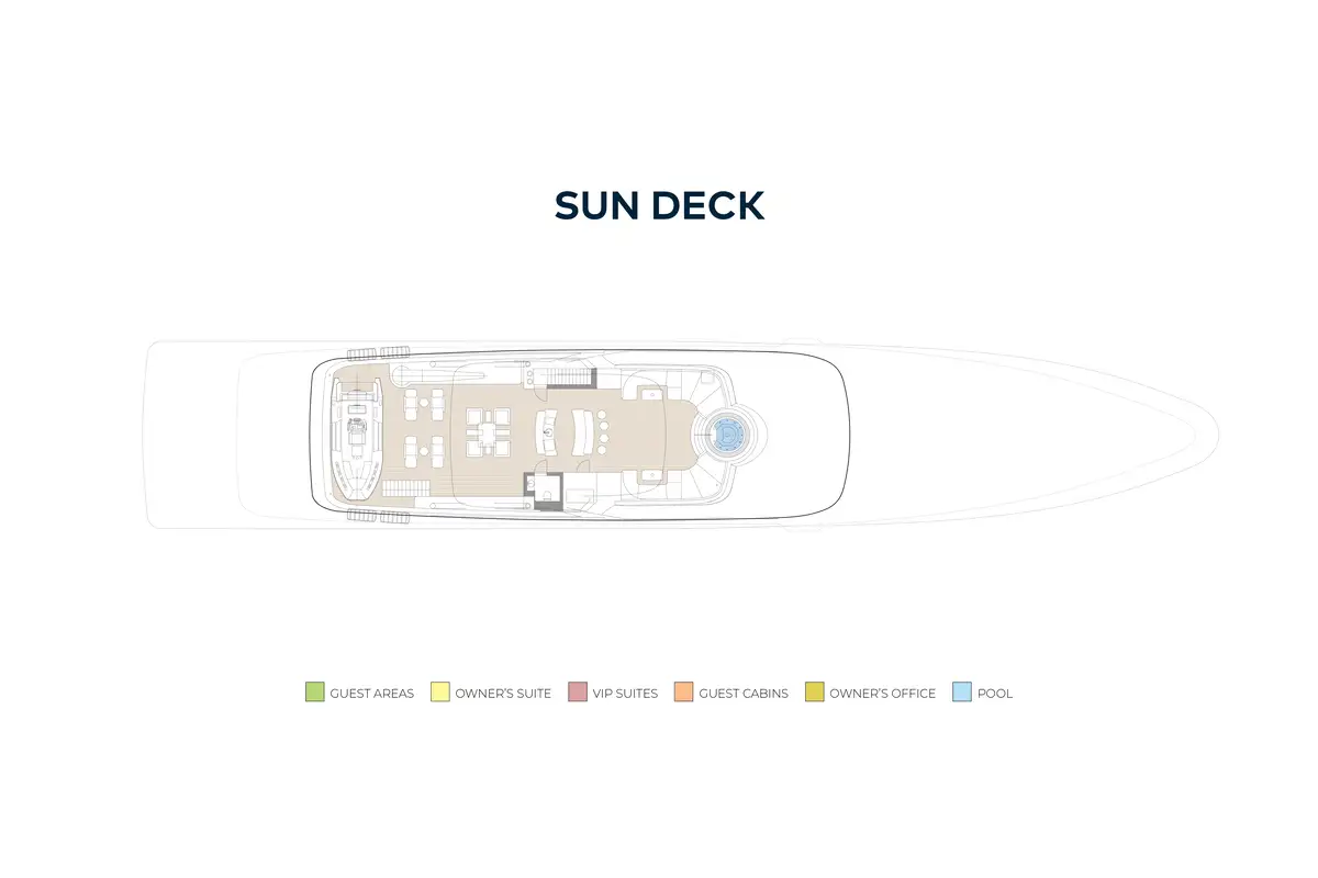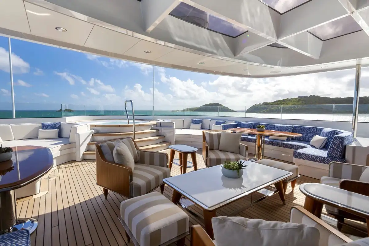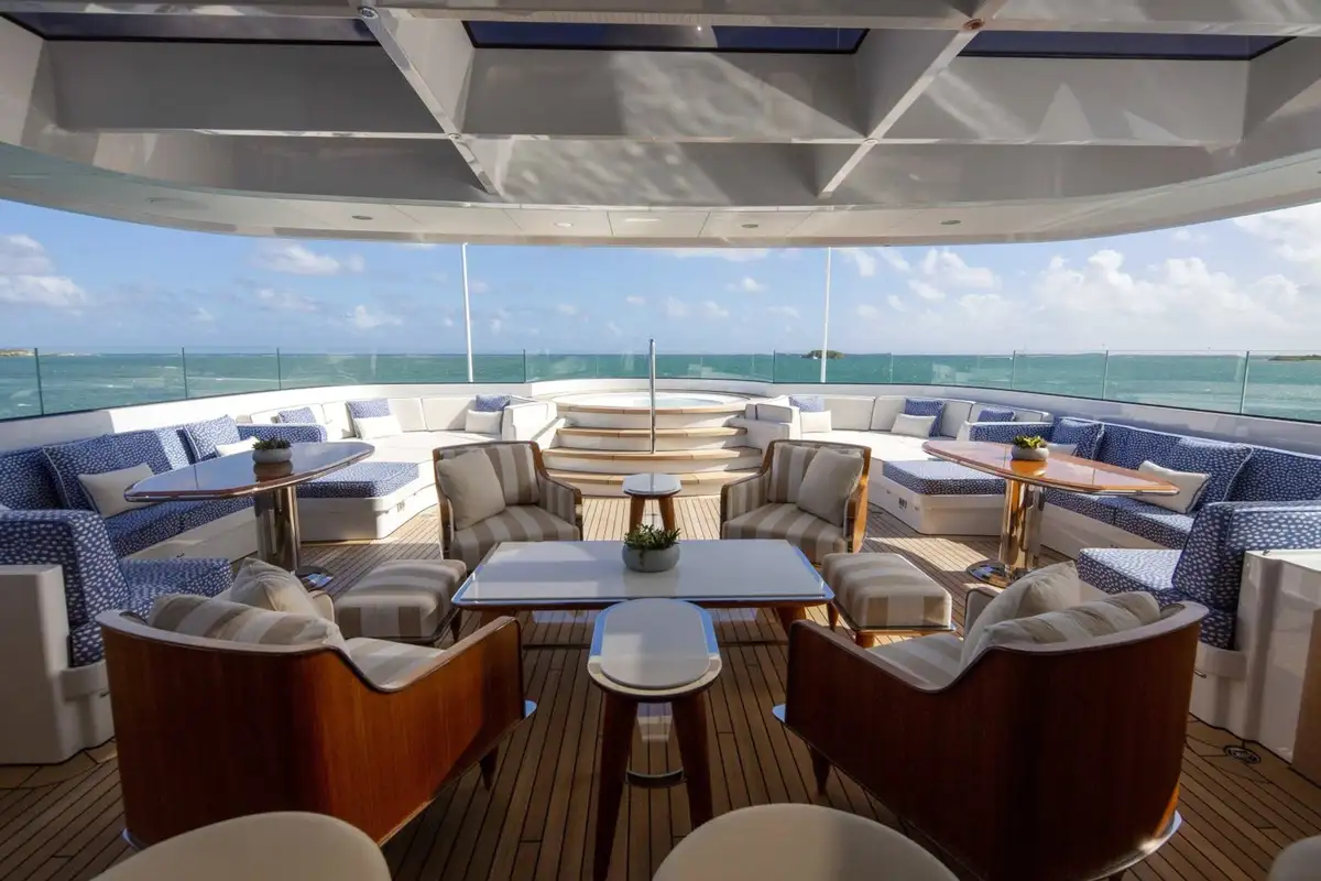 The large sun deck has a raised jacuzzi forward flanked by seating. Sun lounge areas either side are served by a fully equipped bar under the hard top and there is another lounge area in the shade. Aft is a versatile open deck space suitable for sunloungers, entertainment and many other uses.