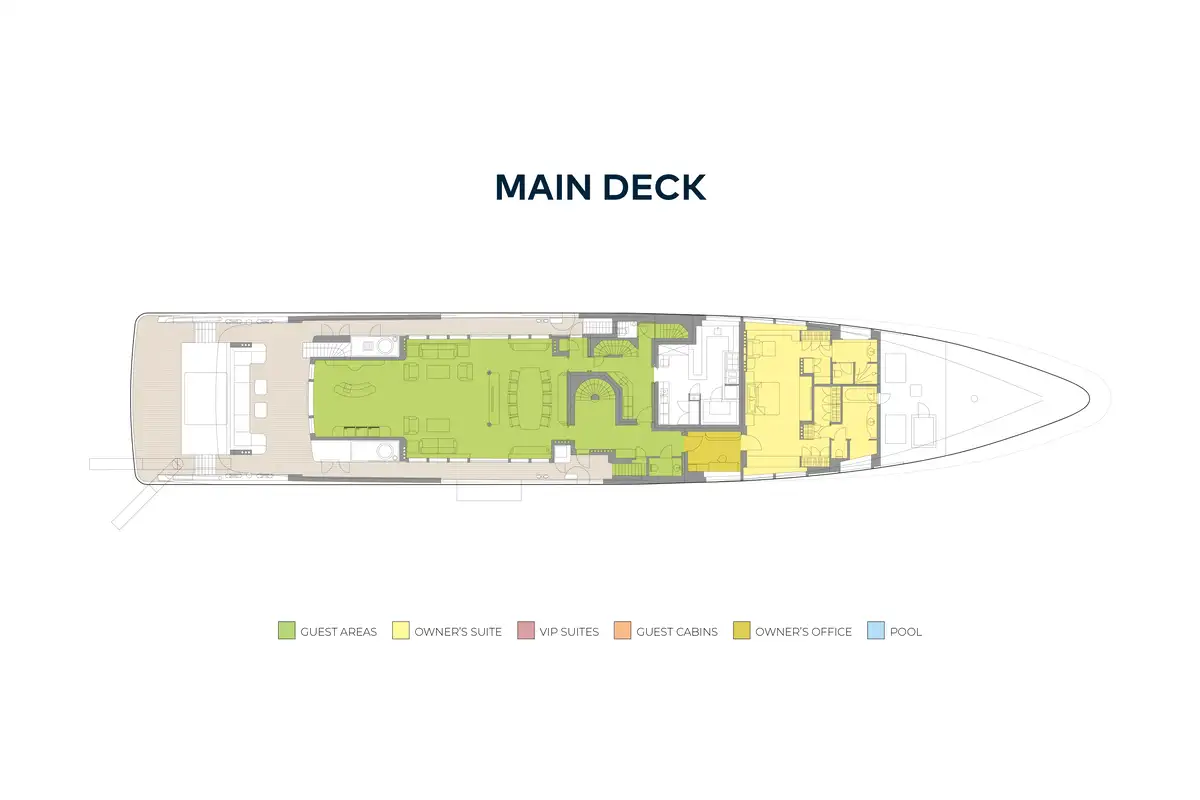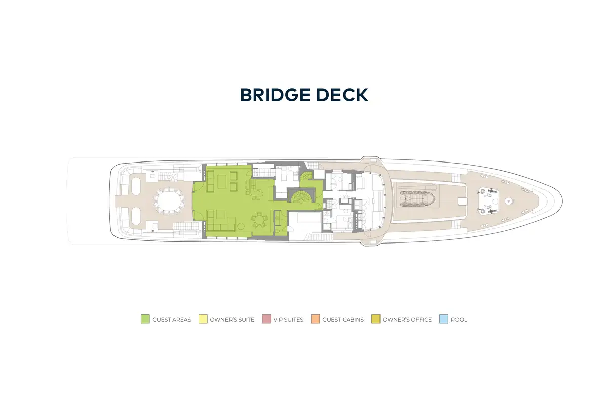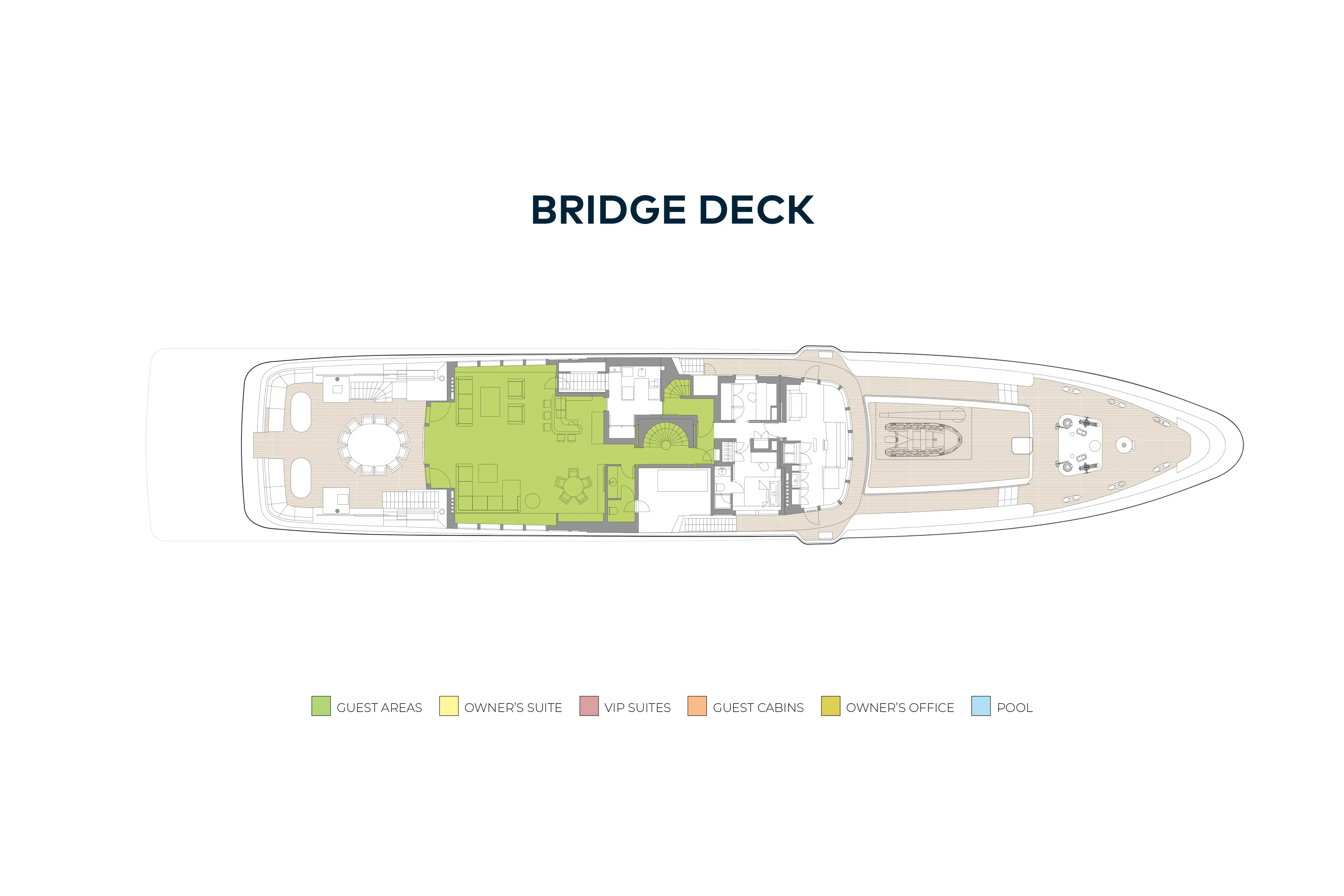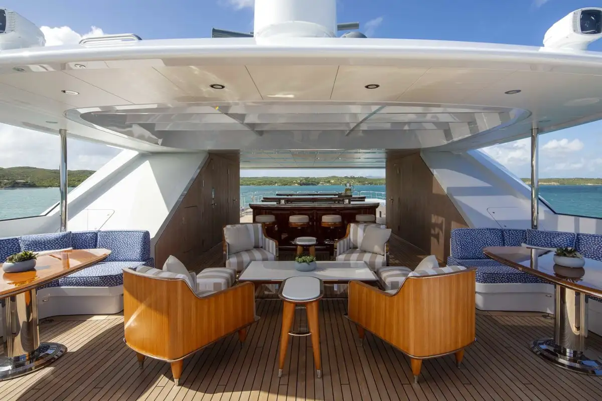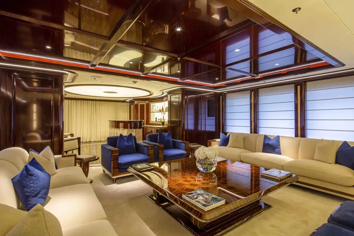 Her interiors feature high gloss wood panelling on bulkheads and ceilings, contrasted with cream leathers, backlit white onyx, portoro and other marbles. The wood in the main saloon and cabins is darker and the sky lounge has a lighter theme and teak decking. A large TV flips down from the ceiling between the main saloon and the formal dining area, creating a home cinema, and there is a splendid bar aft on a circle of dark marble. Two fold-down sea terraces with sliding doors can be found on both port and starboard side of the main deck lounge, creating a true indoor/outdoor feel. There are two lounge areas and a gaming table in the sky lounge, as well as a sit up bar.