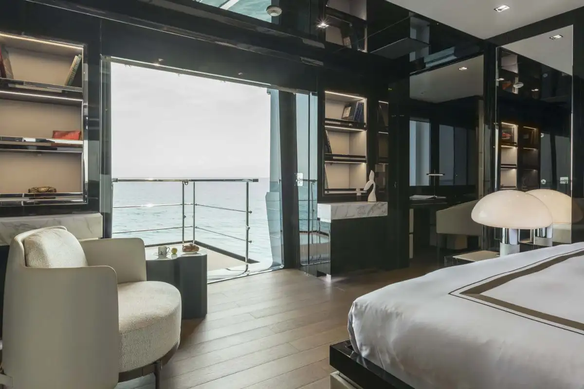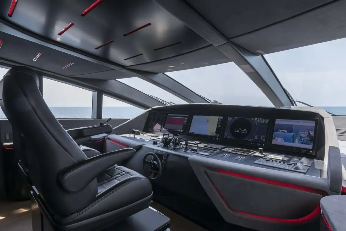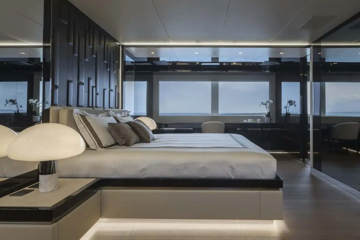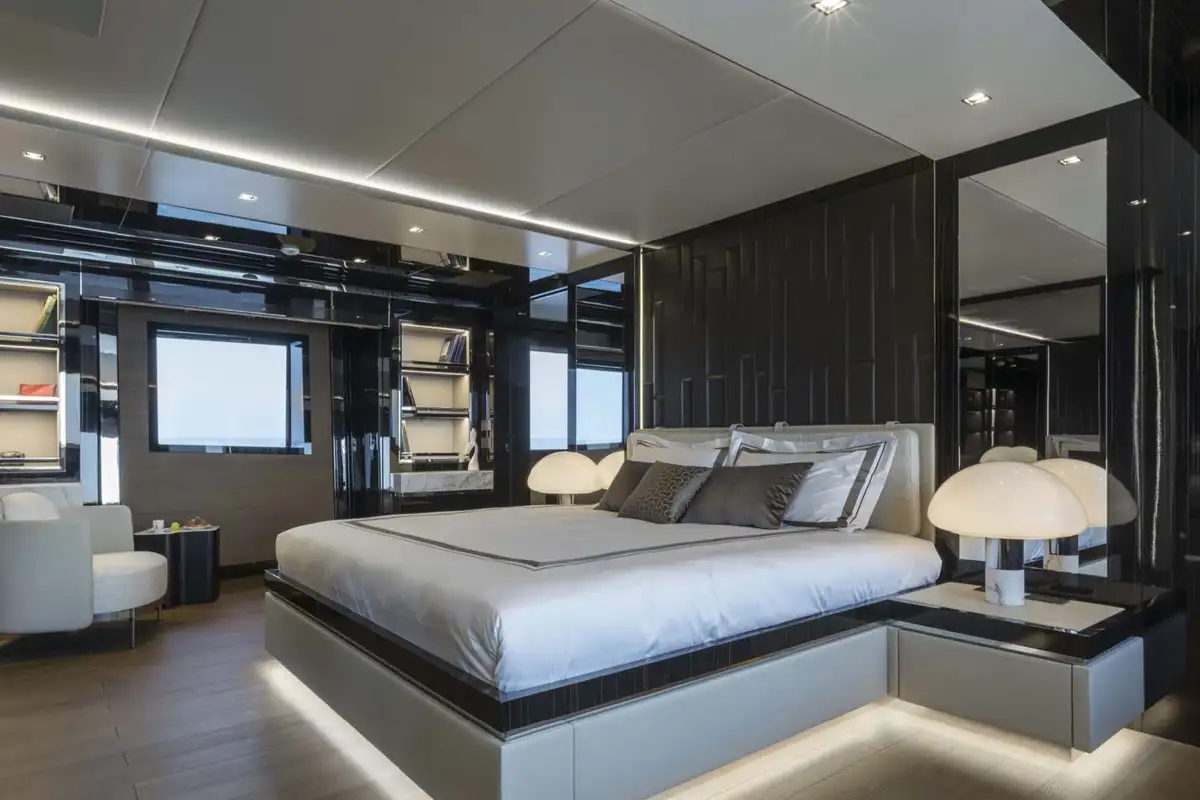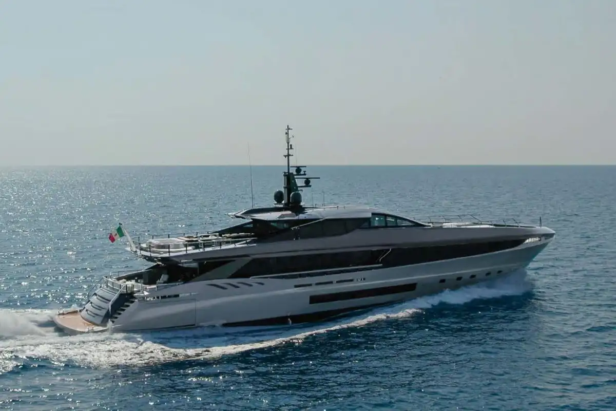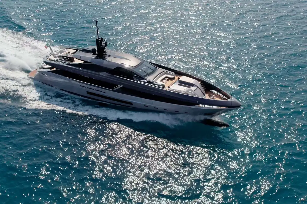 RR is an all-aluminium semi-displacement superyacht by Overmarine Group. Each GRANDSPORT 45 is designed with naval architecture and exterior styling by Alberto Mancini, and each interior can be completely personalized dependent on the owner’s choice. The accommodation spaces can sleep a maximum of 12 guests across five cabins. She accommodates seven crew in five crew cabins.