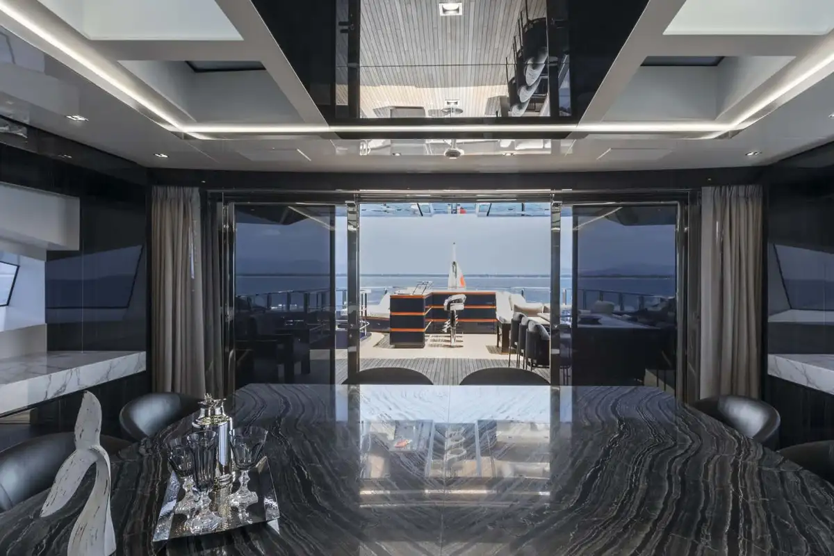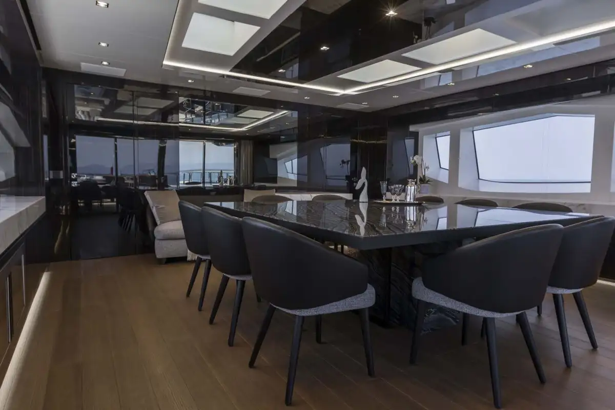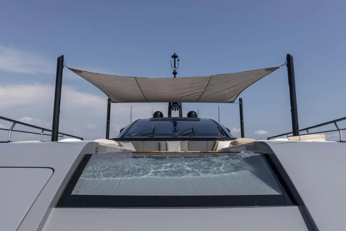 Numerous sunbathing areas are provided including the upper deck aft, which is covered in sun pads and a sofa placed on opposite sides. The foredeck boasts a C-shaped sofa surrounding a drinks table and further forward you will find a double sun pad on either side of the entrance to a jacuzzi.