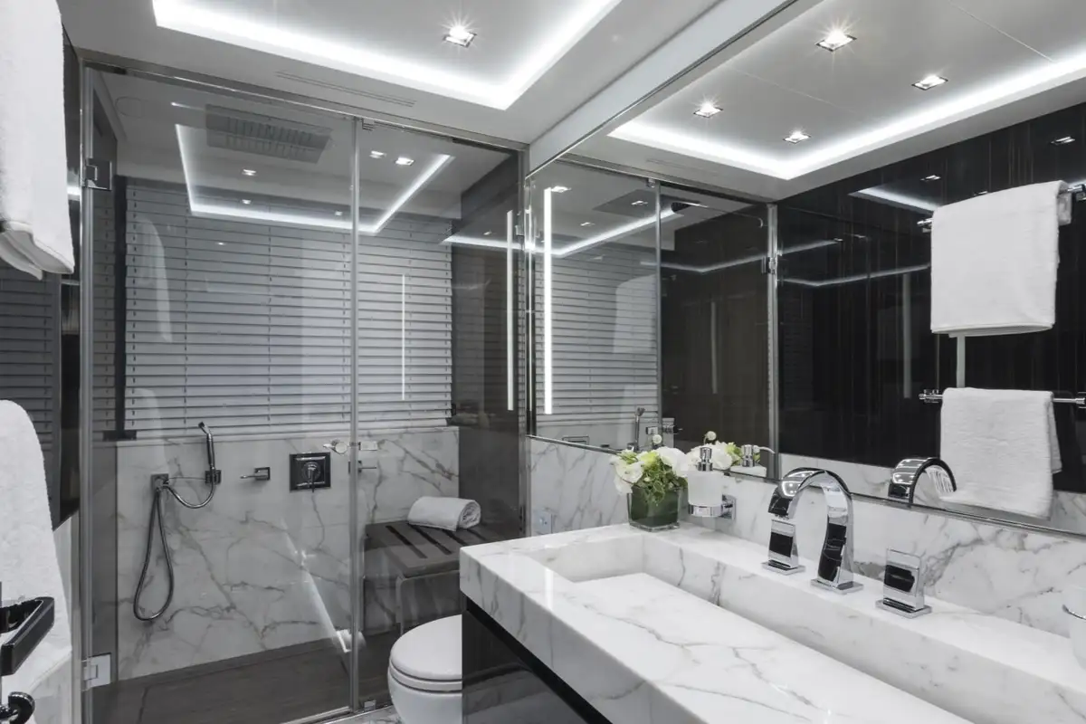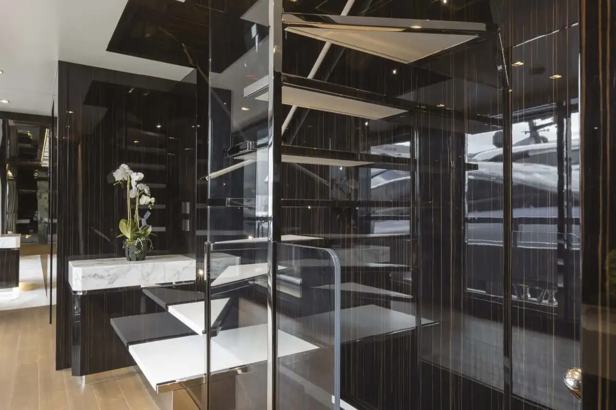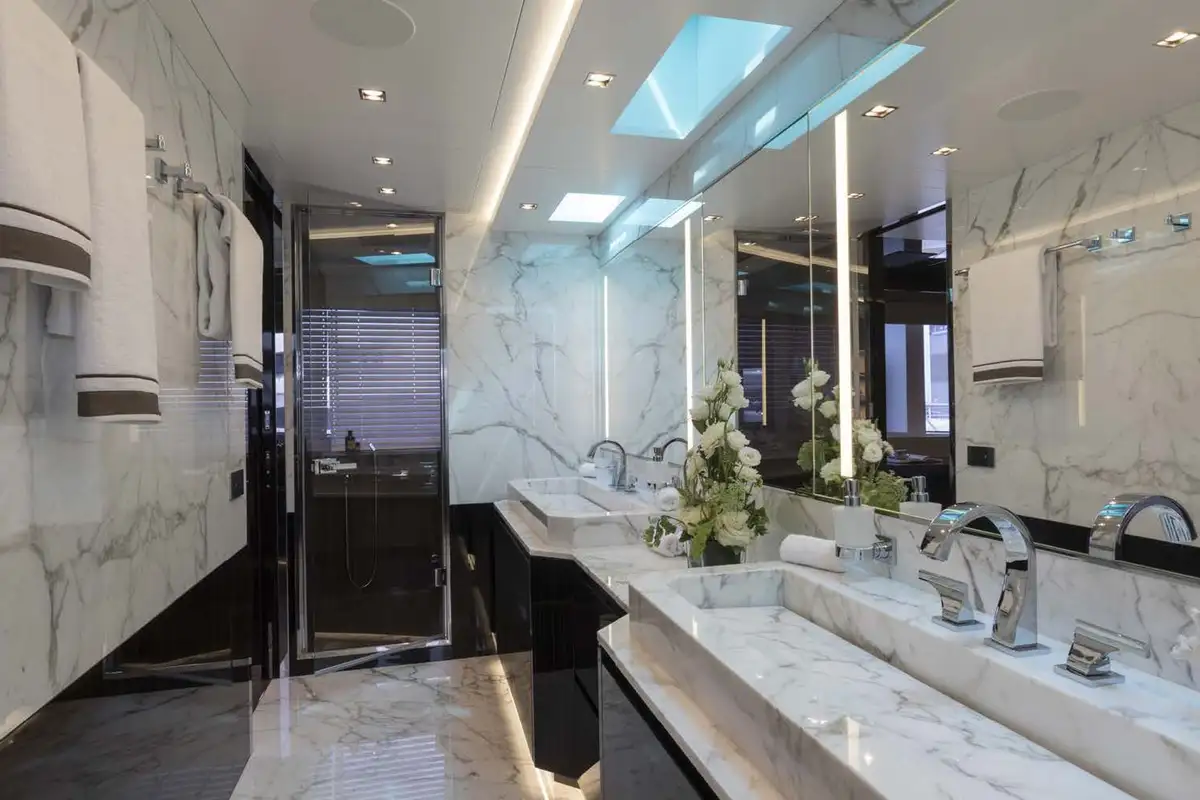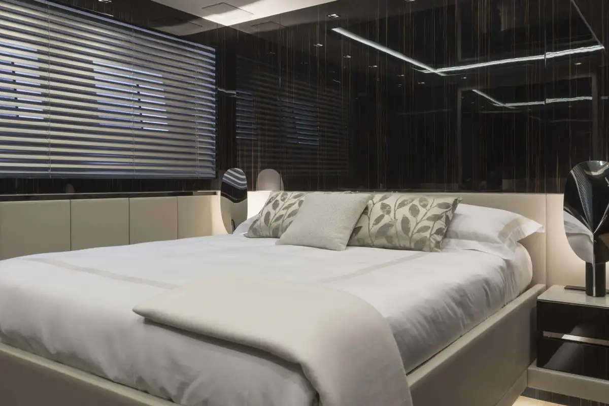 Numerous sunbathing areas are provided including the upper deck aft, which is covered in sun pads and a sofa placed on opposite sides. The foredeck boasts a C-shaped sofa surrounding a drinks table and further forward you will find a double sun pad on either side of the entrance to a jacuzzi.