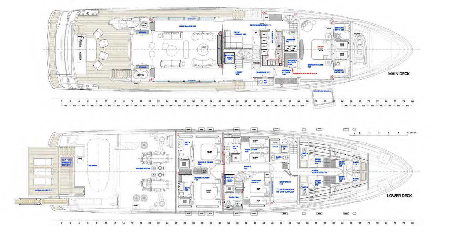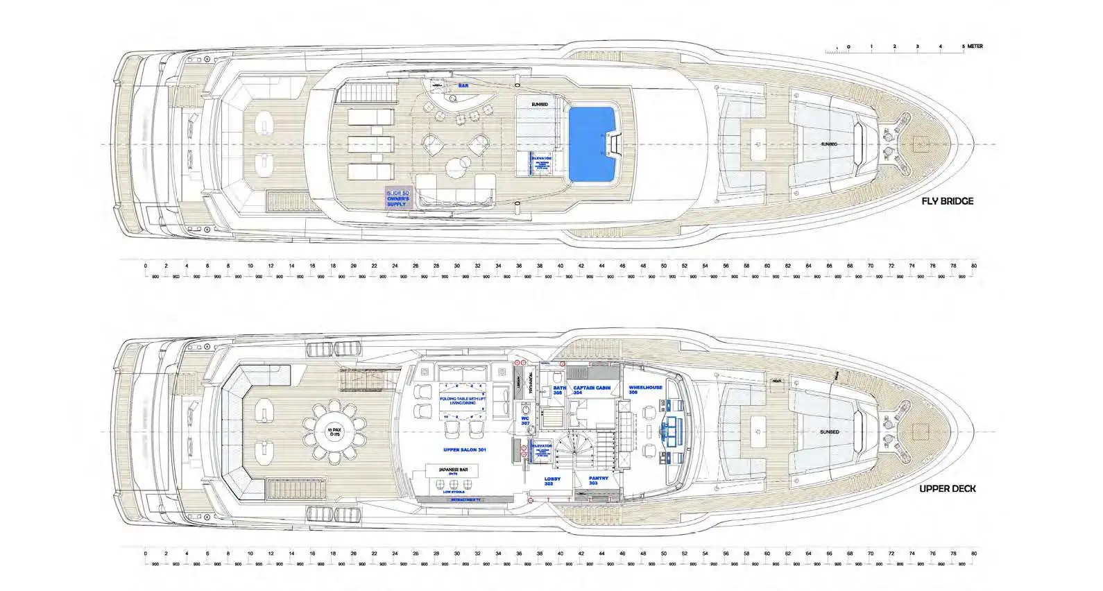 Her exterior features three expansive deck, providing an abundance of open air spaces. The sundeck offers a jacuzzi, bar, and large sunpad. Her upper deck includes an al fresco dining space, while her main deck provides a sheltered aft lounge.