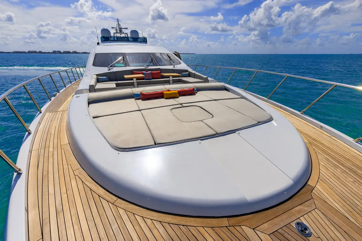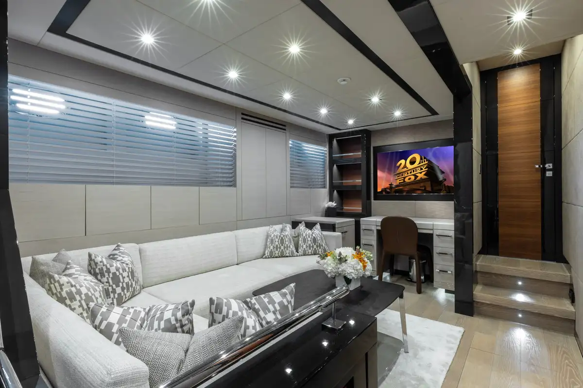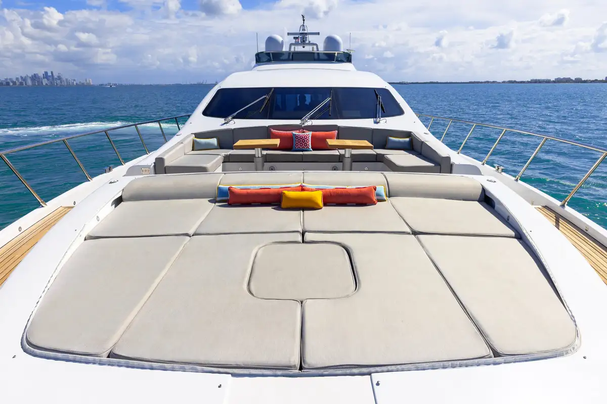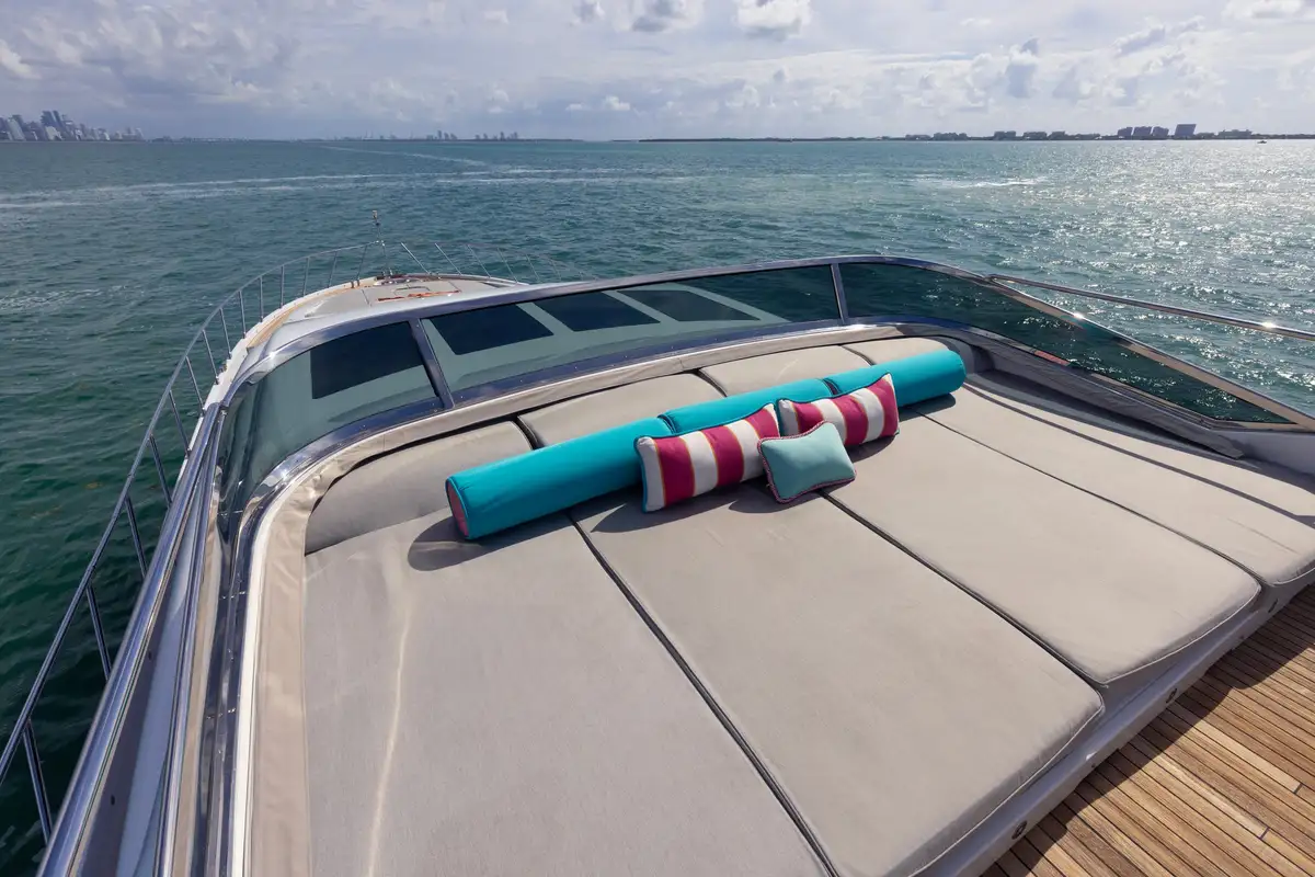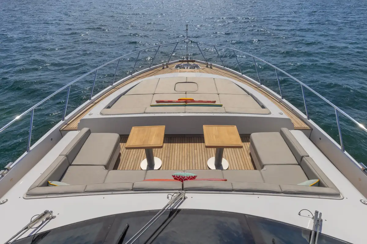 On the main deck, SAYONARA's layout flows effortlessly from the bow to the stern, with multiple spaces designed for entertainment and relaxation. Guests will enjoy ample seating both indoors and out, allowing for an effortless transition between socializing and private moments. The main deck aft is home to a large, stylish al fresco dining area, ideal for enjoying gourmet meals while surrounded by panoramic views. A spacious sun pad invites guests to soak up the sun, offering the perfect spot for lounging and taking in the surroundings. Forward, on the expansive foredeck, a wrap-around couch and another large sun pad await, creating an inviting space for relaxation or enjoying the fresh sea breeze. Inside, the main deck lounge is thoughtfully designed with a dining table for four, a comfortable wrap-around sofa, and a well-equipped bar towards the aft. A highlight of SAYONARA is her expansive flybridge, offering 360-degree, unobstructed views, providing an unrivaled perspective of the surroundings and ensuring a breathtaking experience wherever she sails.