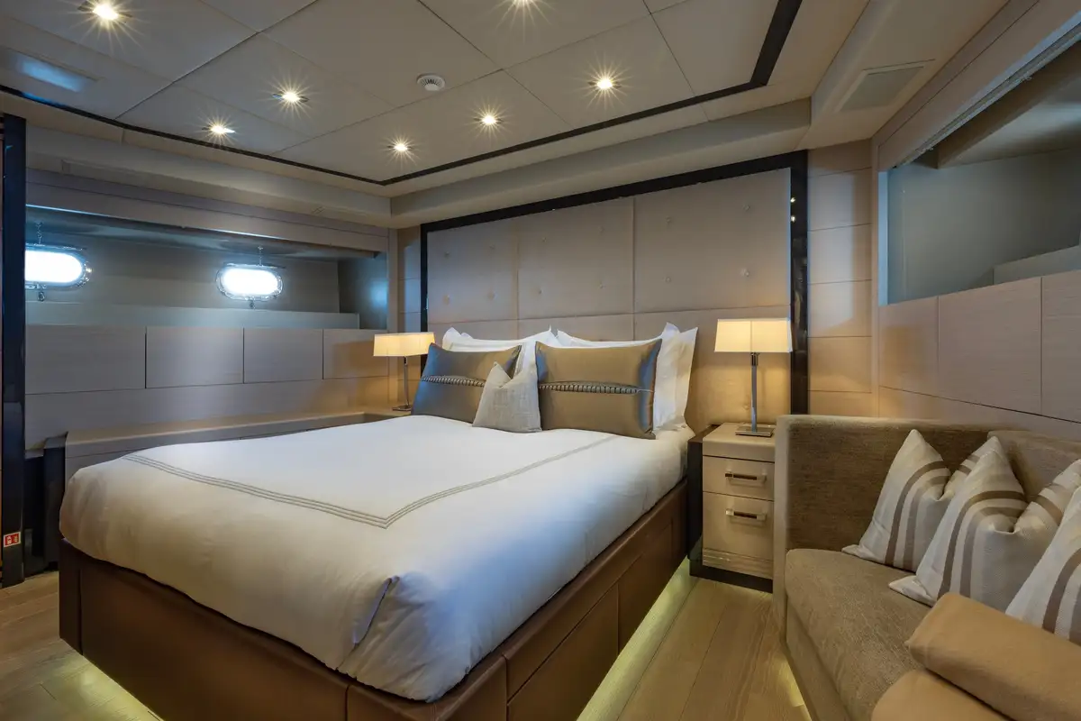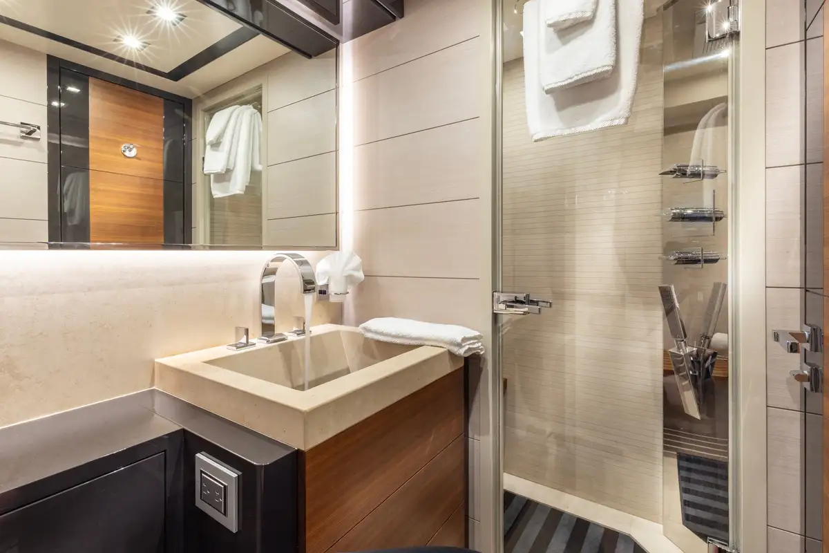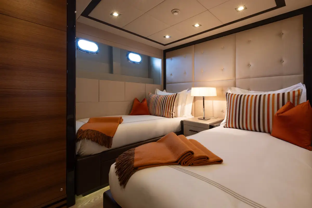 Designed to provide ultimate comfort and privacy, SAYONARA accommodates up to six guests in three beautifully appointed cabins, all located on the lower deck. The full-beam master suite is a true sanctuary, bathed in natural light from large windows on either side, creating an inviting and airy atmosphere. The master cabin features a luxurious en suite with dual sinks and a spacious glass-enclosed shower. In addition to the master suite, the lower deck offers a sophisticated lounge area, a well-appointed double cabin, and a versatile twin cabin, making SAYONARA the perfect choice for both families and couples seeking comfort and relaxation.