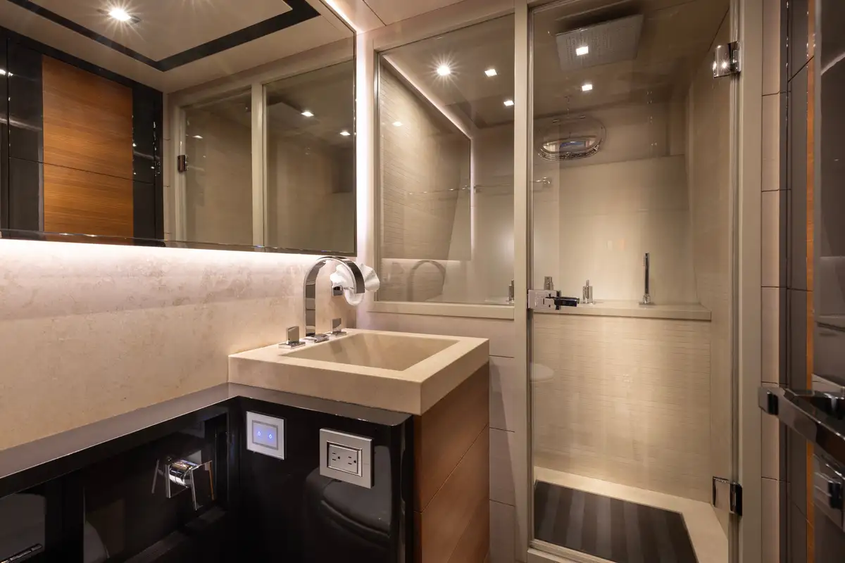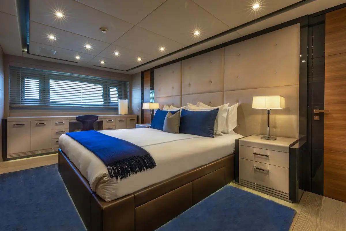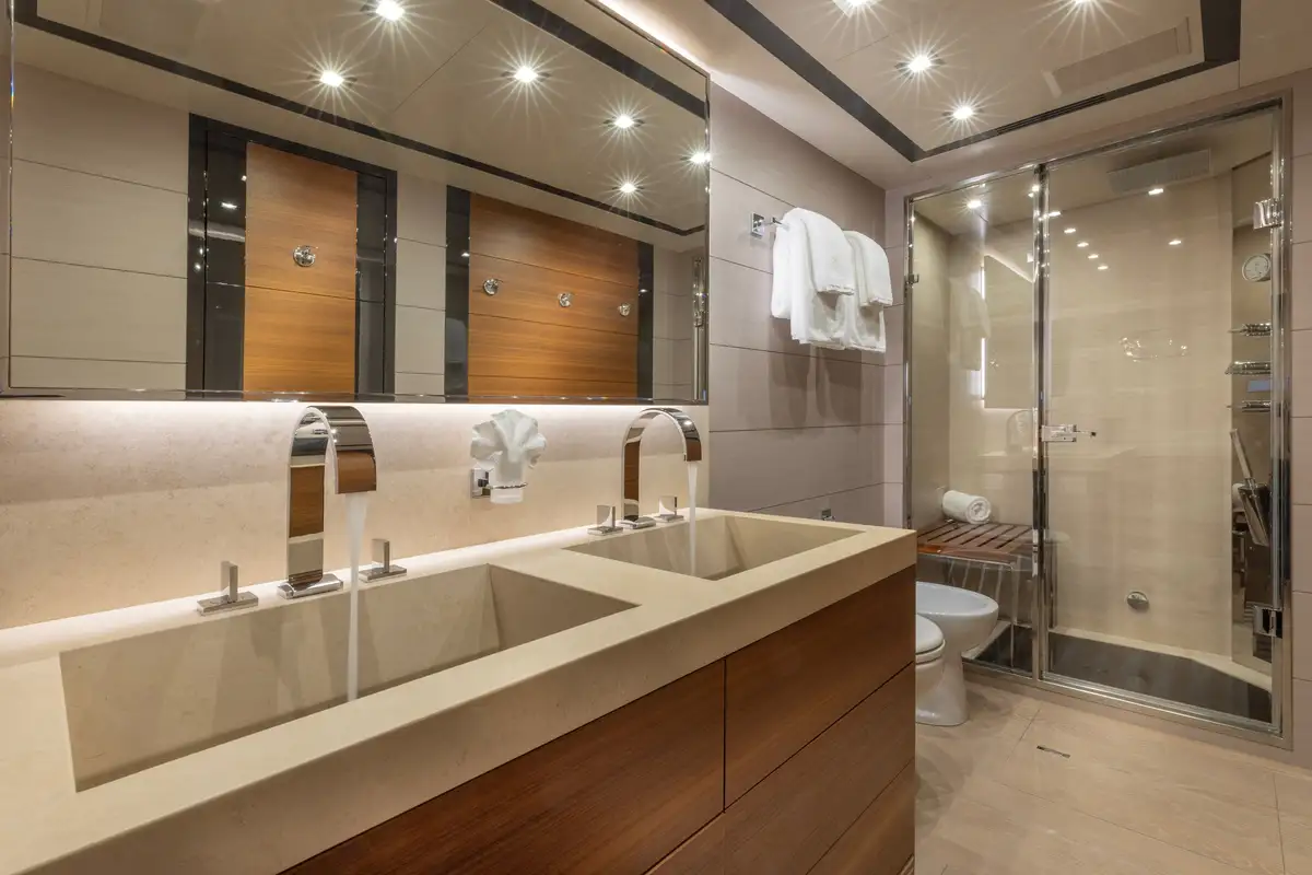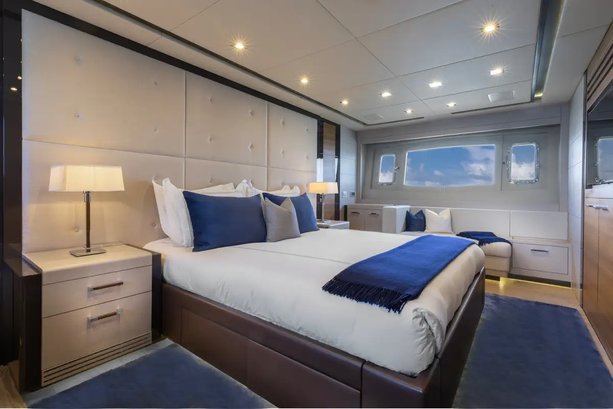 Designed to provide ultimate comfort and privacy, SAYONARA accommodates up to six guests in three beautifully appointed cabins, all located on the lower deck. The full-beam master suite is a true sanctuary, bathed in natural light from large windows on either side, creating an inviting and airy atmosphere. The master cabin features a luxurious en suite with dual sinks and a spacious glass-enclosed shower. In addition to the master suite, the lower deck offers a sophisticated lounge area, a well-appointed double cabin, and a versatile twin cabin, making SAYONARA the perfect choice for both families and couples seeking comfort and relaxation.