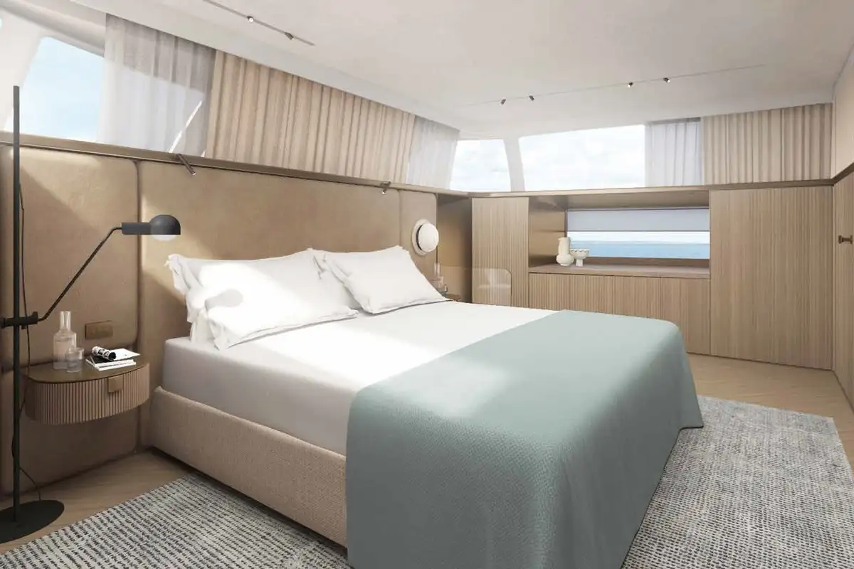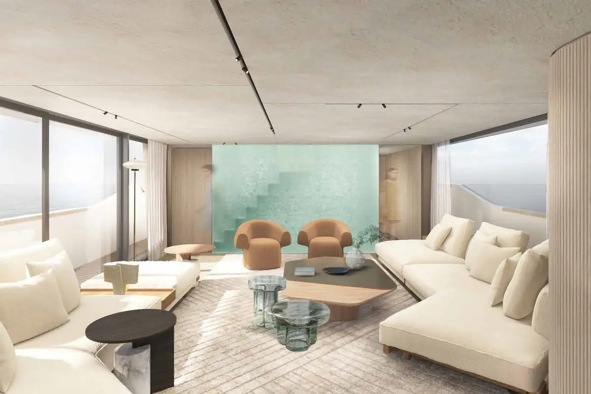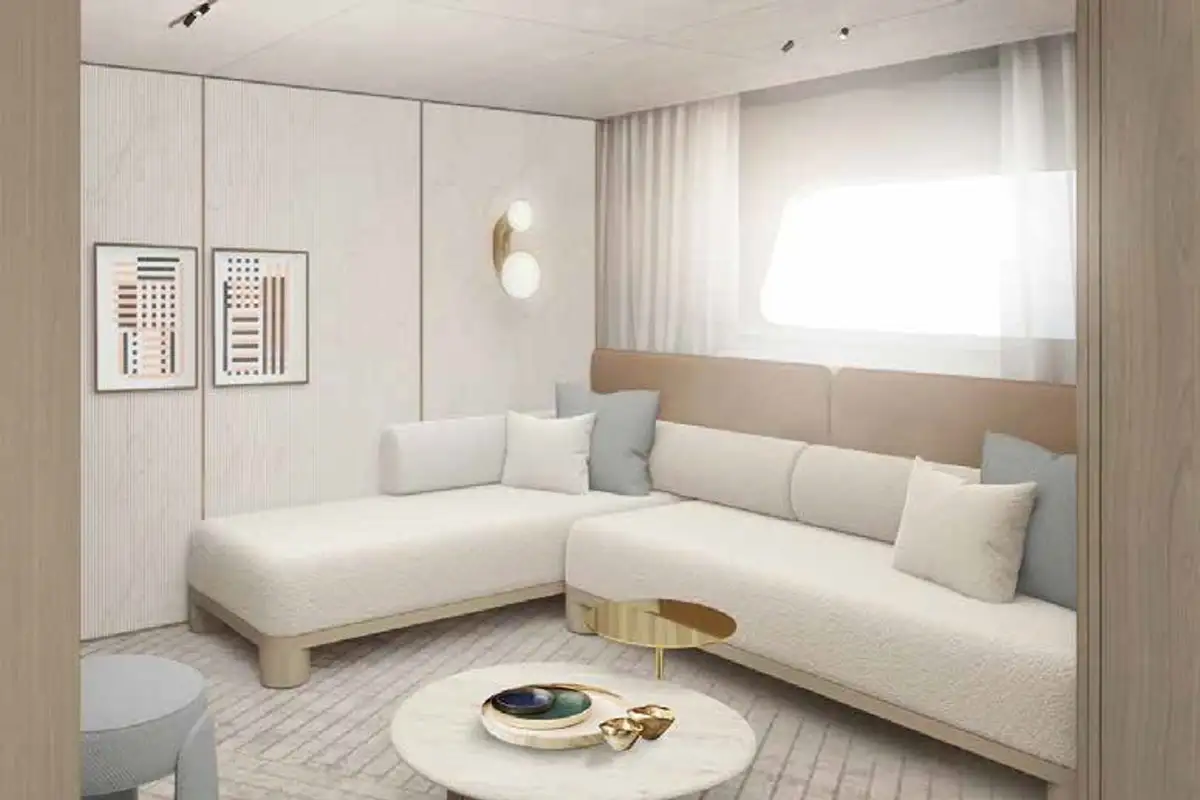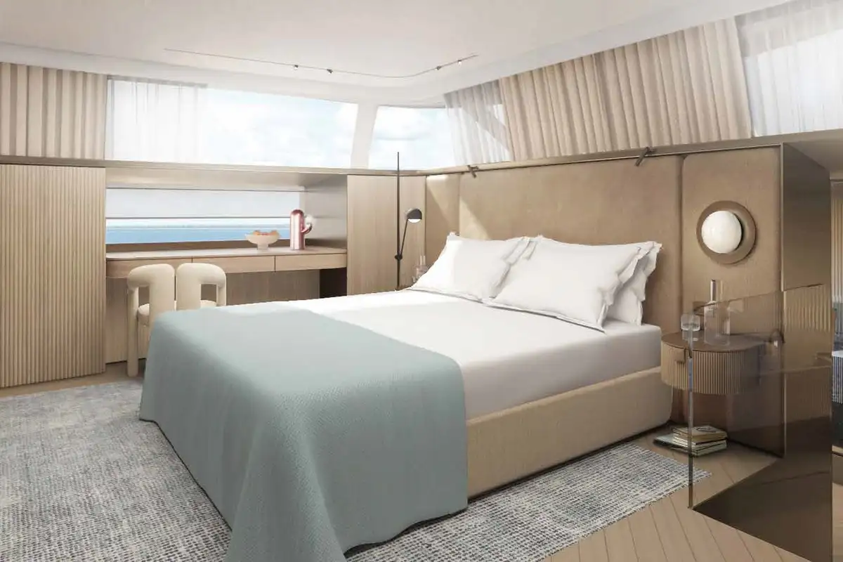 The interior design of the SD90/s is made by Patricia Urquiola. This is her third collaboration with Sanlorenzo. The flexibility of the interior of the SD90/s allows the yacht to adapt to the different needs of those who live it, evolving and transforming itself through unprecedented solutions of furnishings and configurations. The layout of the saloon on the main deck makes it possible to have both a lounge and dining area, solutions typically found on larger yachts, thanks to the use of tables that can be transformed in height and comfortable sofas, an interesting choice for convivial moments. The lower deck can be transformed – the space in front of the descent staircase is a lounge area that, if necessary, can be closed off and become a private cabin in which the sofa is converted into a bed.