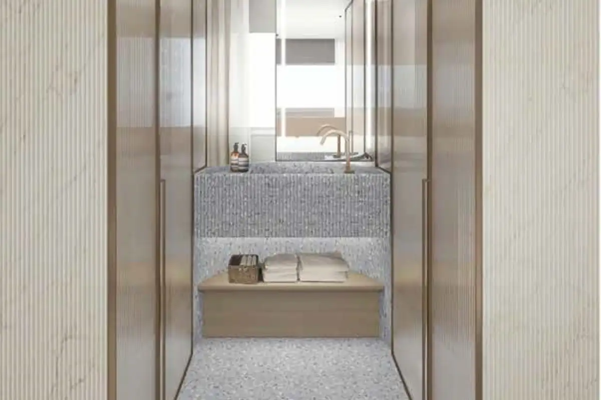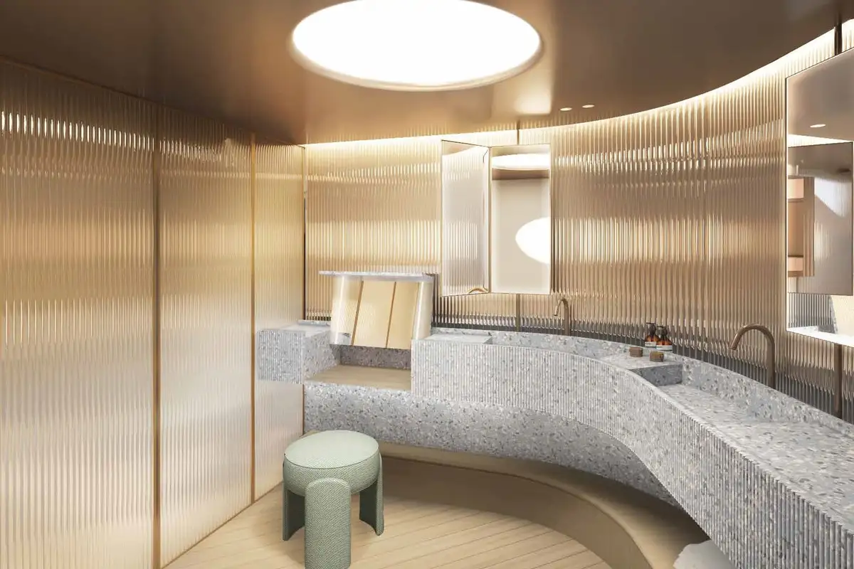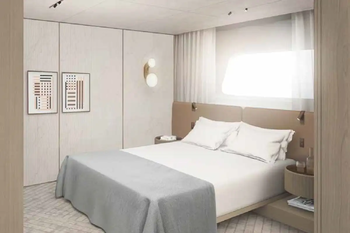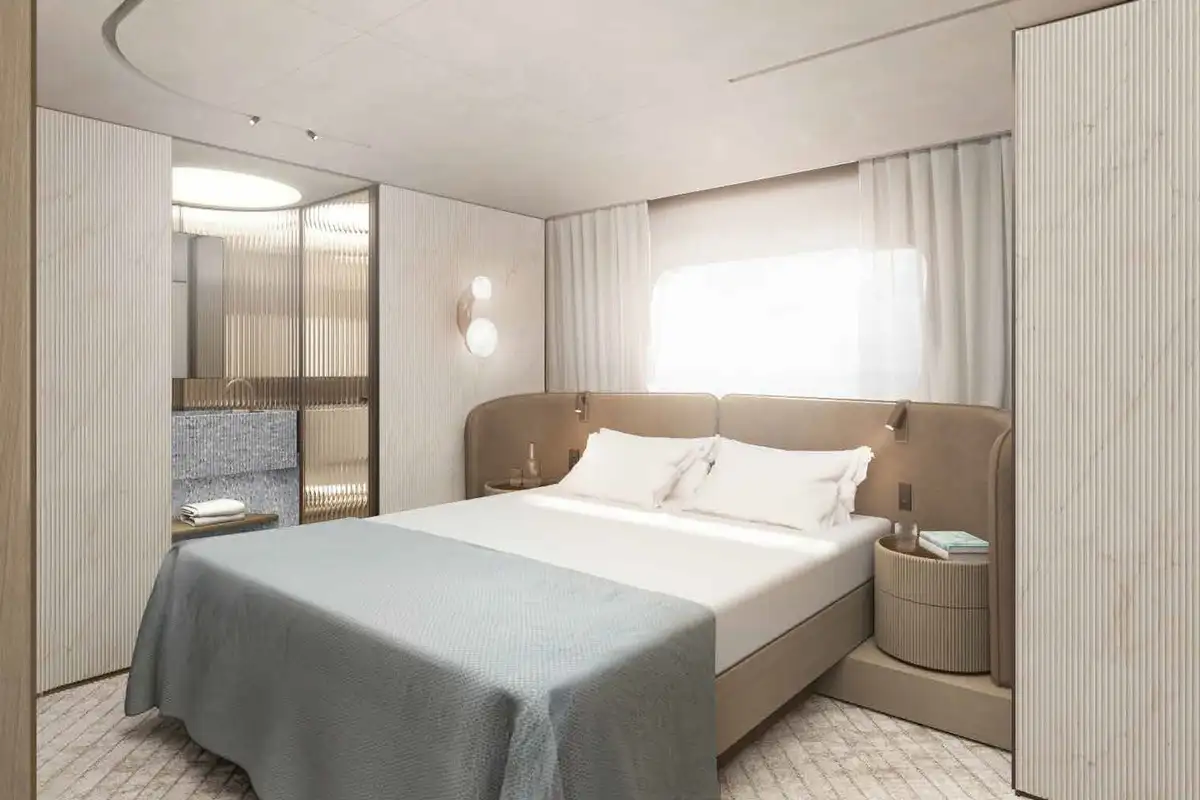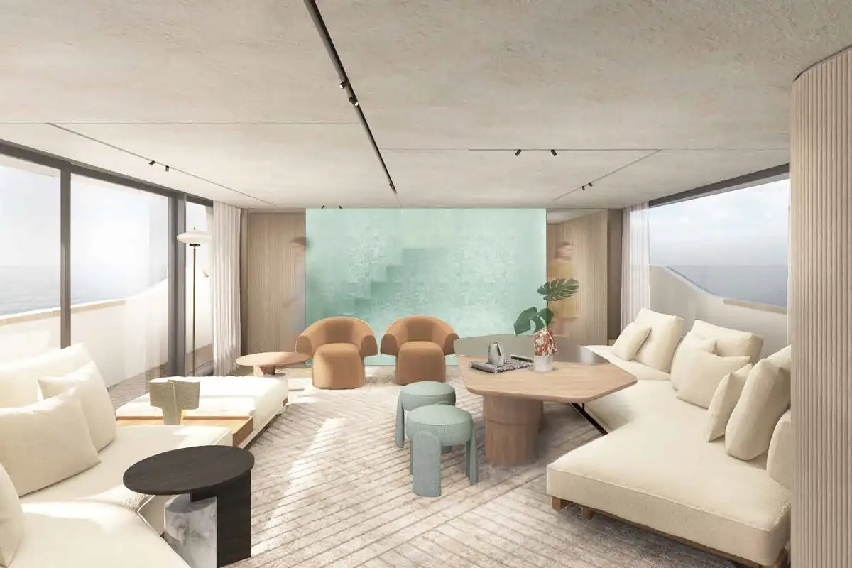 The interior design of the SD90/s is made by Patricia Urquiola. This is her third collaboration with Sanlorenzo. The flexibility of the interior of the SD90/s allows the yacht to adapt to the different needs of those who live it, evolving and transforming itself through unprecedented solutions of furnishings and configurations. The layout of the saloon on the main deck makes it possible to have both a lounge and dining area, solutions typically found on larger yachts, thanks to the use of tables that can be transformed in height and comfortable sofas, an interesting choice for convivial moments. The lower deck can be transformed – the space in front of the descent staircase is a lounge area that, if necessary, can be closed off and become a private cabin in which the sofa is converted into a bed.