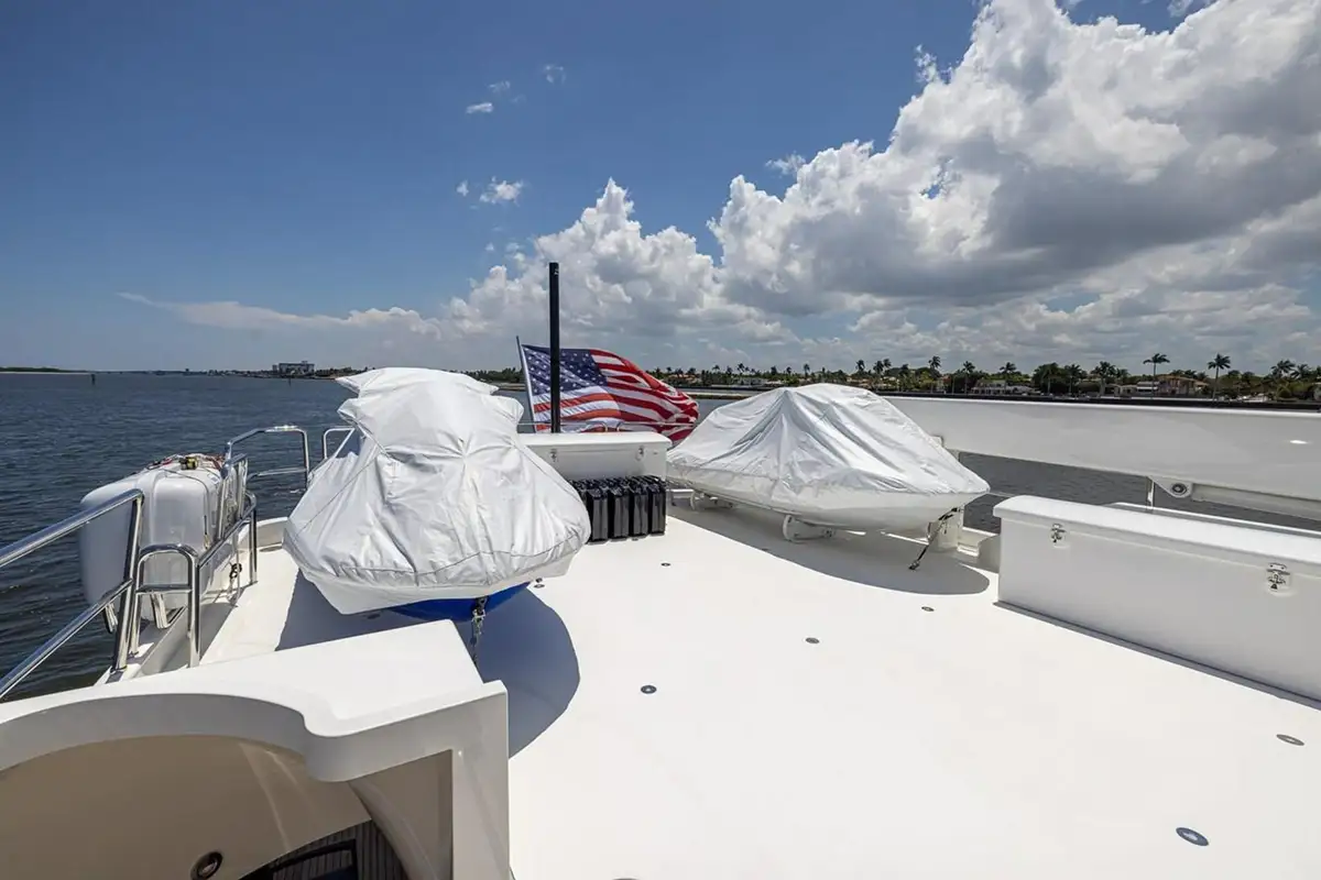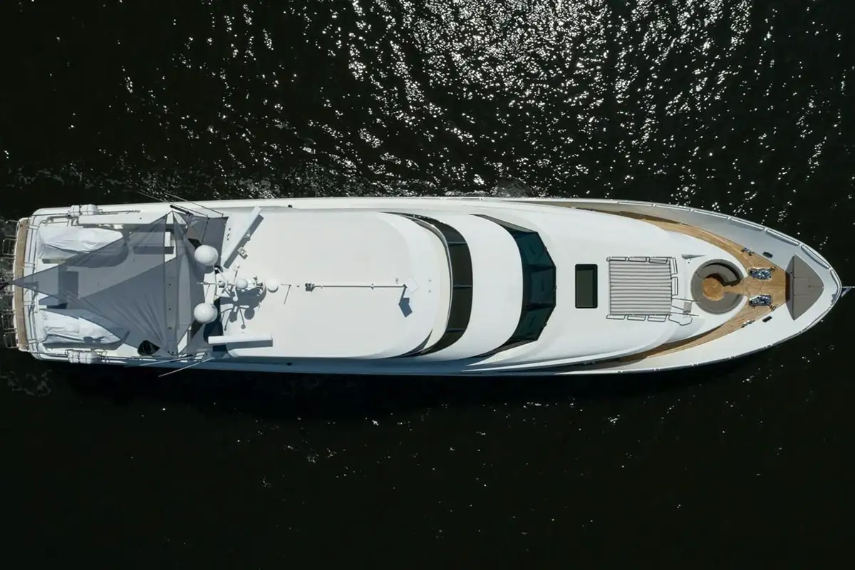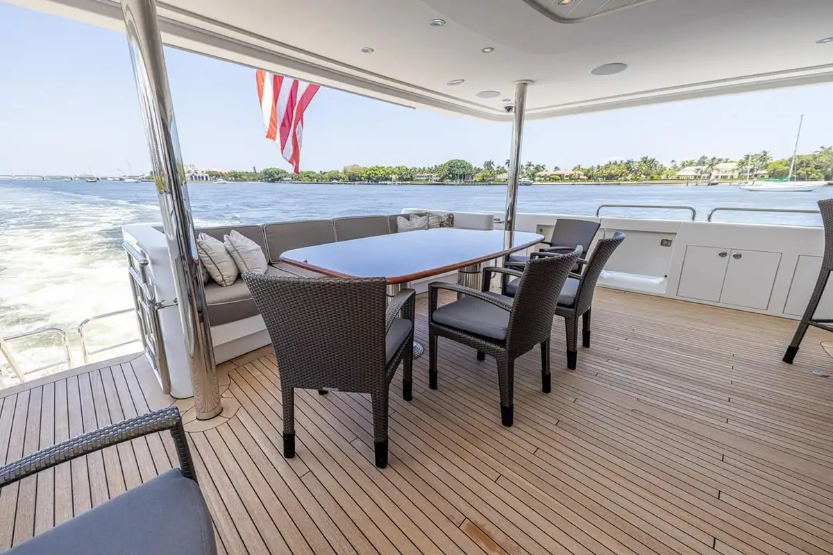 Her outdoor spaces begin with a large welcoming swim platform which provides an easy tender dock. Seven removable stainless steel railings provide safety and security while underway and at anchor. The main deck aft is fully covered and perfect for an al fresco dining experience with a glossy teak table, seating for up to eight guests, an outdoor TV, and a wet bar with bar stools. Her flybridge is designed for both navigation and entertainment with panoramic views over the bow and stern. To port is a full granite-top wet bar and bar stools, Sub-Zero refrigerator drawers, and a BBQ. To starboard is a large L-shaped bench and teak coffee table. Further aft onto the boat deck, guests will find a jacuzzi and a large sun pad. For guests who enjoy sunbathing and fantastic views over the bow, they can find comfort on the foredeck lounge