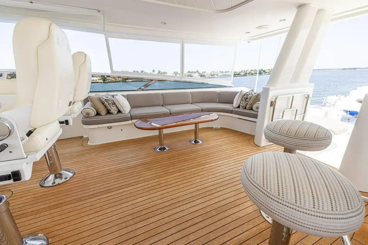 Her interior showcases a large and luxurious main salon designed with Mahogany cabinetry. With windows running the length of the space on both port and starboard, the views of the outdoors can be enjoyed from the inside. The main salon features an oversized sofa, loveseat, armchair, coffee table, a game table, and a starboard side bar. While underway, guests can enjoy comfortable seating on the starboard side settee located in the bridge