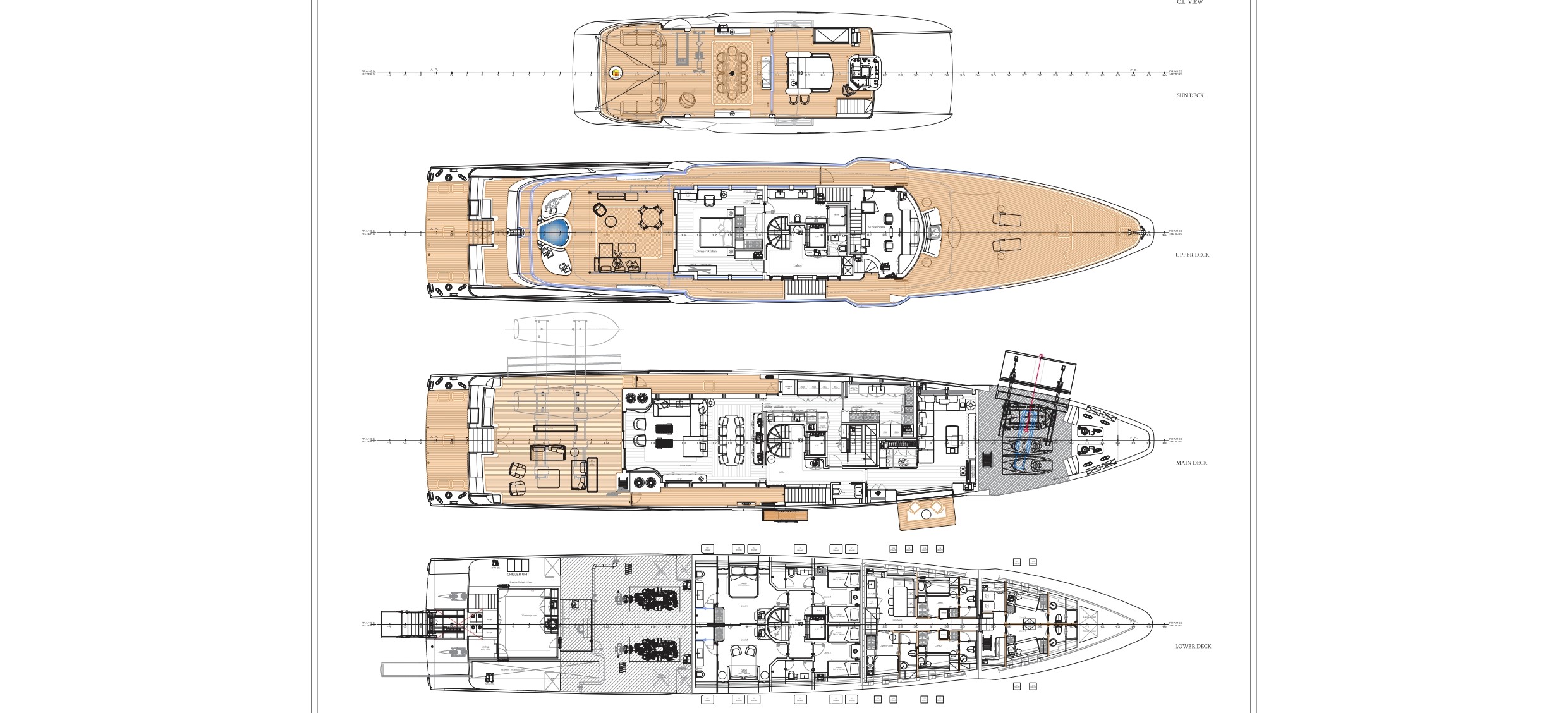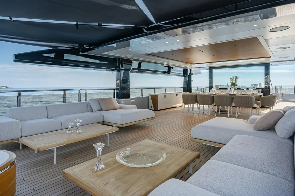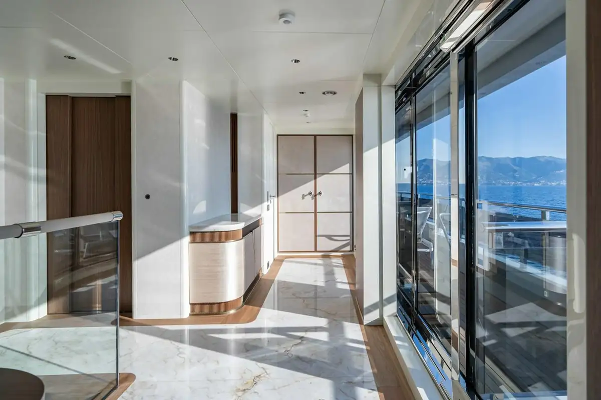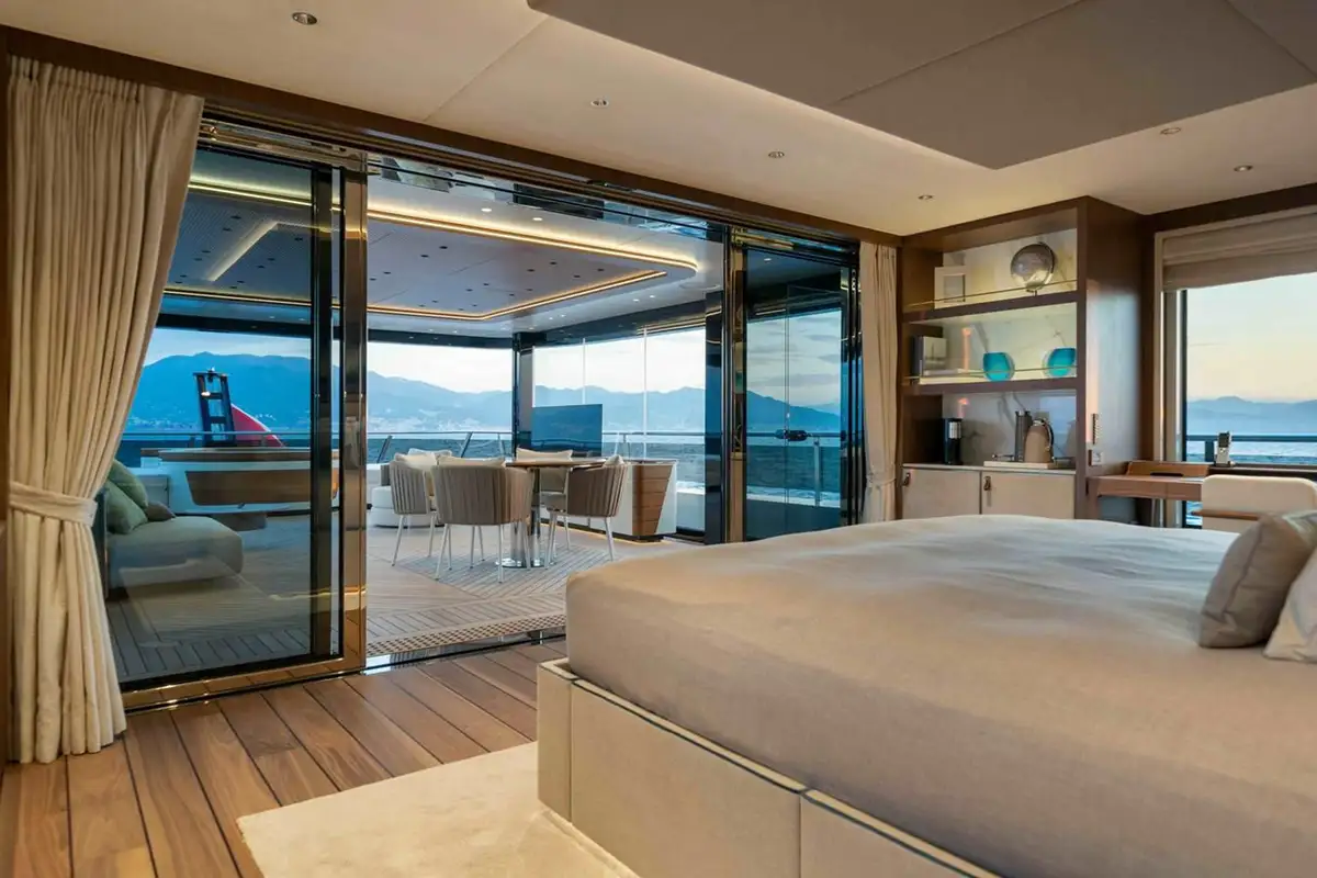 SERENISSIMA I’s standout feature is her impressive array of outdoor spaces, thoughtfully designed for both relaxation and entertainment. The sundeck is truly exceptional, featuring a large jacuzzi forward, an al fresco dining table for ten, and a U-shaped aft lounge surrounding a cozy fireplace - ideal for unwinding while taking in the panoramic views. The upper deck offers a private owner’s retreat, complete with an aft-facing jacuzzi flanked by two spacious sunpads. This area includes a protected partially glass enclosed lounge with a TV, seating area, and a dining table for four, connecting directly to the master suite. Wraparound walkways connect to the bow, where guests can relax in a forward seating area that can also be transformed, rather uniquely, into a picturesque boxing ring. The main deck aft houses the primary guest tender to port, with additional guest seating to starboard, leading down to a generous swim platform for easy water access.