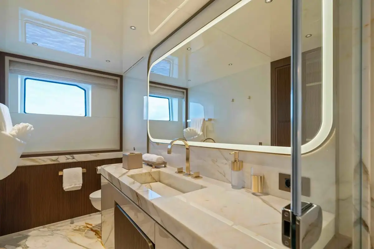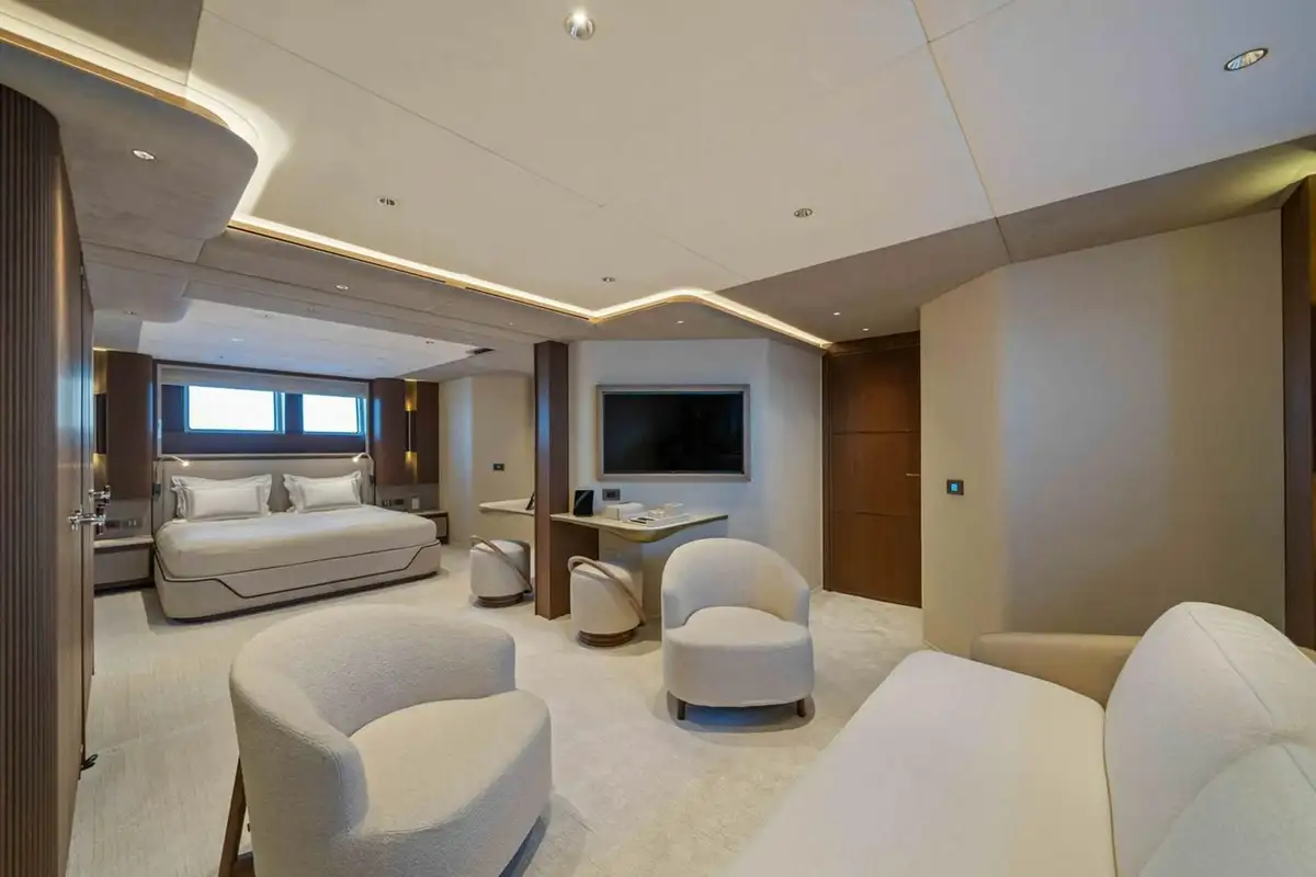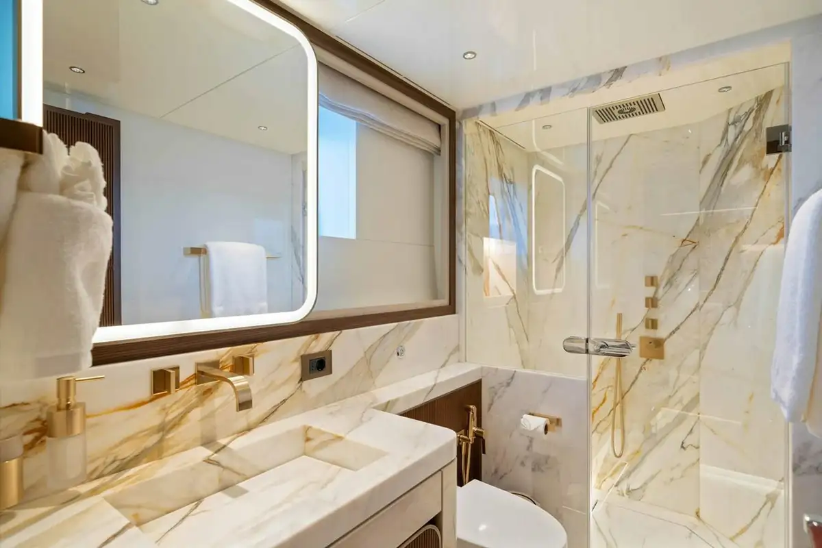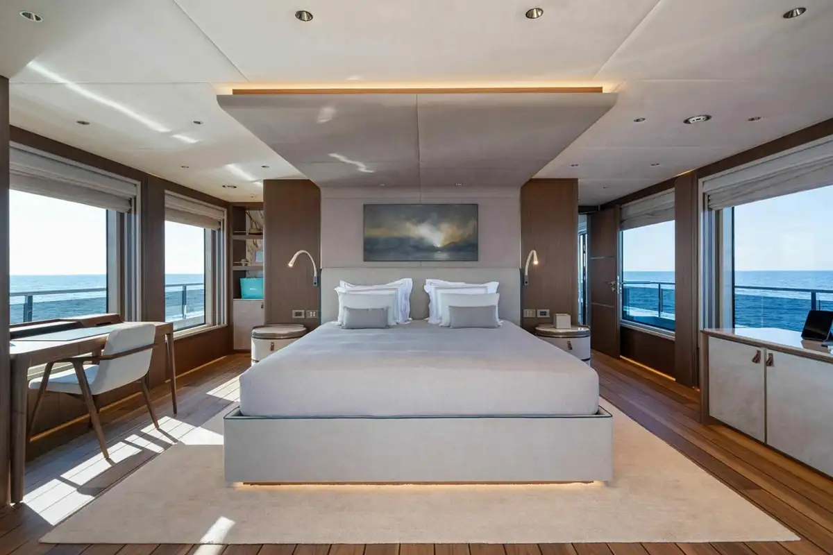 SERENISSIMA I’s contemporary interior is sure to impress as well, benefitting from plenty of natural light from the expansive windows. The main saloon aft features a spacious lounge area and a dining table that seats ten, connecting to a guest lobby and a sophisticated lounge area, which also serves as a cinema room. This elegant space includes a large walk-in wine cellar and a fold-down balcony, enhancing your connection to the sea. On the lower deck, guests are comfortably accommodated in four en suite cabins - two twins and two doubles, with the latter able to combine into a full-beam VIP cabin. The upper deck houses a spacious master suite surrounded by glass, opening directly onto the private owner’s deck, creating a secluded sanctuary with stunning sea views.