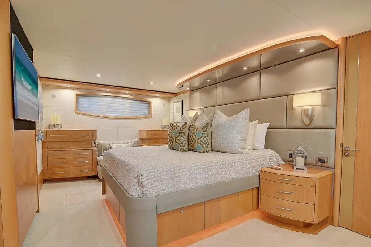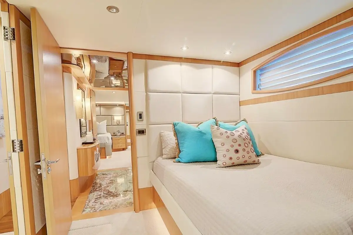 SERENITY offers you the ability to bring the entire extended family and guests with her five staterooms accommodating twelve. In addition you can be comfortable knowing you and your guests will be catered to by a crew of five from the crew quarters' three staterooms and separate crew lounge.