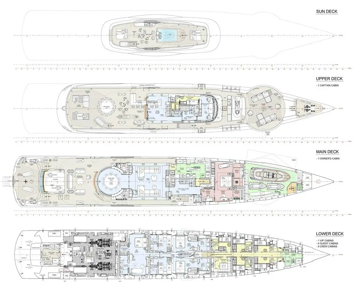 | Tenders | Garage designed for 1 x tender 7.0m max (OSE) + 2 x jetskis (OSE) Rescue tender bay (max LOA 3.4m) located on the Upper Deck forward |