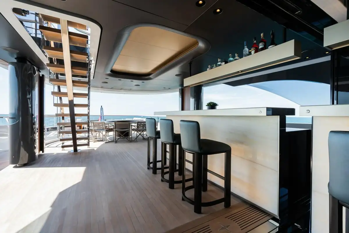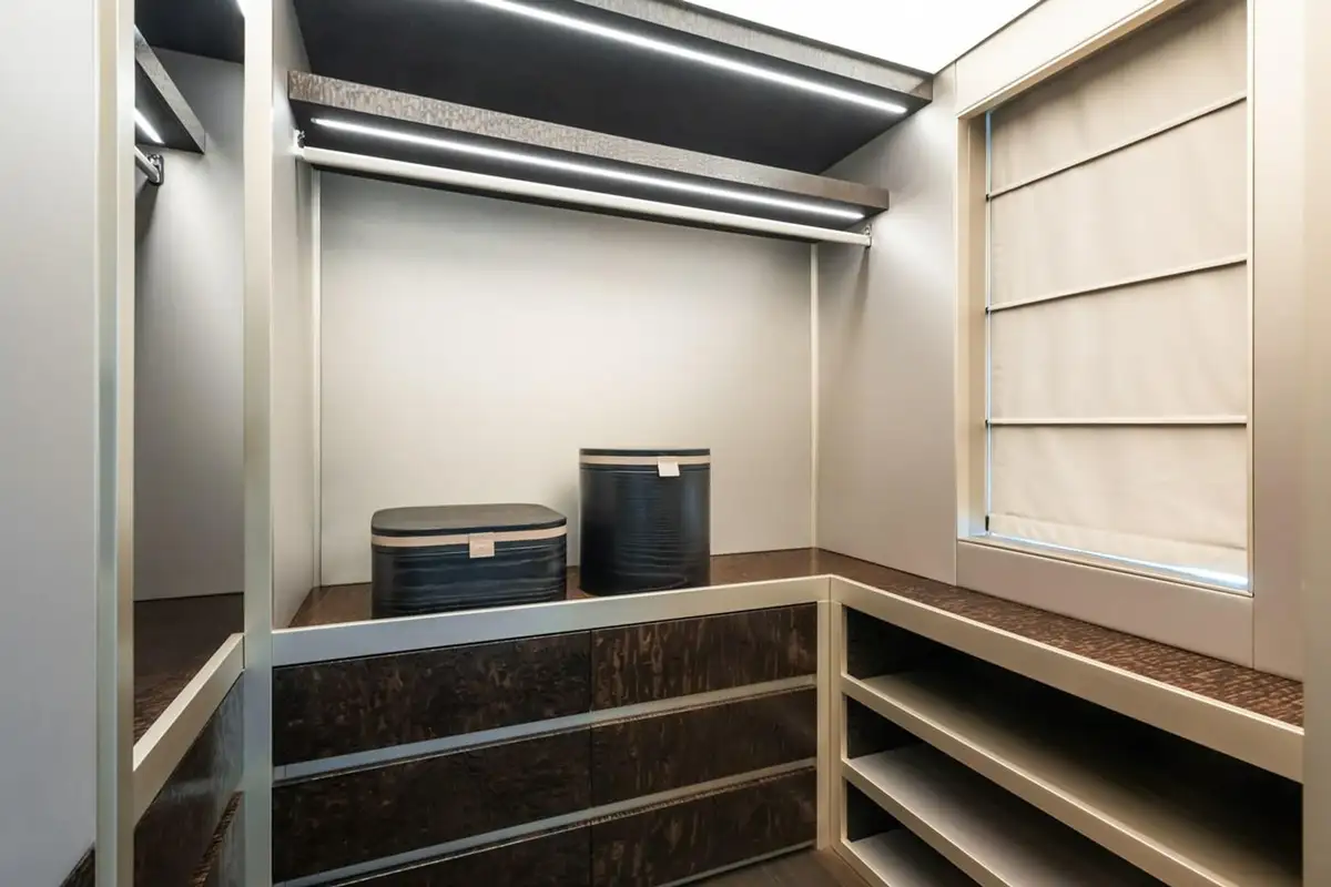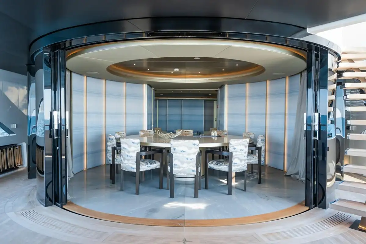 With 499GT of interior volume, she is designed to host up to 12 guests in six cabins with separate accommodation for the captain and 11 crew. The custom interior décor boasts furniture, fabrics, and materials sourced from the well-known Italian luxury fashion designer Armani. The main saloon is laid out with a formal dining space aft, featuring 270-degree panoramic views through full height windows, and the seating area forward, configured as a media lounge. The full beam owner’s suite is forward on the main deck with a separate dressing room and his and hers bathrooms.