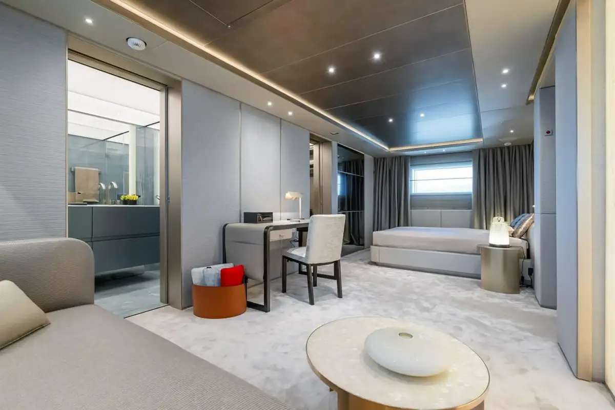 The head-turning contemporary exterior drawn by Italian Sea Group’s in-house designer Gian Marco Campanino includes some interesting innovations. She carries a circular touch and go helipad on her foredeck which also serves as a spacious and elegant forward sun deck with a commanding view – and there’s stowage under the sunpad cushions for a rescue tender.