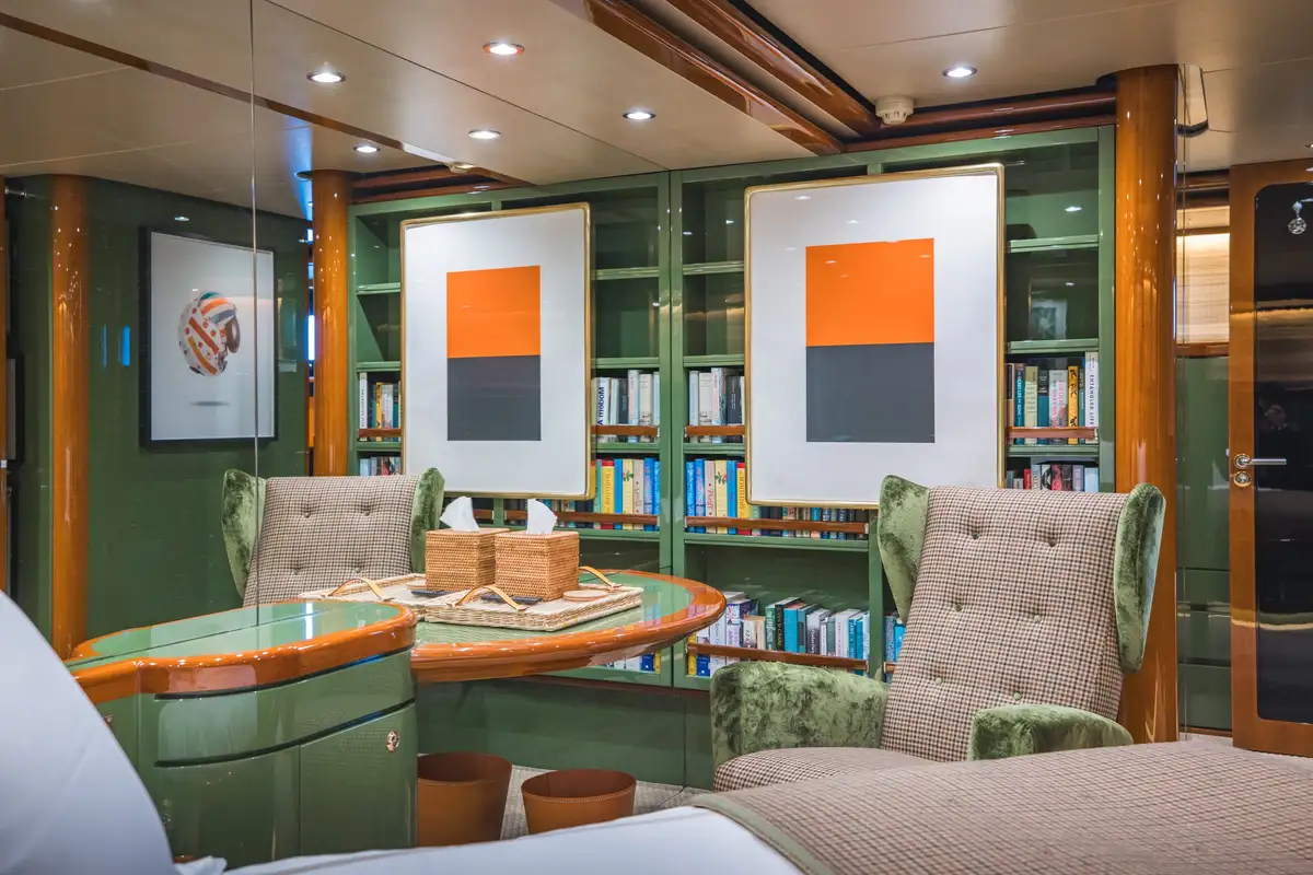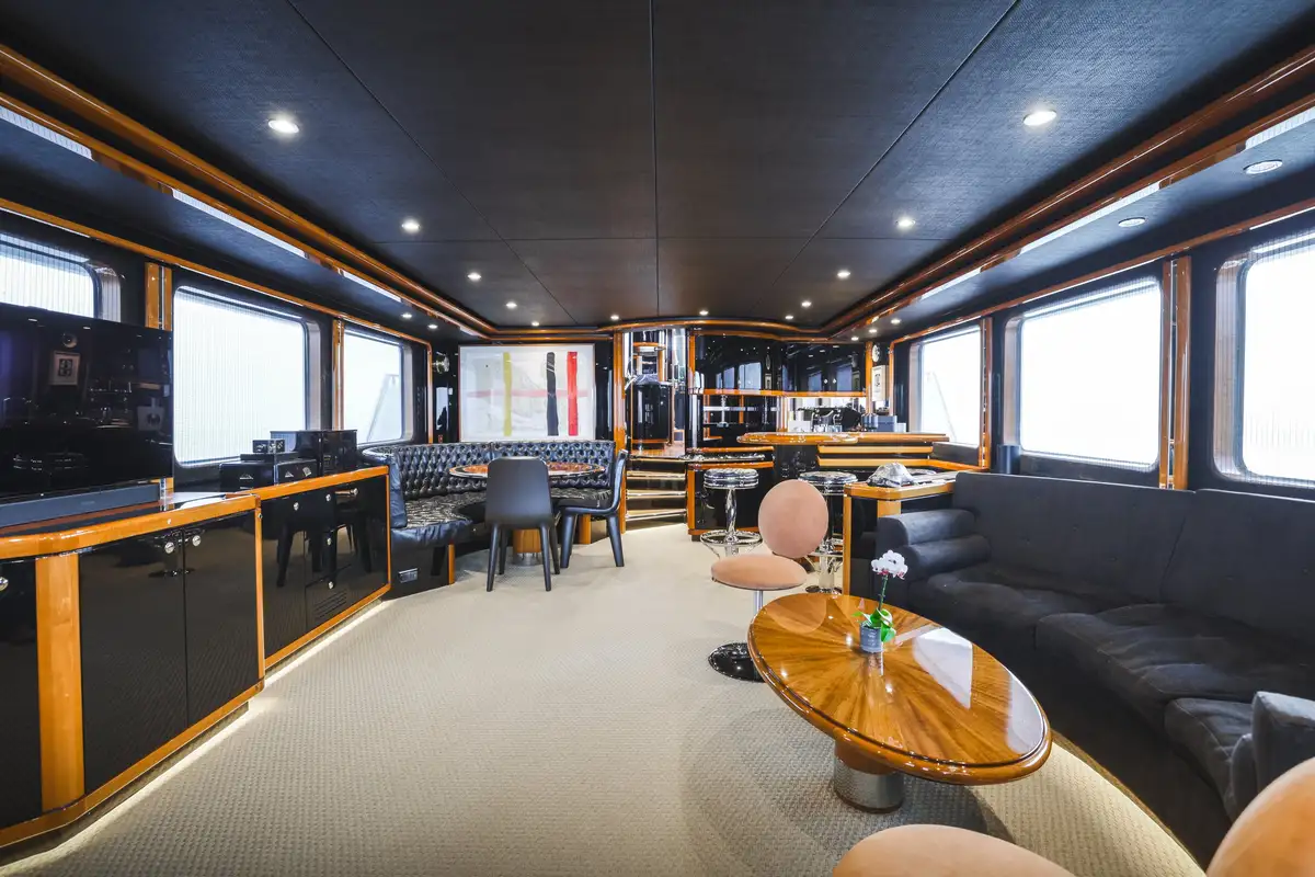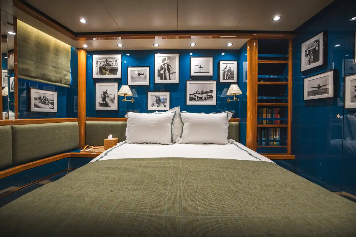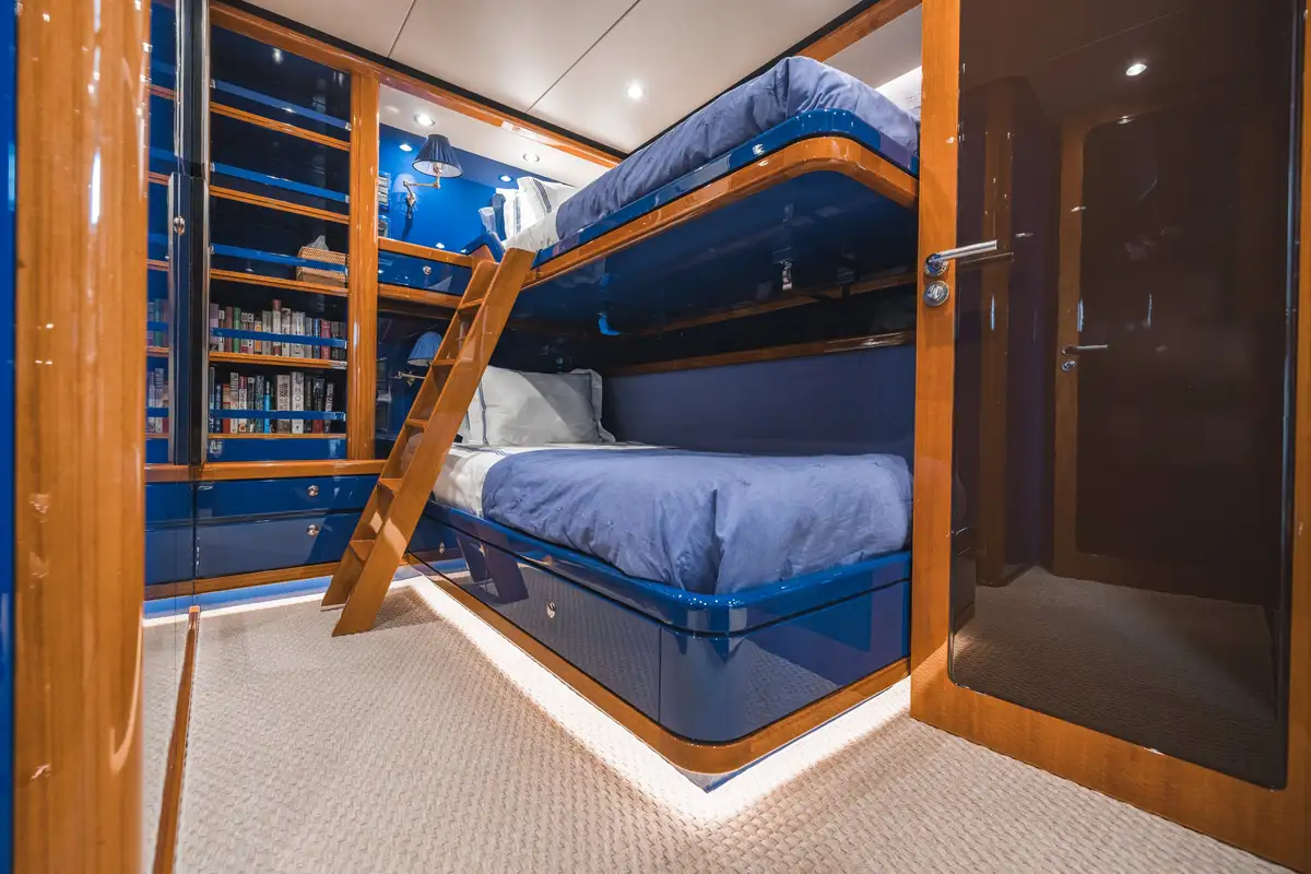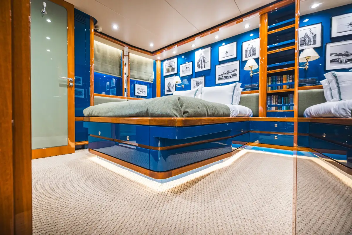 Inside, SLOW POKE has accommodation for 6 guests in 3 beautifully appointed cabins. SLOW POKE offers the ambience of a chic, high-end residence—complete with bold color palettes, cherry wood paneling, and luxurious retro finishes. From the glossy blues of the guest cabins to the Porsche-inspired tones in the master suite, every detail has been meticulously curated for a calming yet captivating onboard experience.