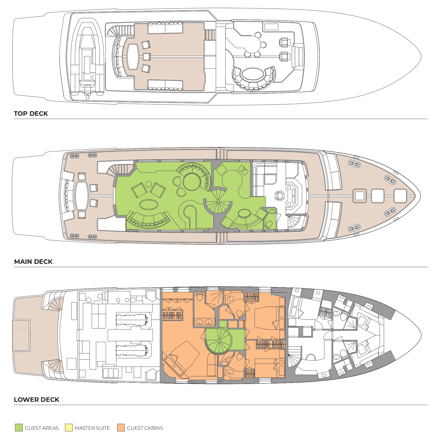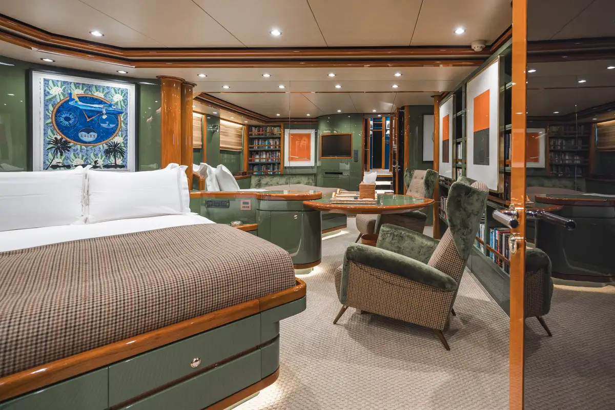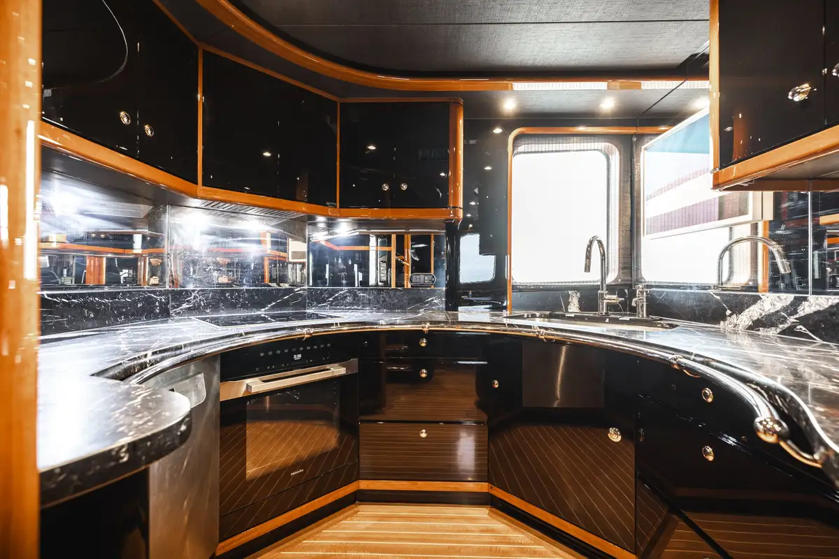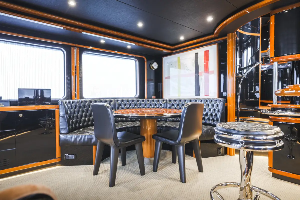 Inside, SLOW POKE has accommodation for 6 guests in 3 beautifully appointed cabins. SLOW POKE offers the ambience of a chic, high-end residence—complete with bold color palettes, cherry wood paneling, and luxurious retro finishes. From the glossy blues of the guest cabins to the Porsche-inspired tones in the master suite, every detail has been meticulously curated for a calming yet captivating onboard experience.