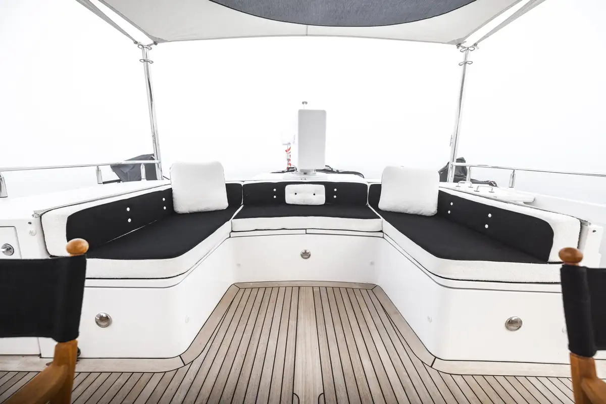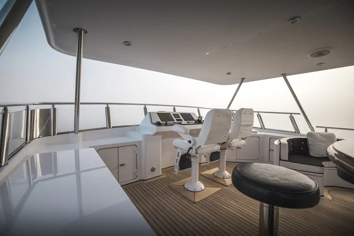- Split level flybridge with bar and dining area