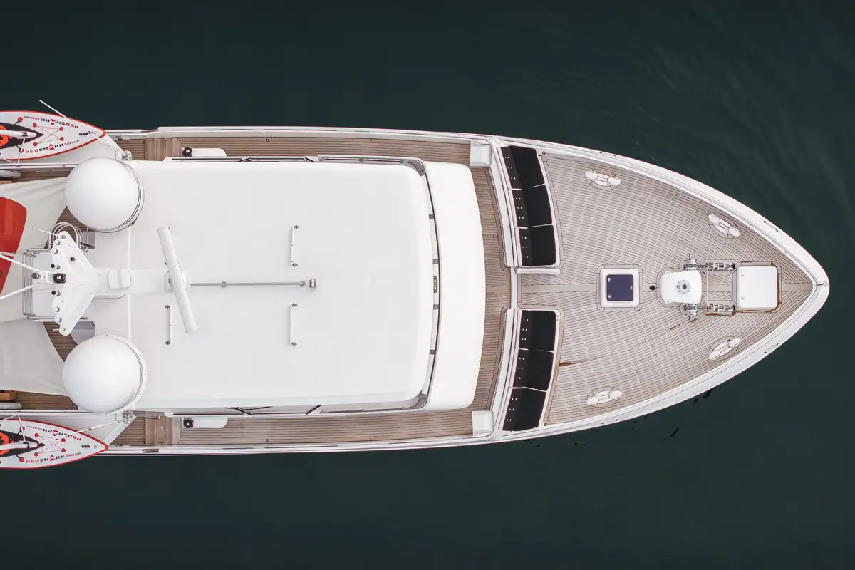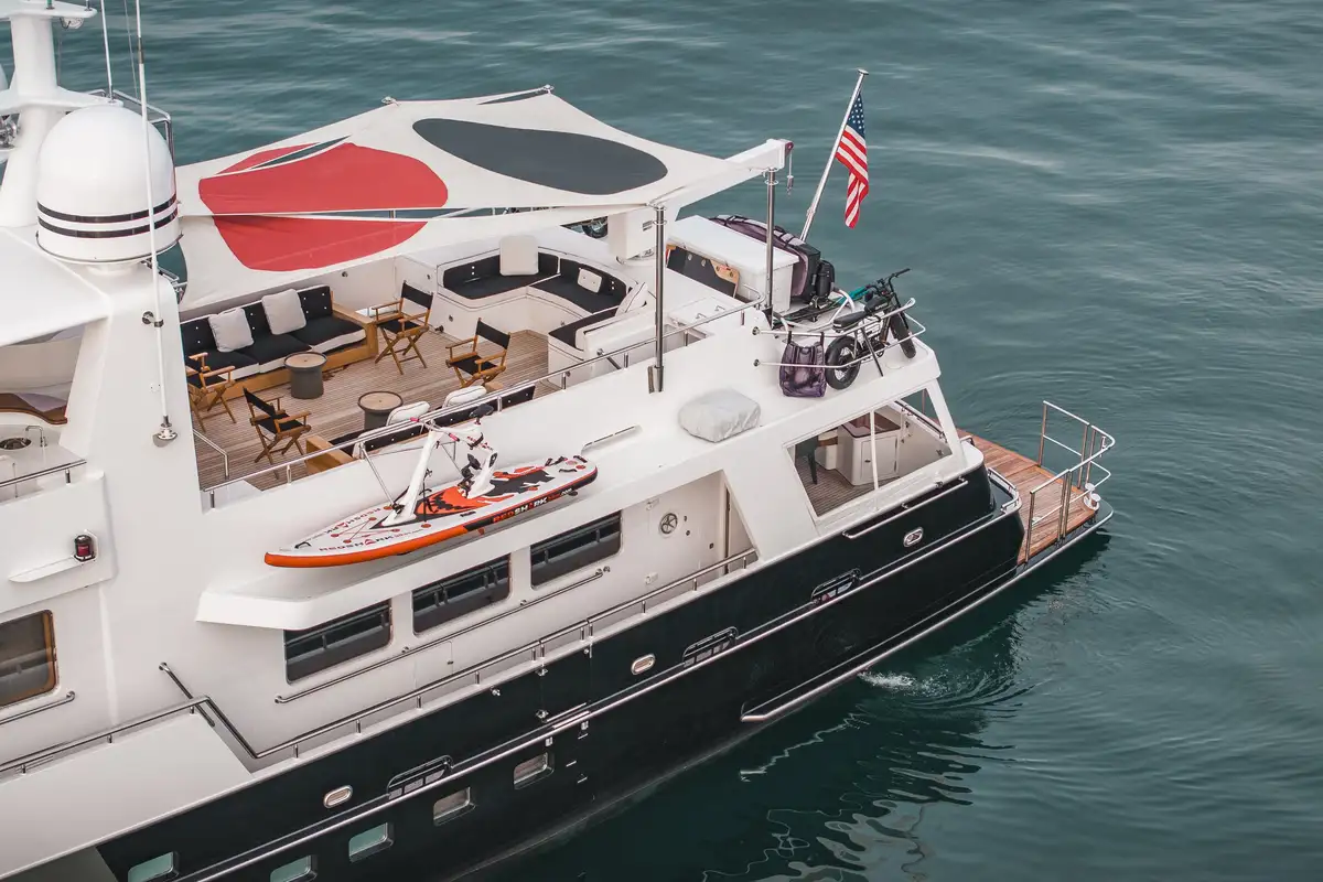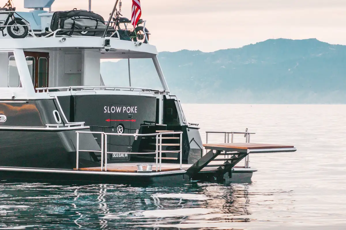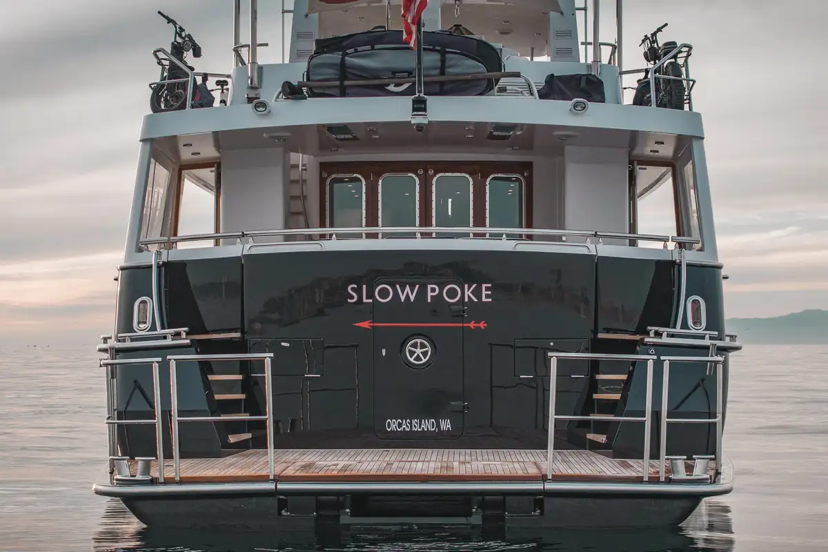 The enlarged aft swim platform—with hydraulic steps, heated outdoor shower, and tender landing—provides direct and seamless access to the water. Whether you're launching watersports, enjoying a morning coffee on the aft deck, or soaking in the views from the flybridge, SLOW POKE delivers the ultimate indoor-outdoor lifestyle for serious explorers.