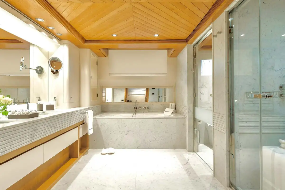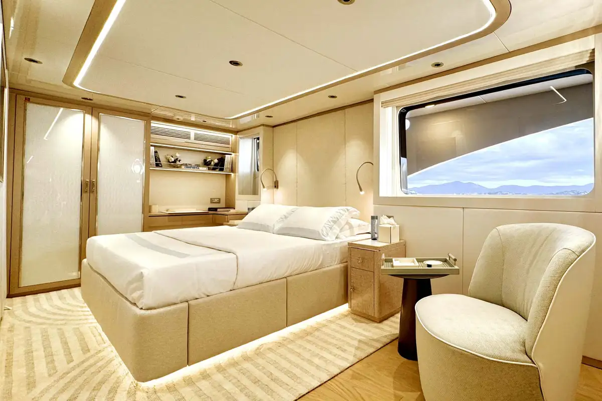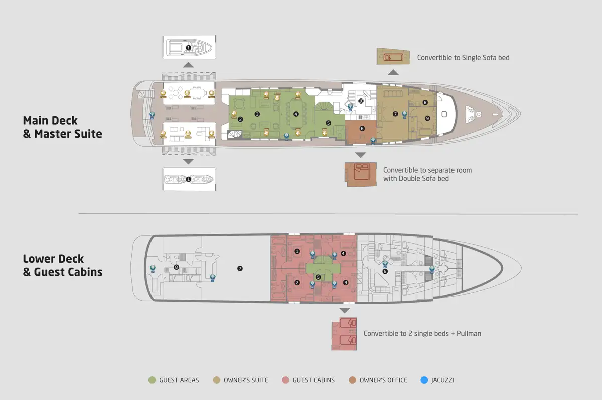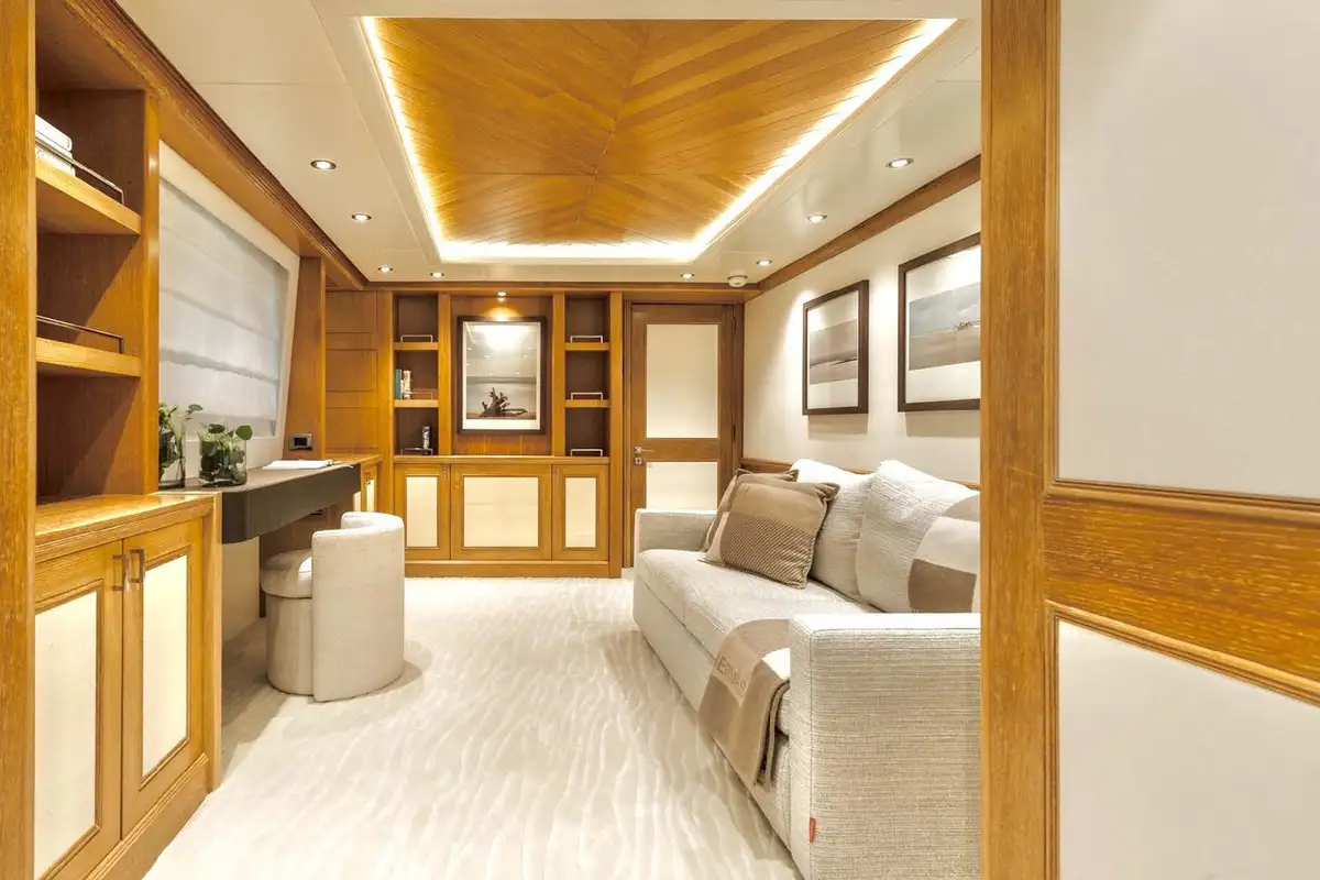 The owner's suite is forward on the main deck. Entry is via a private office which can be converted in a double cabin, the bedroom is full beam and forward is a dressing room and bathroom with bath, shower and sauna. The Master cabin also has an option for a convertible sofa/single bed. Two double suites with King size beds. There are also one convertible double/twin suite and one twin suite, both with an additional berth. The upper deck lounge can be converted in a cabin for 4 guest with a convertible bed (1 double and 2 singles) to complete accommodation for 19 guests in seven cabins. She also sleeps up to 12 crew in 8 cabins (4 singles).