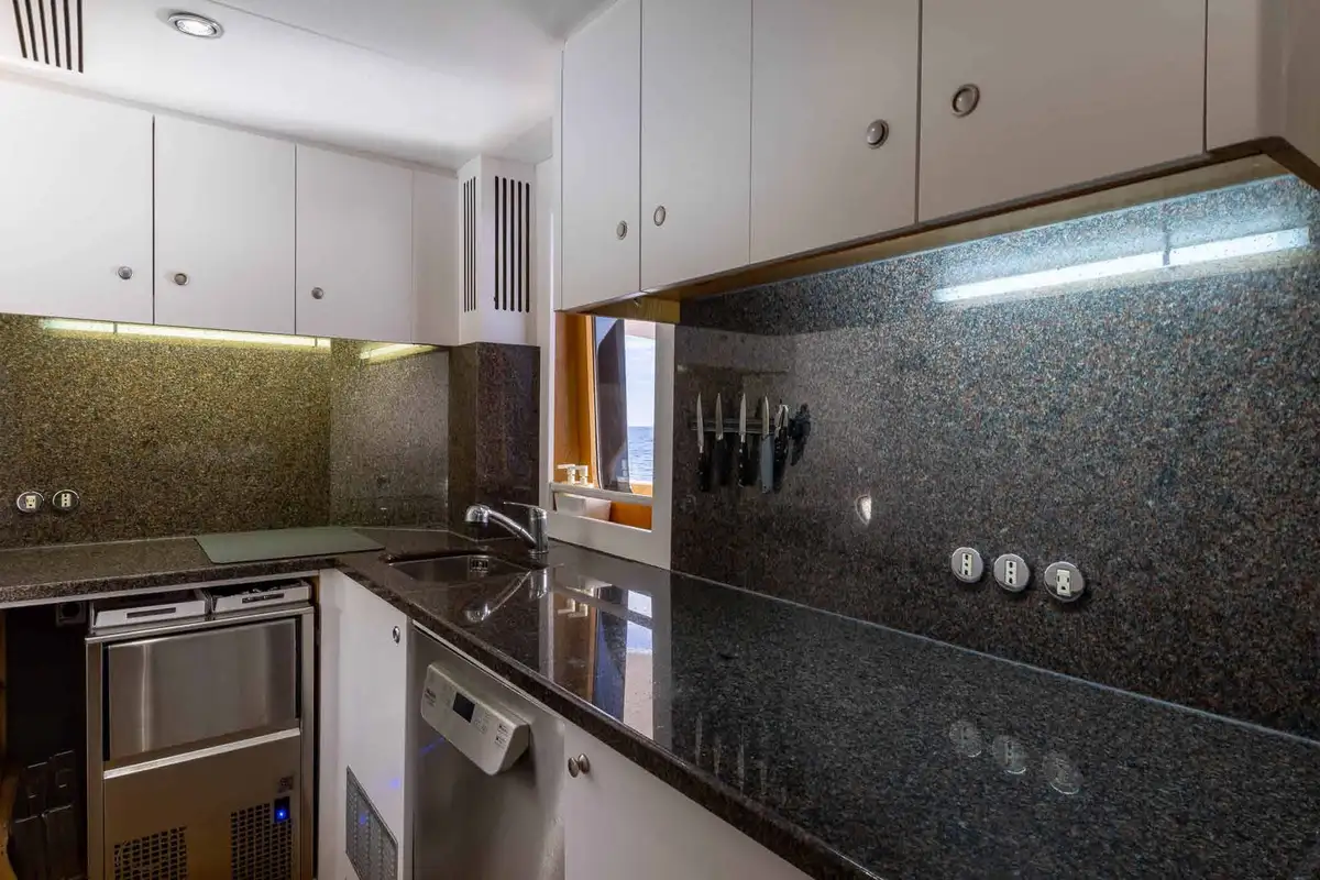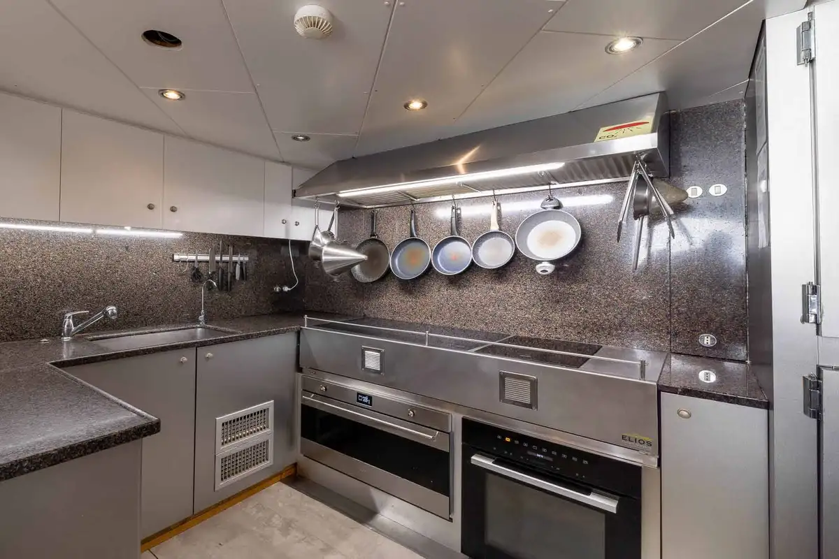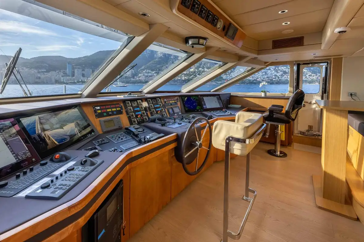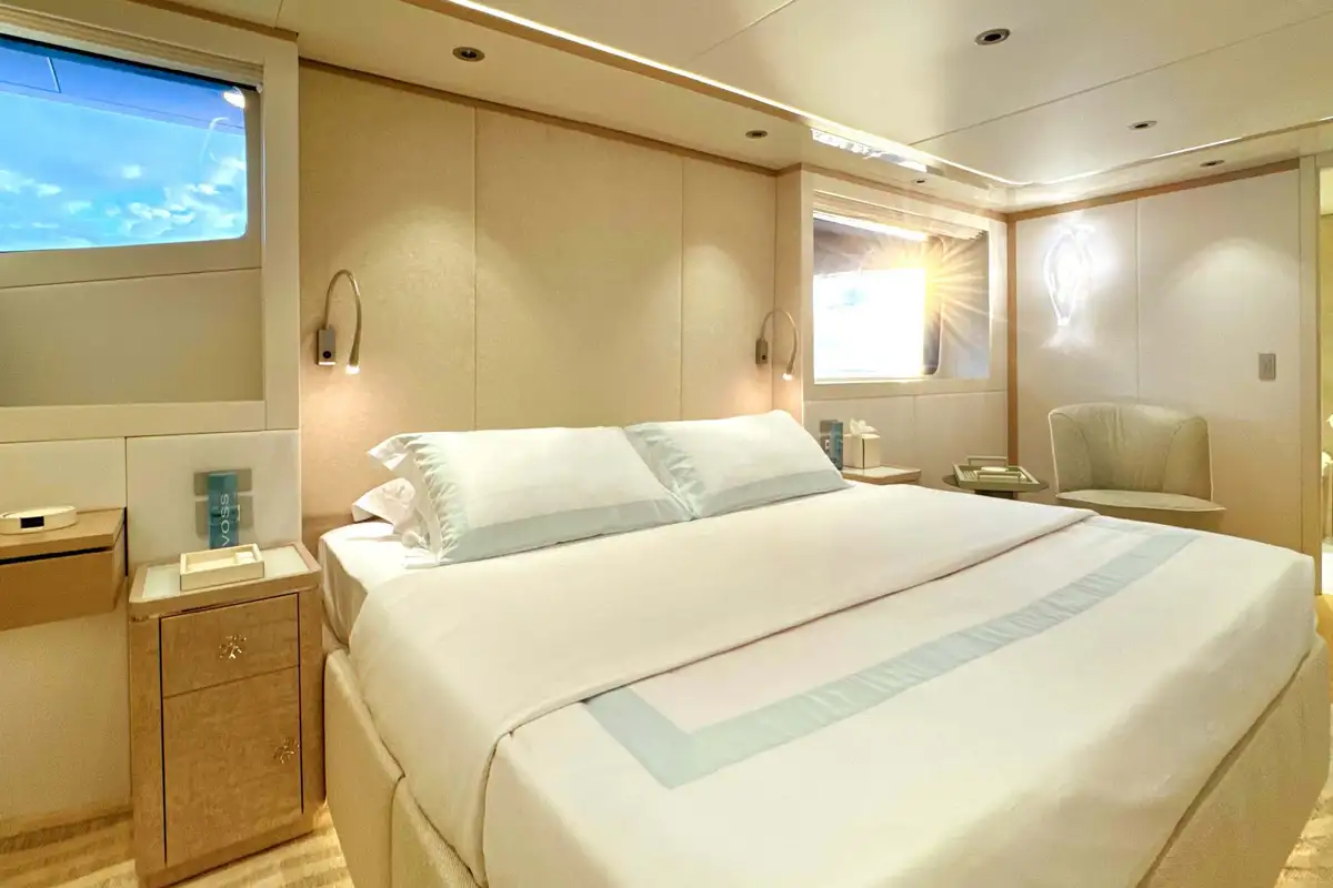 The owner's suite is forward on the main deck. Entry is via a private office which can be converted in a double cabin, the bedroom is full beam and forward is a dressing room and bathroom with bath, shower and sauna. The Master cabin also has an option for a convertible sofa/single bed. Two double suites with King size beds. There are also one convertible double/twin suite and one twin suite, both with an additional berth. The upper deck lounge can be converted in a cabin for 4 guest with a convertible bed (1 double and 2 singles) to complete accommodation for 19 guests in seven cabins. She also sleeps up to 12 crew in 8 cabins (4 singles).