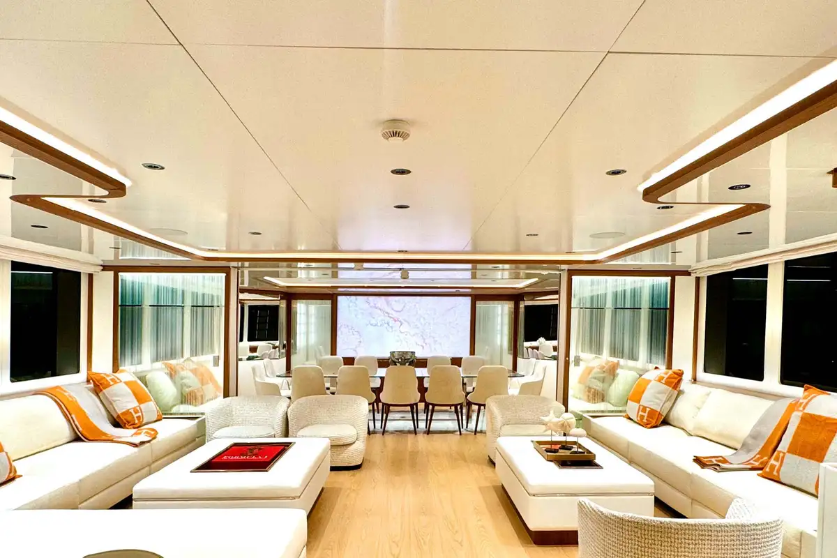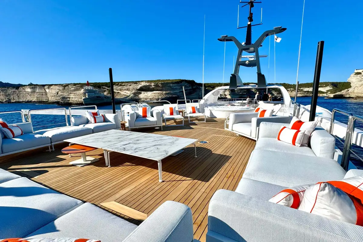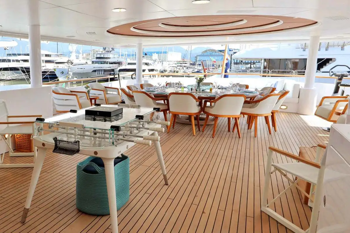 A very large split-level sun deck has a touch-and-go helipad aft, currently used for watertoy storage with deck cranes to launch them. Moving forward there is a jacuzzi and a step down to a central sunpad. There are two banks of seating either side beneath the hardtop and forward is a bar and an intimate L-shaped observation lounge.