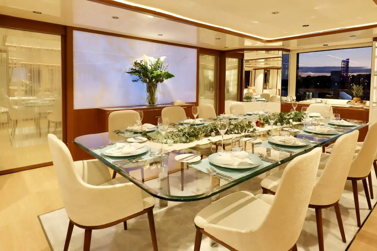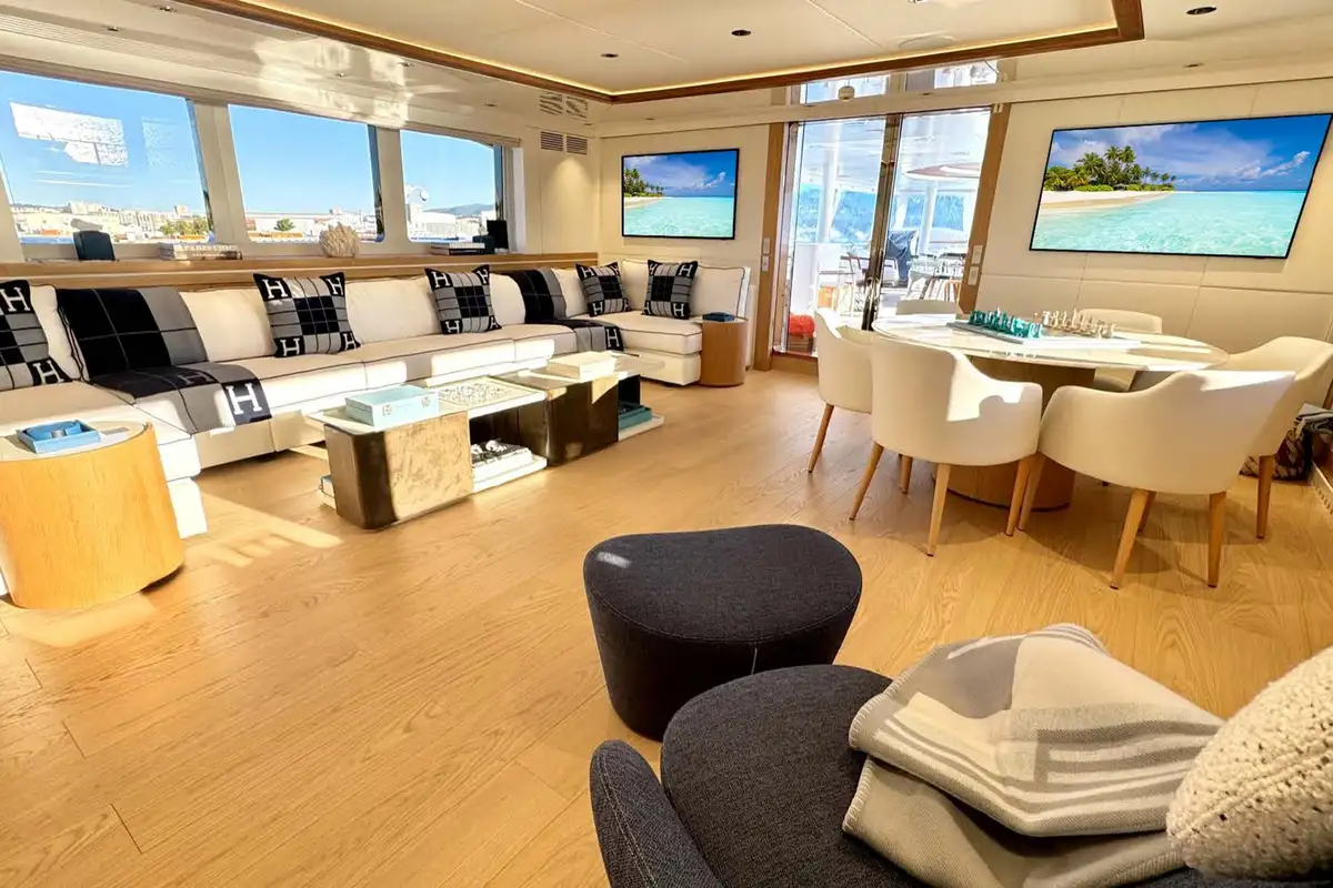 There is a formal dining area aft of the lobby that can be separated from the main saloon by sliding glass doors, and there is a pop-up TV to starboard opposite a sofa and armchair seating. A cosy sky lounge has a marquetry compass rose inlaid into the hardwood floor.